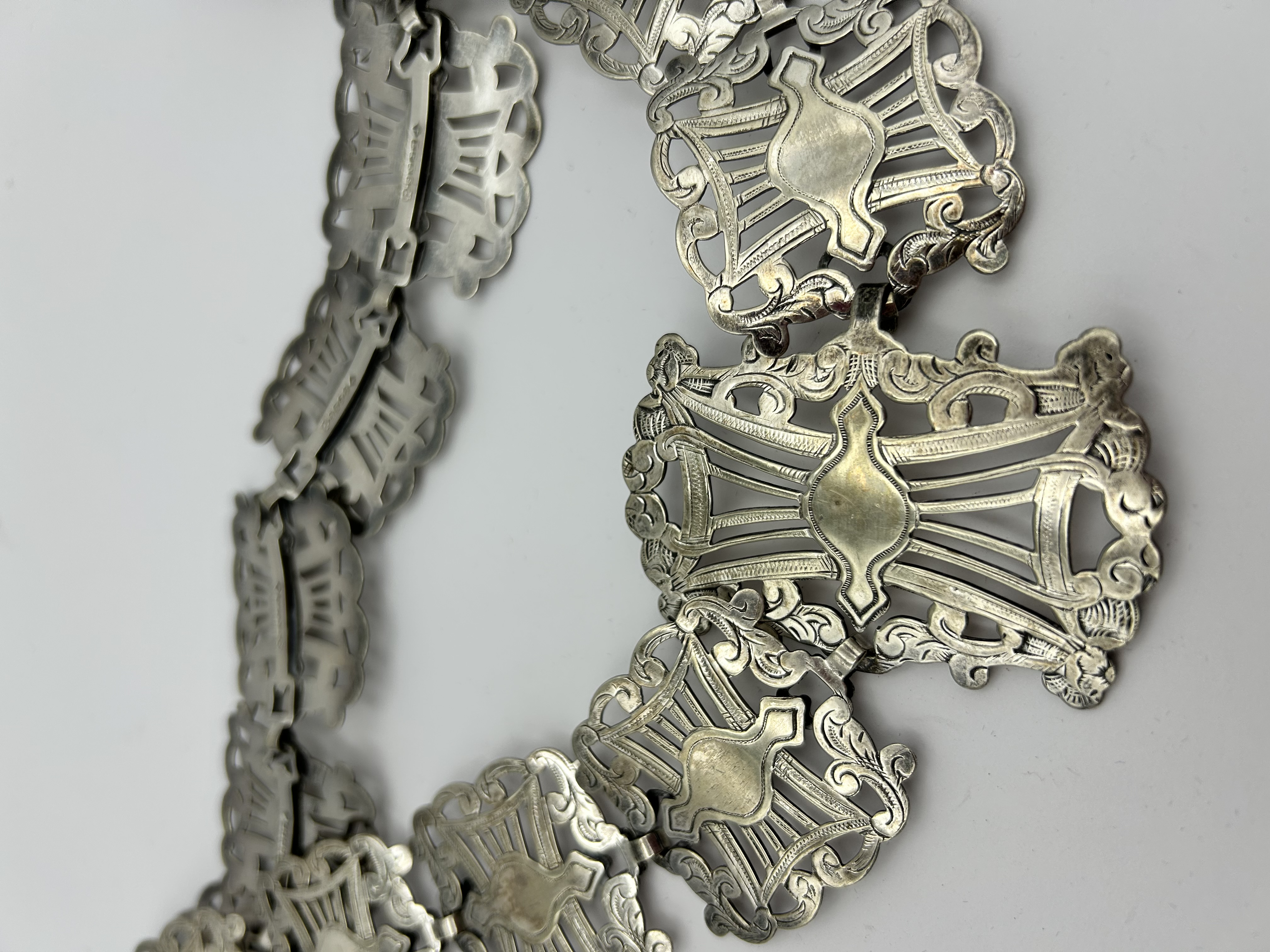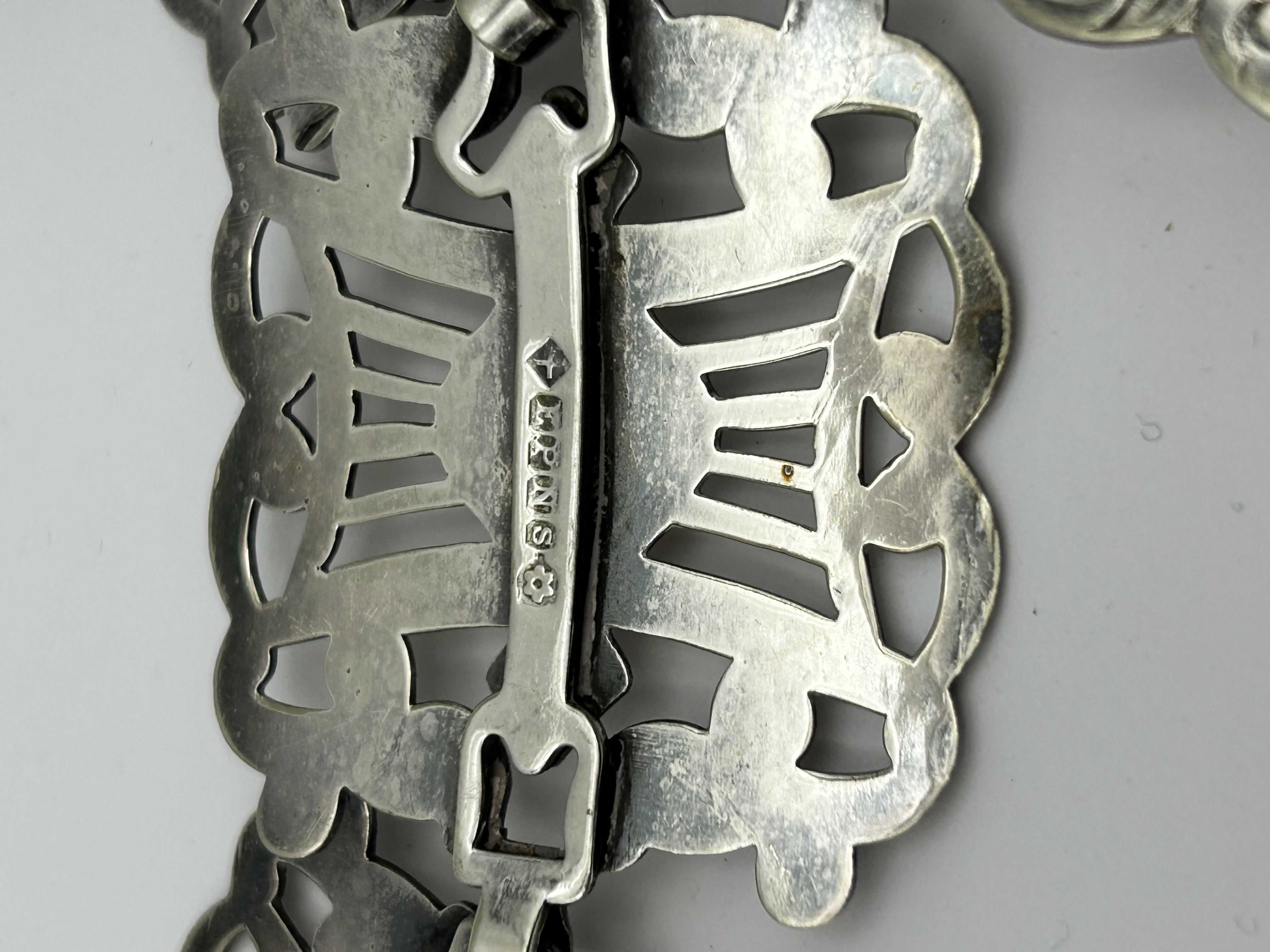 A silver-plated metal link belt dating to the late 19th or early 20th century. The piece is composed of multiple pierced, openwork links featuring scrolled foliate motifs and central shield-shaped cartouches, all interconnected by small metal loops. A larger, more elaborate central link serves as a primary decorative element. The reverse of the links bears clear marks, including the EPNS stamp for Electroplated Nickel Silver, alongside other maker or date symbols.