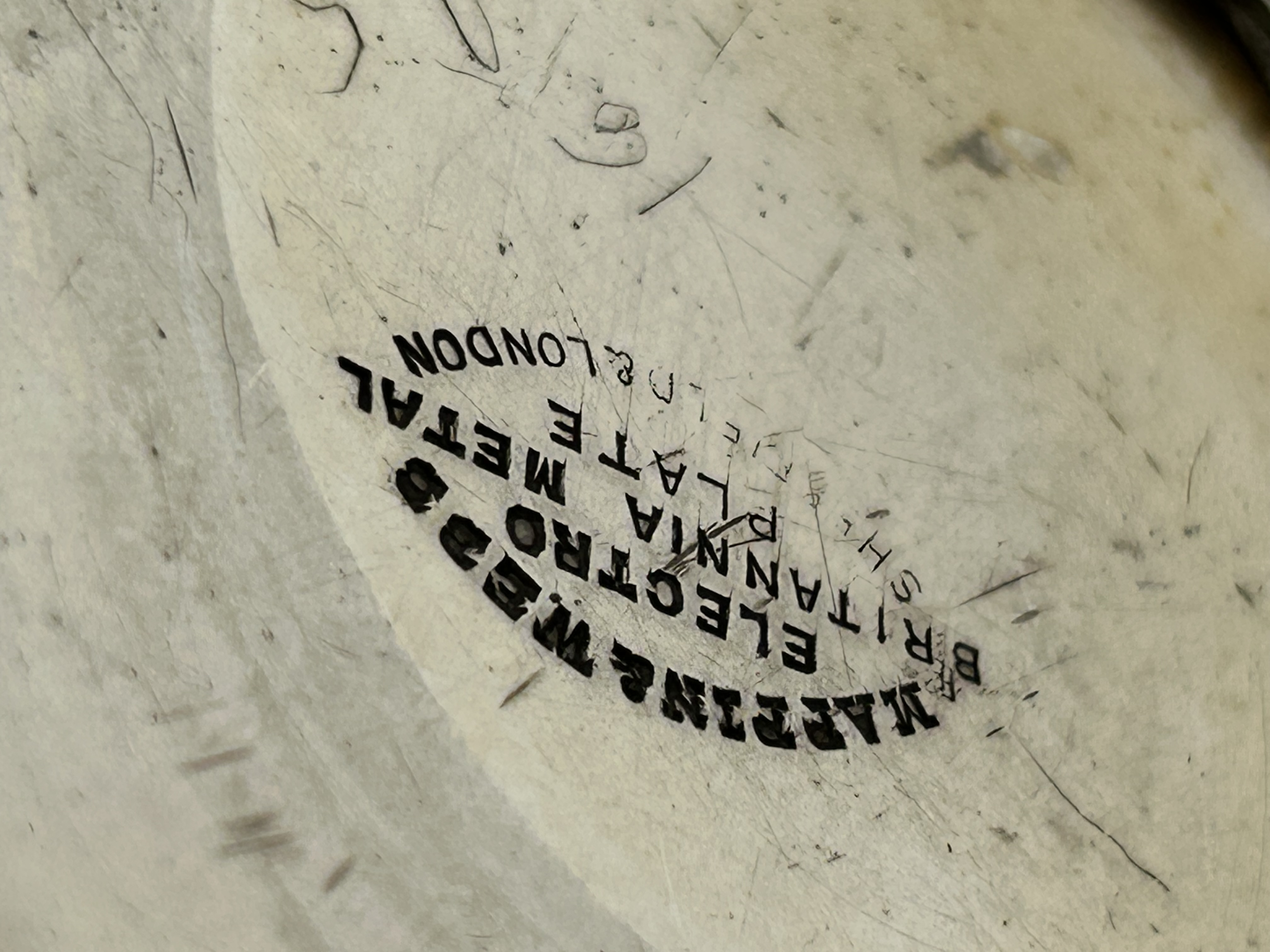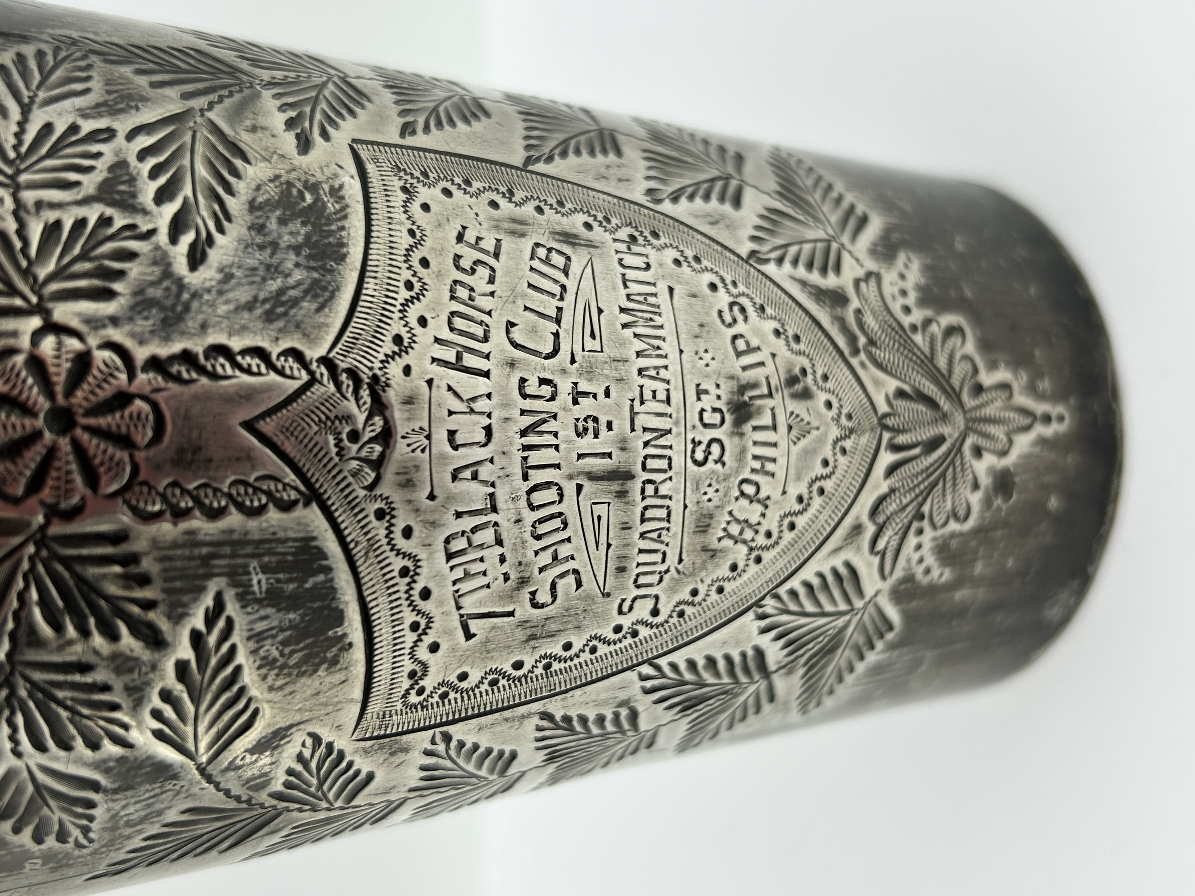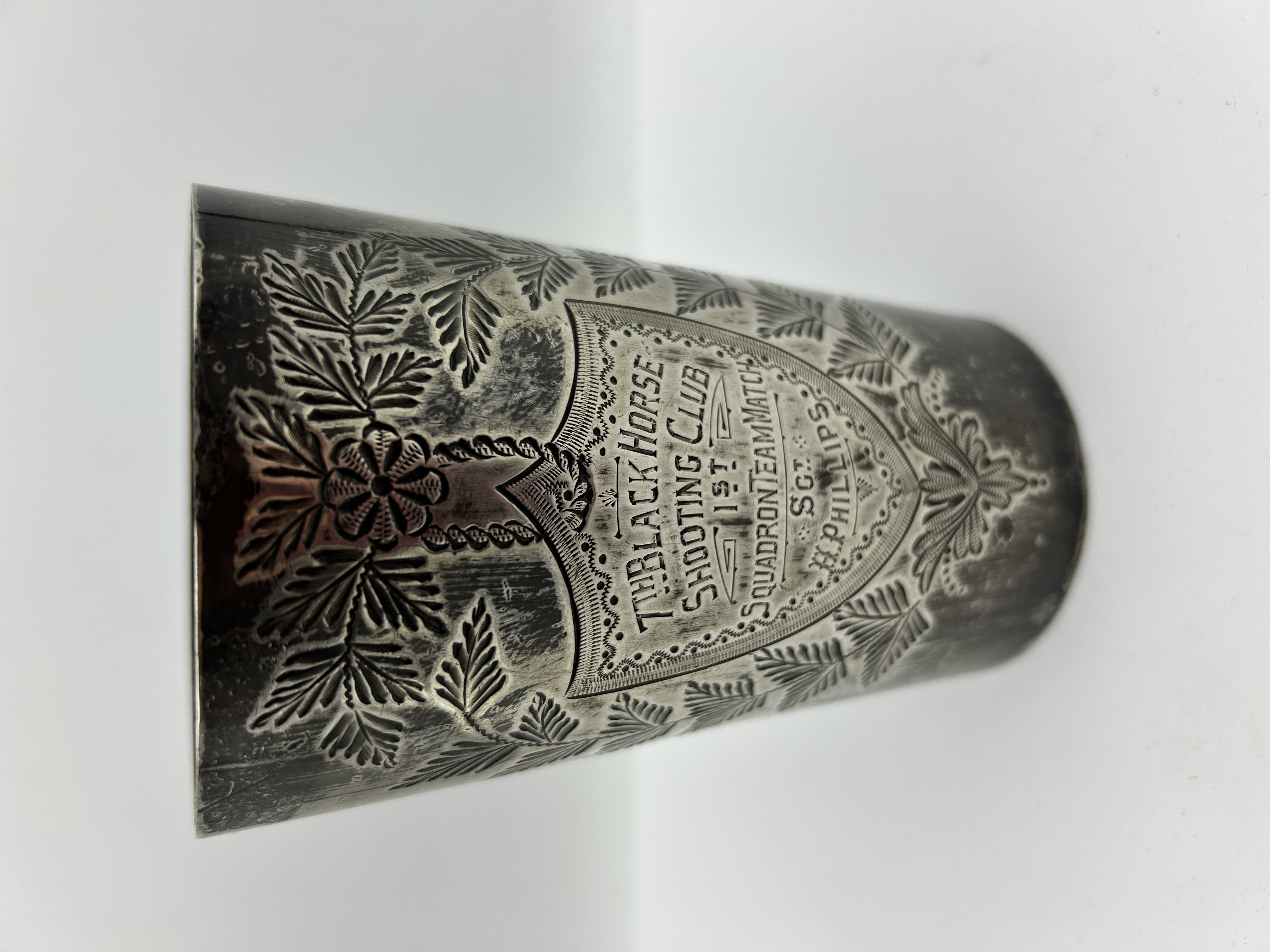 A silver-plated Britannia metal beaker produced by Mappin & Webb. The cylindrical vessel features chased and engraved decoration depicting fern leaves and floral motifs. A central shield-shaped cartouche contains the engraved inscription 7TH BLACK HORSE SHOOTING CLUB 1ST SQUADRON TEAM MATCH SGT. H. PHILLIPS. The underside is stamped with the maker mark MAPPIN & WEBB’S ELECTRO BRITANNIA METAL PLATE SHEFFIELD & LONDON along with hand-incised numerals.