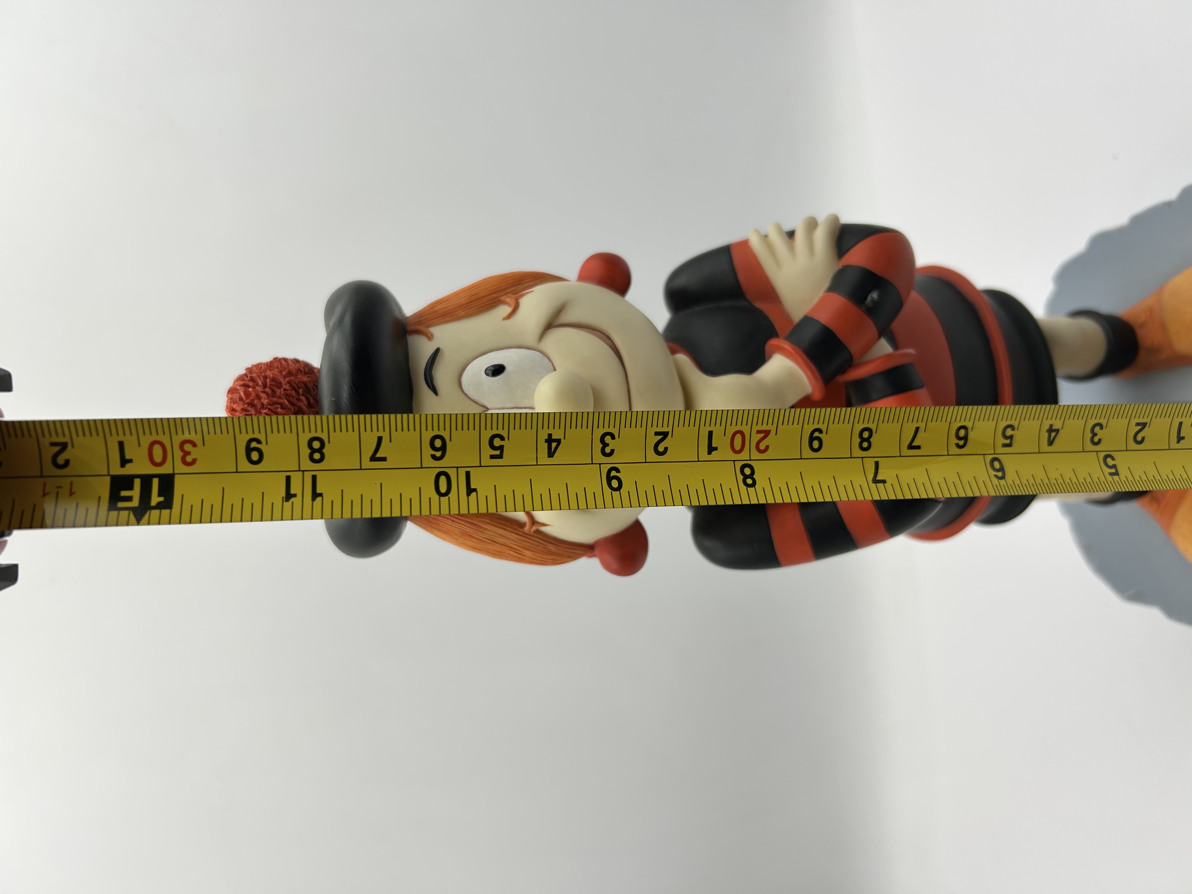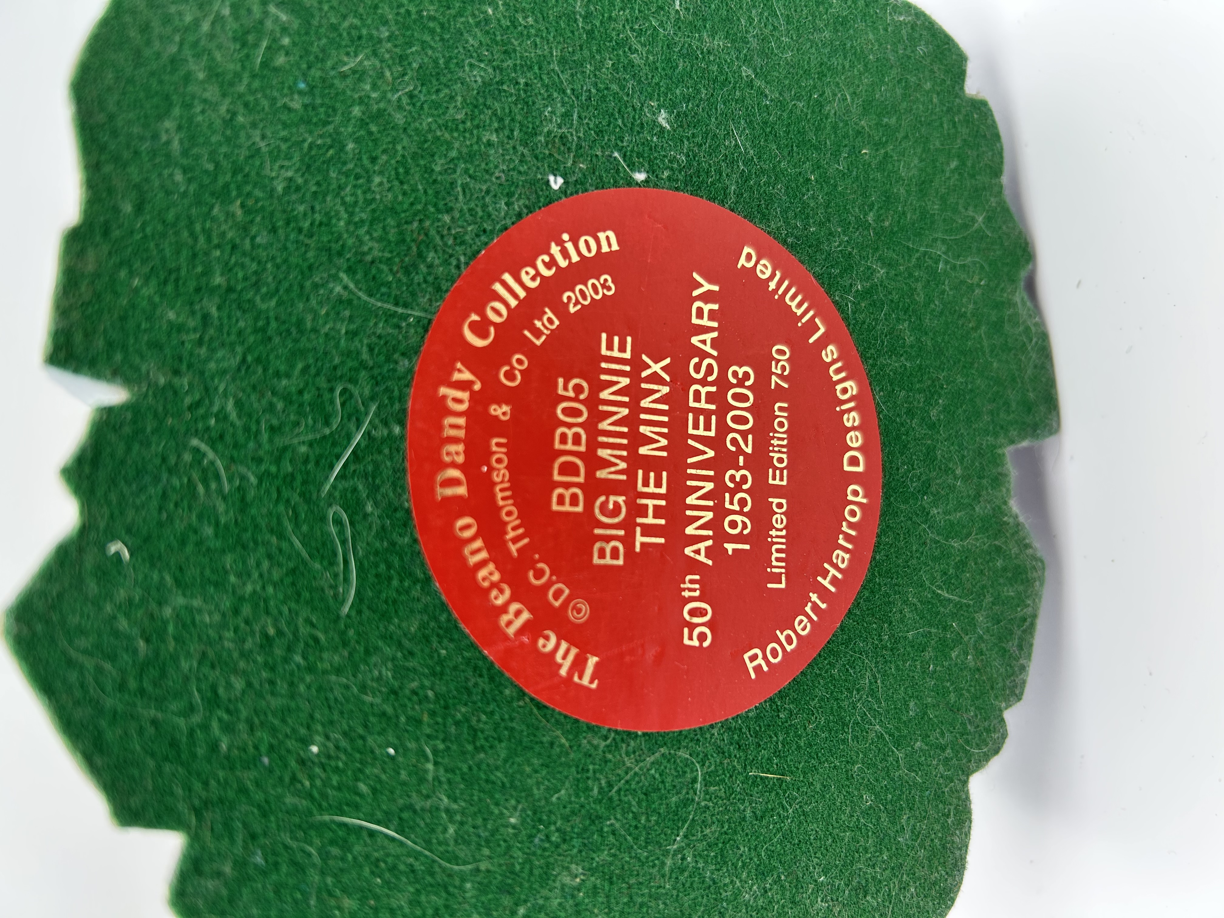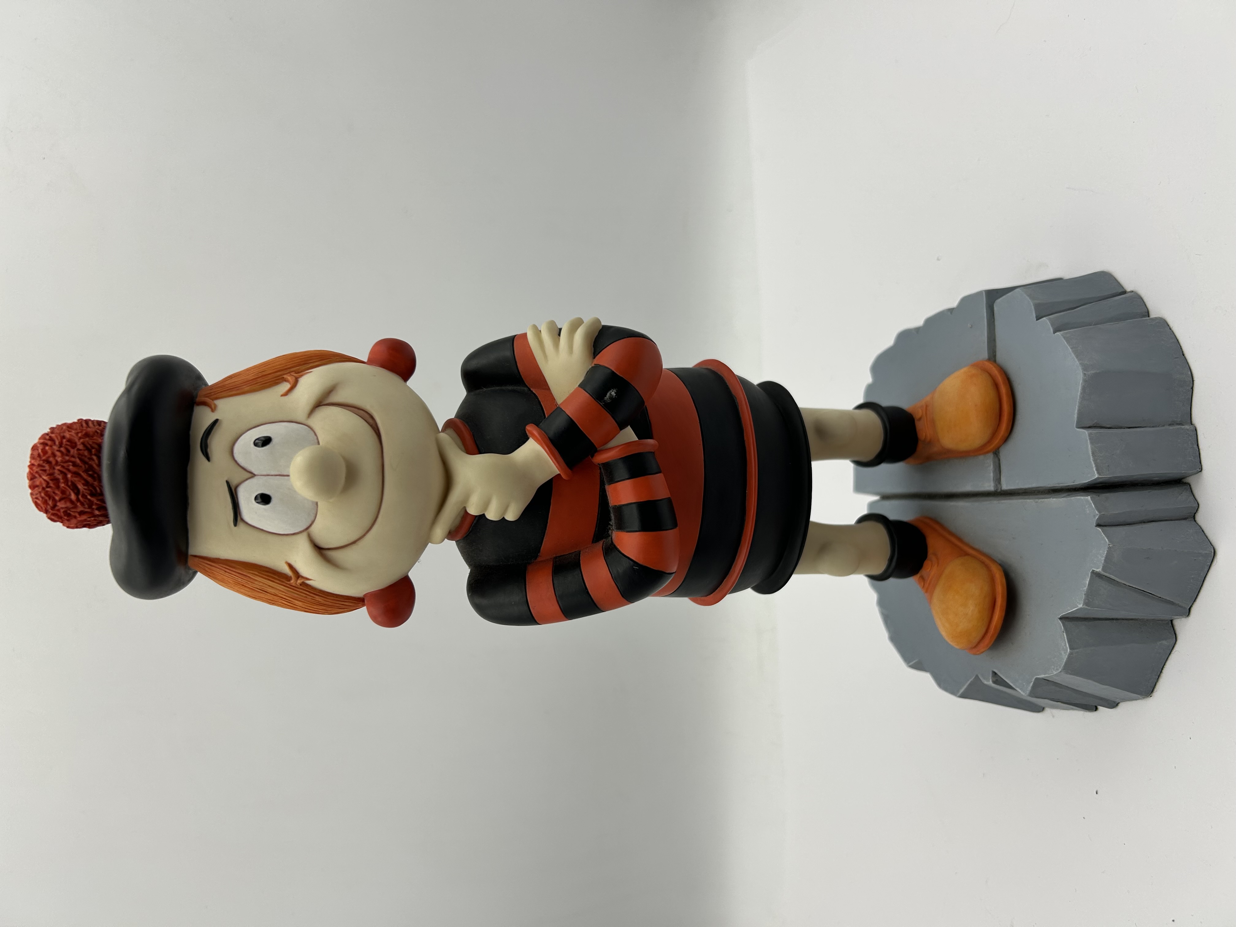 This Robert Harrop Designs Limited figurine depicts the character Minnie the Minx and is part of The Beano Dandy Collection. This limited edition piece, numbered BDB05, was produced in 2003 to commemorate the character’s 50th anniversary from 1953 to 2003 and is one of 750 produced. The figure is constructed of painted cast resin and shows Minnie in her signature red and black striped sweater, black skirt, and beret with a red pom-pom, standing with arms crossed on a gray rock-style base. The underside of the base is covered in green felt and bears a red manufacturer label with copyright and edition details.