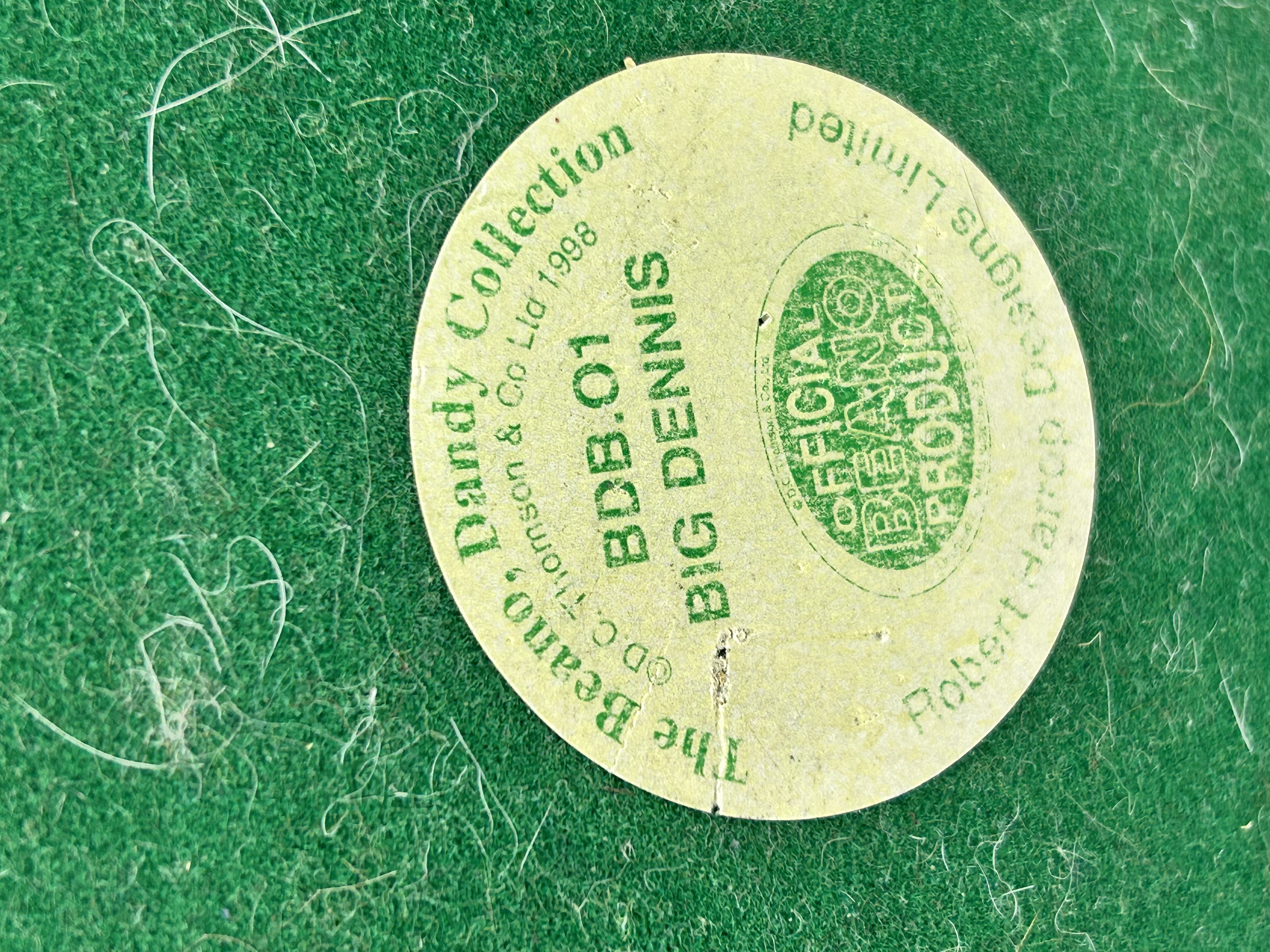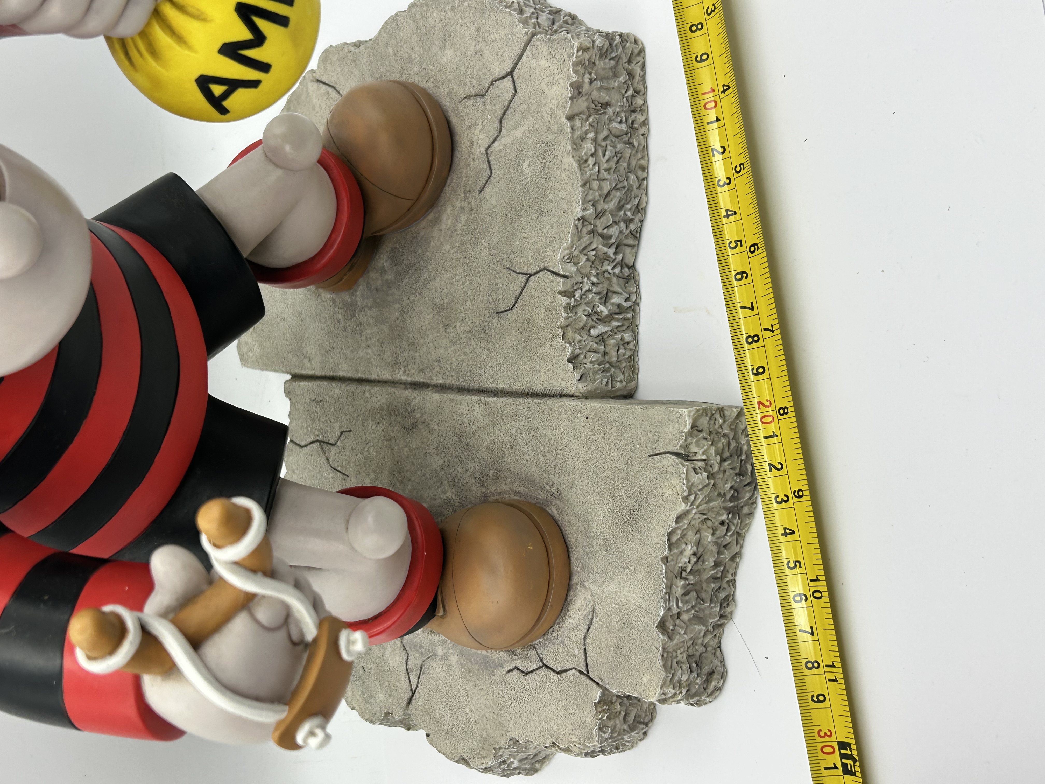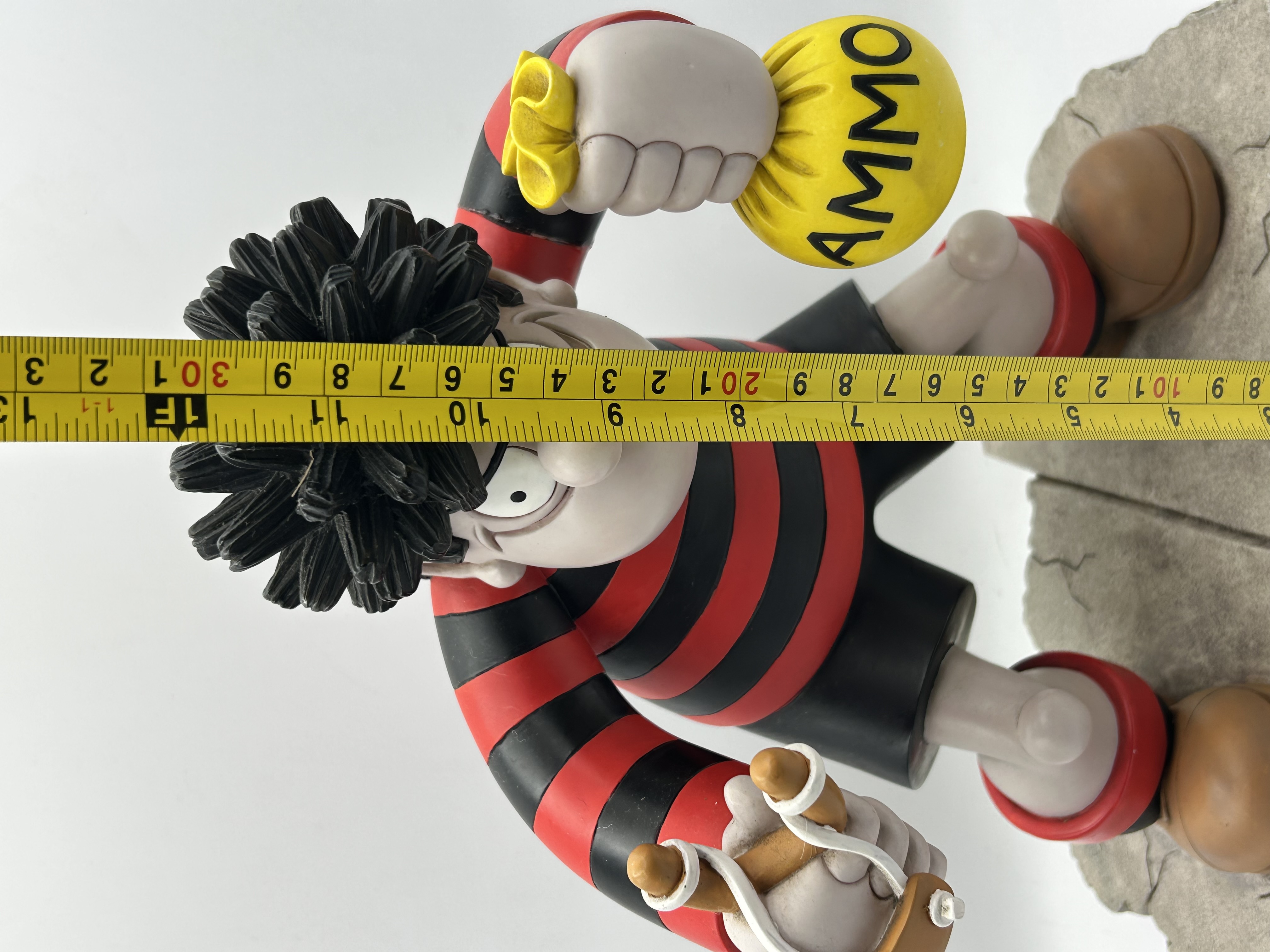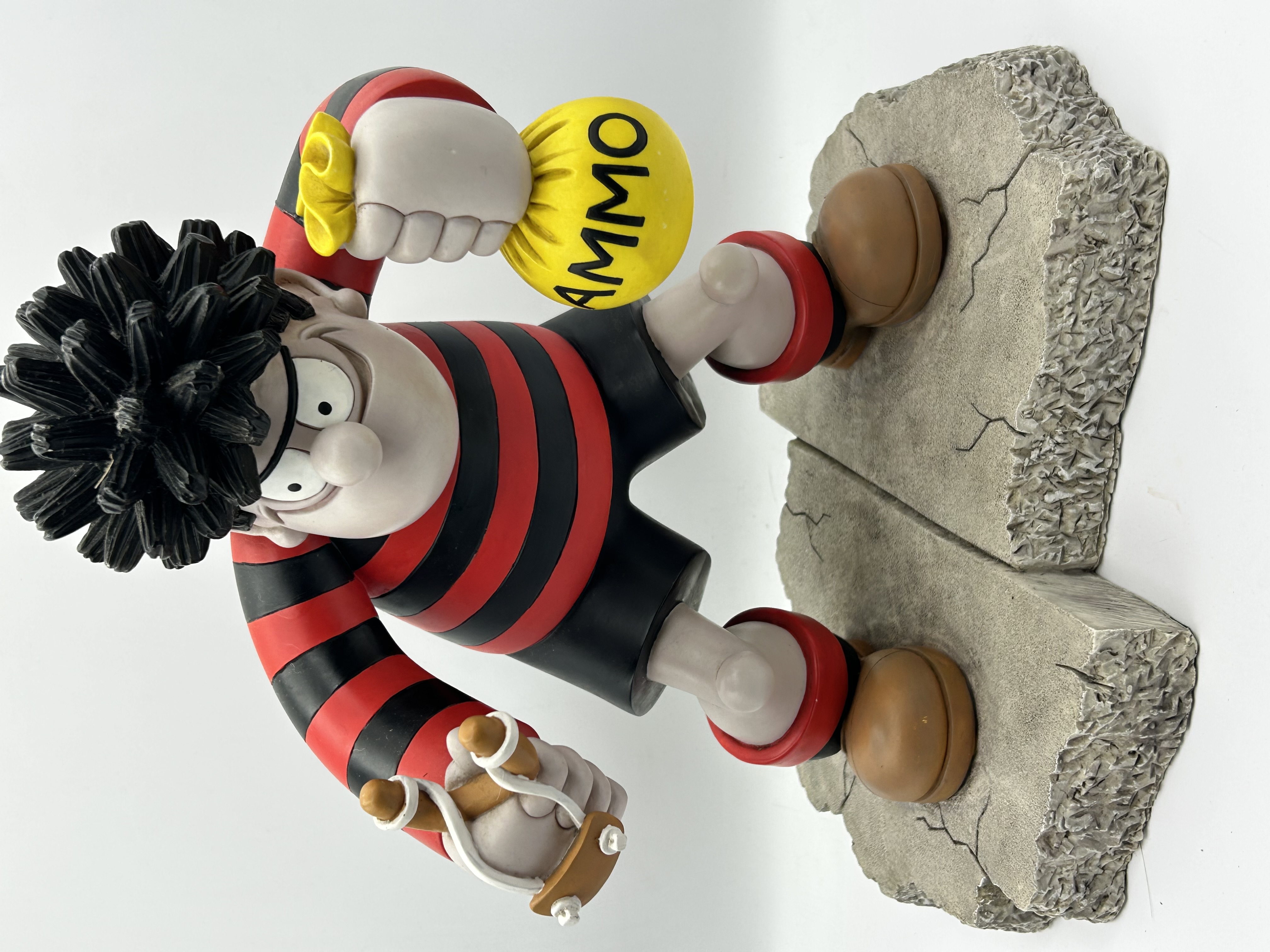 A large painted figurine of the character Dennis the Menace from The Beano comics, produced by Robert Harrop Designs as part of The Beano, Dandy Collection. The figure is depicted wearing a red and black striped sweater and black shorts, holding a wooden-style slingshot and a yellow bag labeled AMMO. The piece stands on a two-part textured base designed to resemble cracked pavement. A circular label on the green felt underside identifies the piece as BDB.01 BIG DENNIS and an OFFICIAL BEANO PRODUCT, copyrighted by D.C. Thomson and Company Limited in 1998.