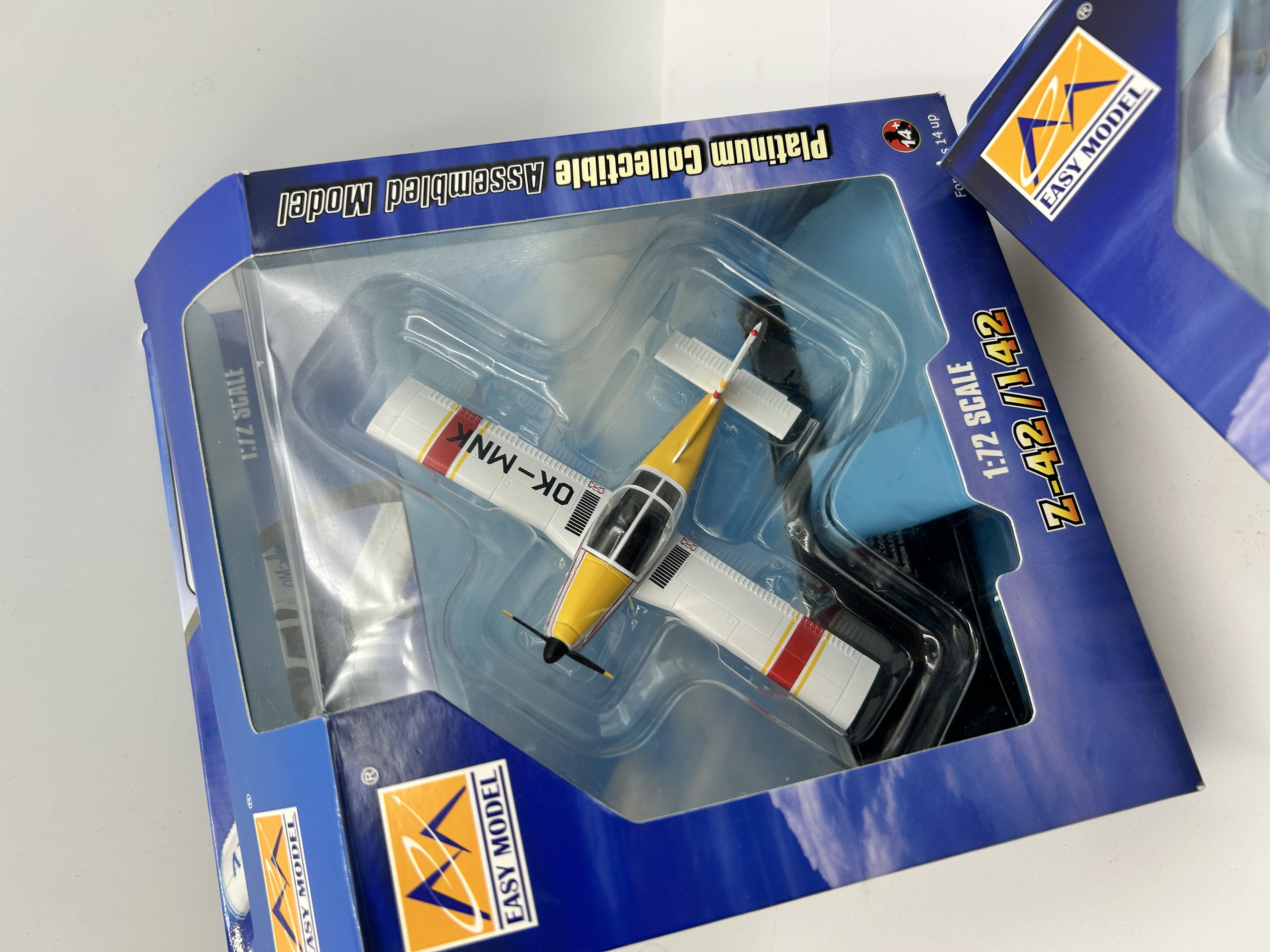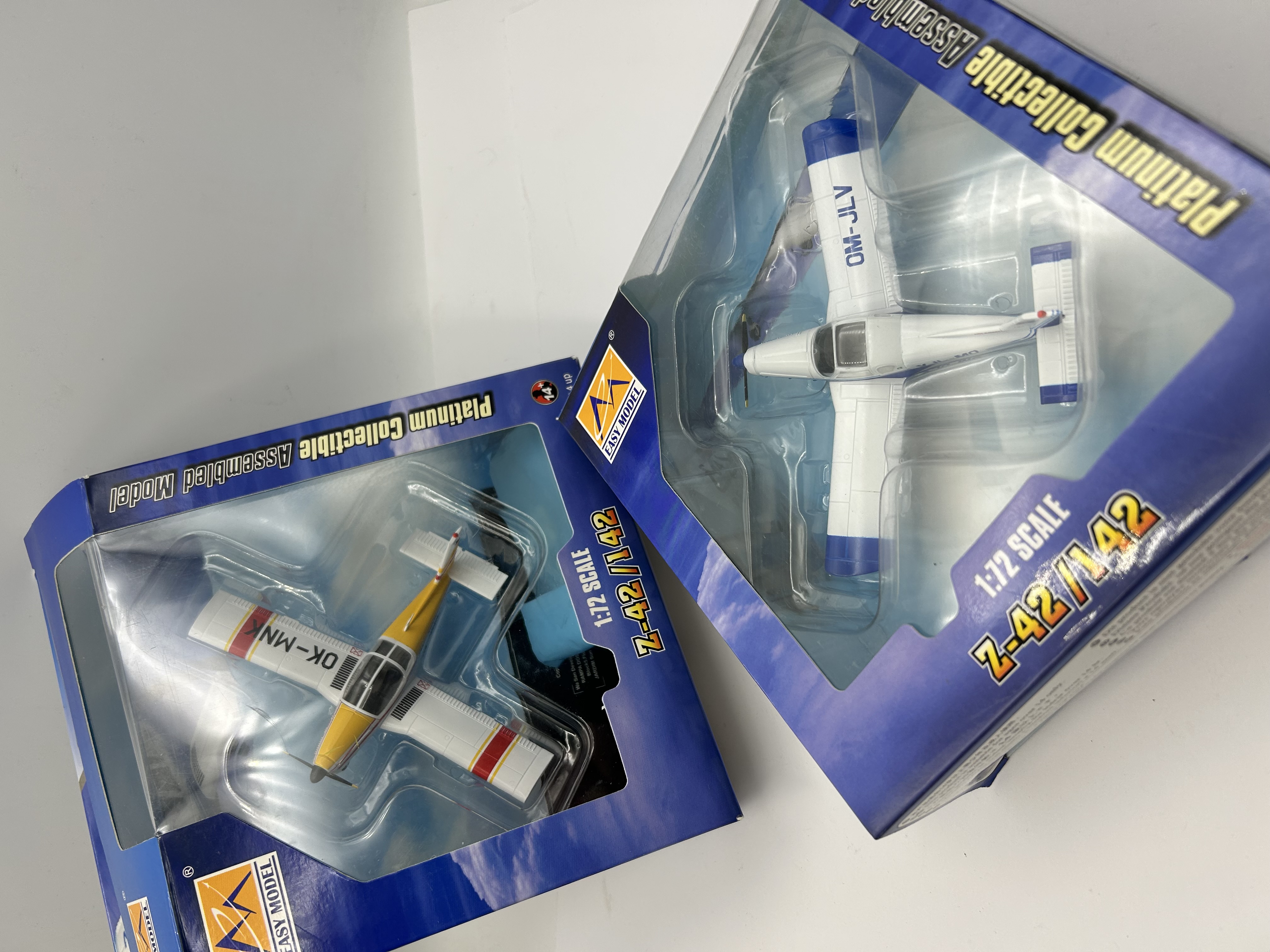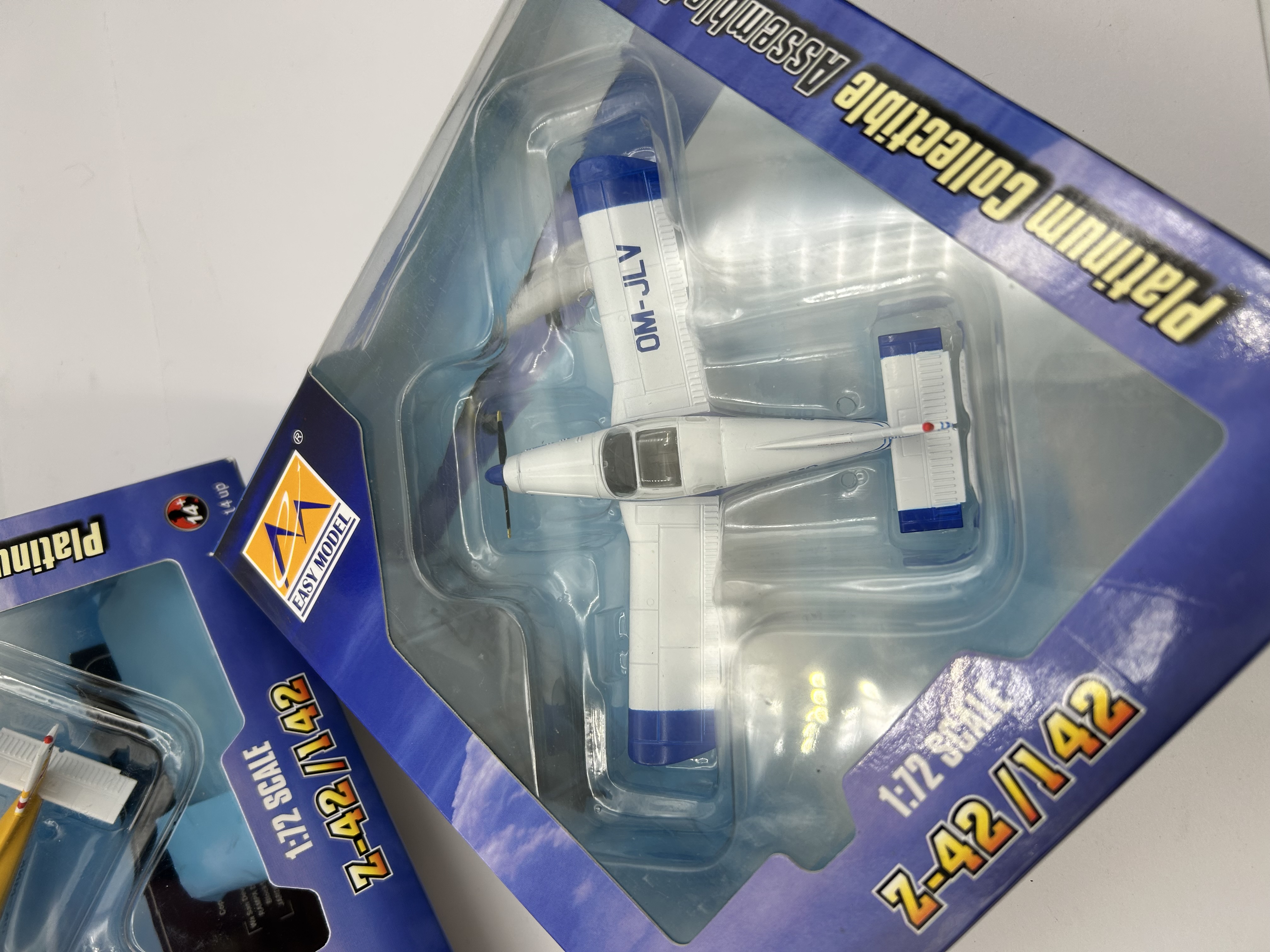 A pair of pre-assembled plastic model airplanes from the Easy Model Platinum Collectible series. Both models represent the Zlin Z-42/142 aircraft design in 1:72 scale. The first model features a white fuselage with blue wingtips and tail accents, bearing the registration OM-JLV. The second model is finished in white with yellow and red markings, bearing the registration OK-MNK. Each item is housed in its original blue and yellow window-box packaging with clear plastic inserts.