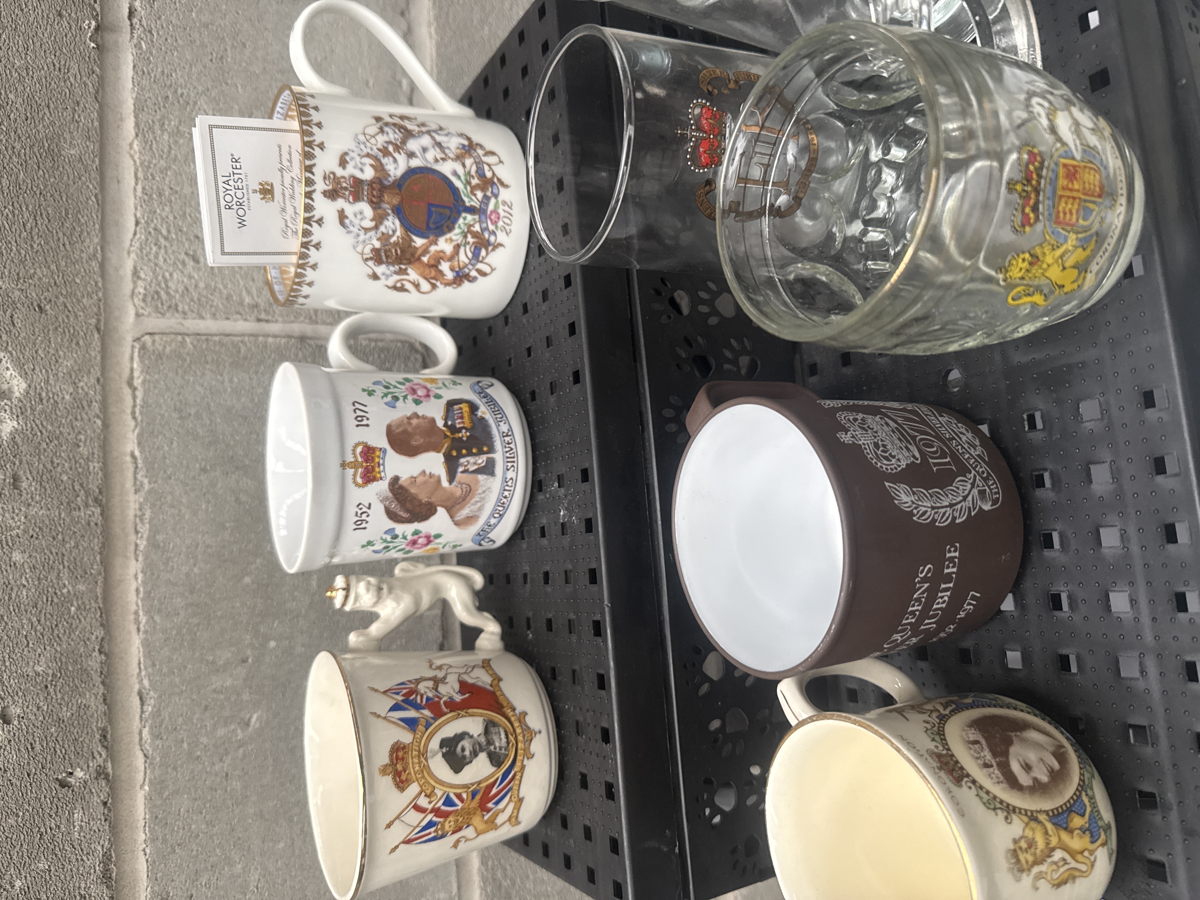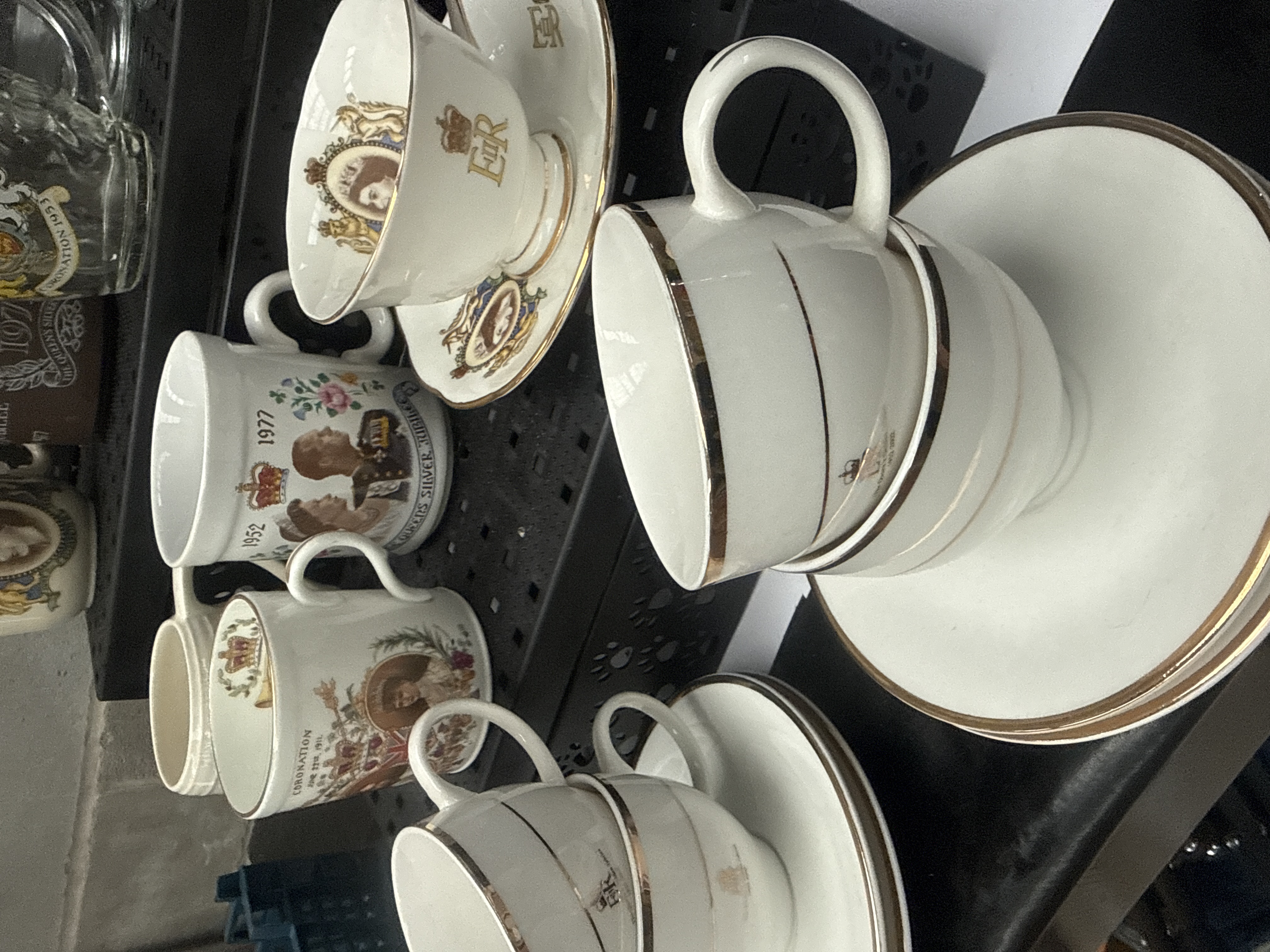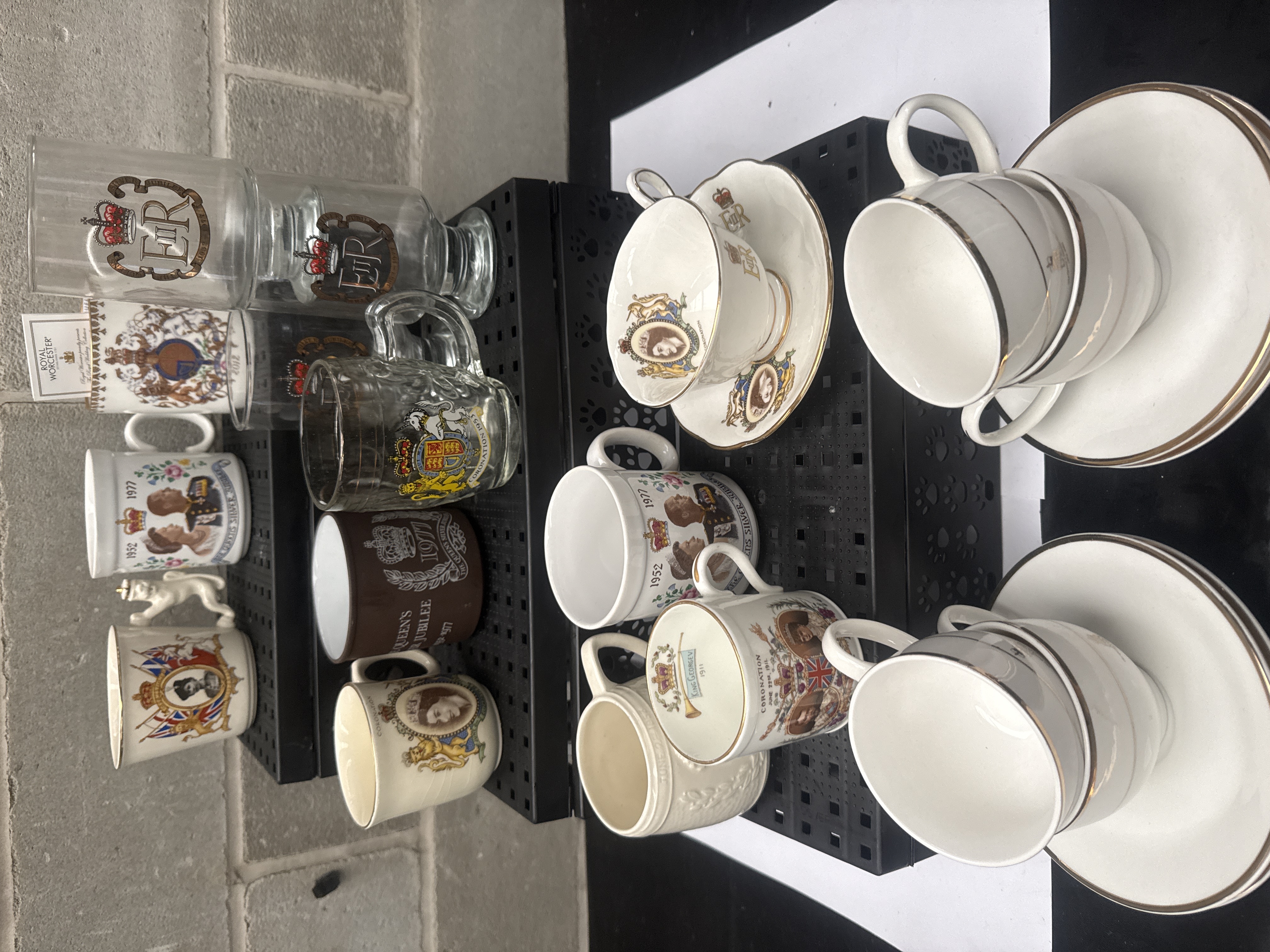 A group of 22 items celebrating various British Royal milestones, including the 1911 Coronation of King George V, the 1953 Coronation, the 1977 Silver Jubilee, and the 2012 Diamond Jubilee of Queen Elizabeth II, as well as pieces related to King George VI. The lot comprises white-glazed bone china, earthenware, and clear glass. Decorative elements include transfer-printed portraits, royal crests, and EIIR monograms, many finished with gold-gilt rims. Notable items include a mug featuring a molded figural lion handle, a Royal Worcester mug with its original paper insert, and an assortment of teacups, saucers, and drinking glasses.