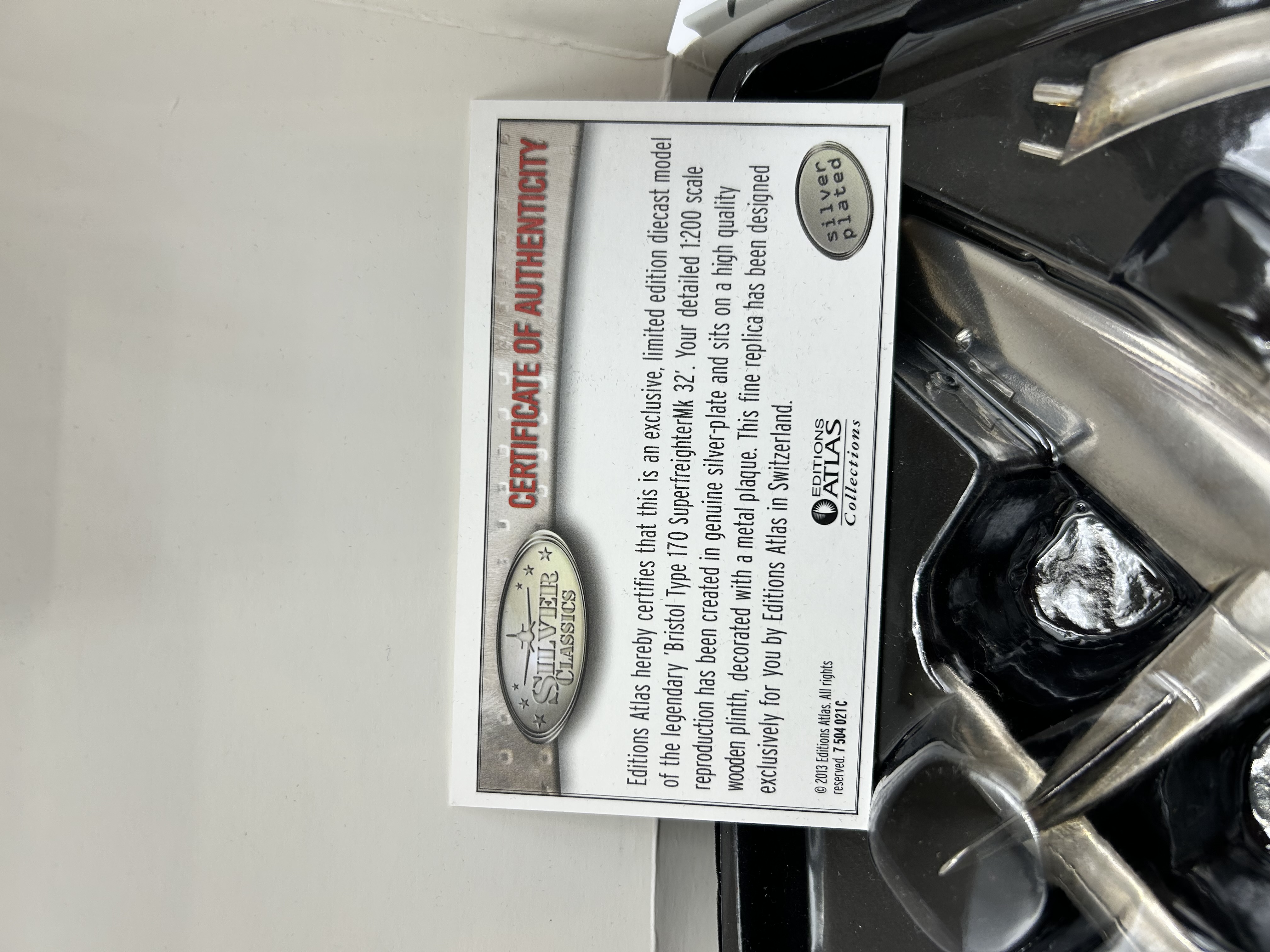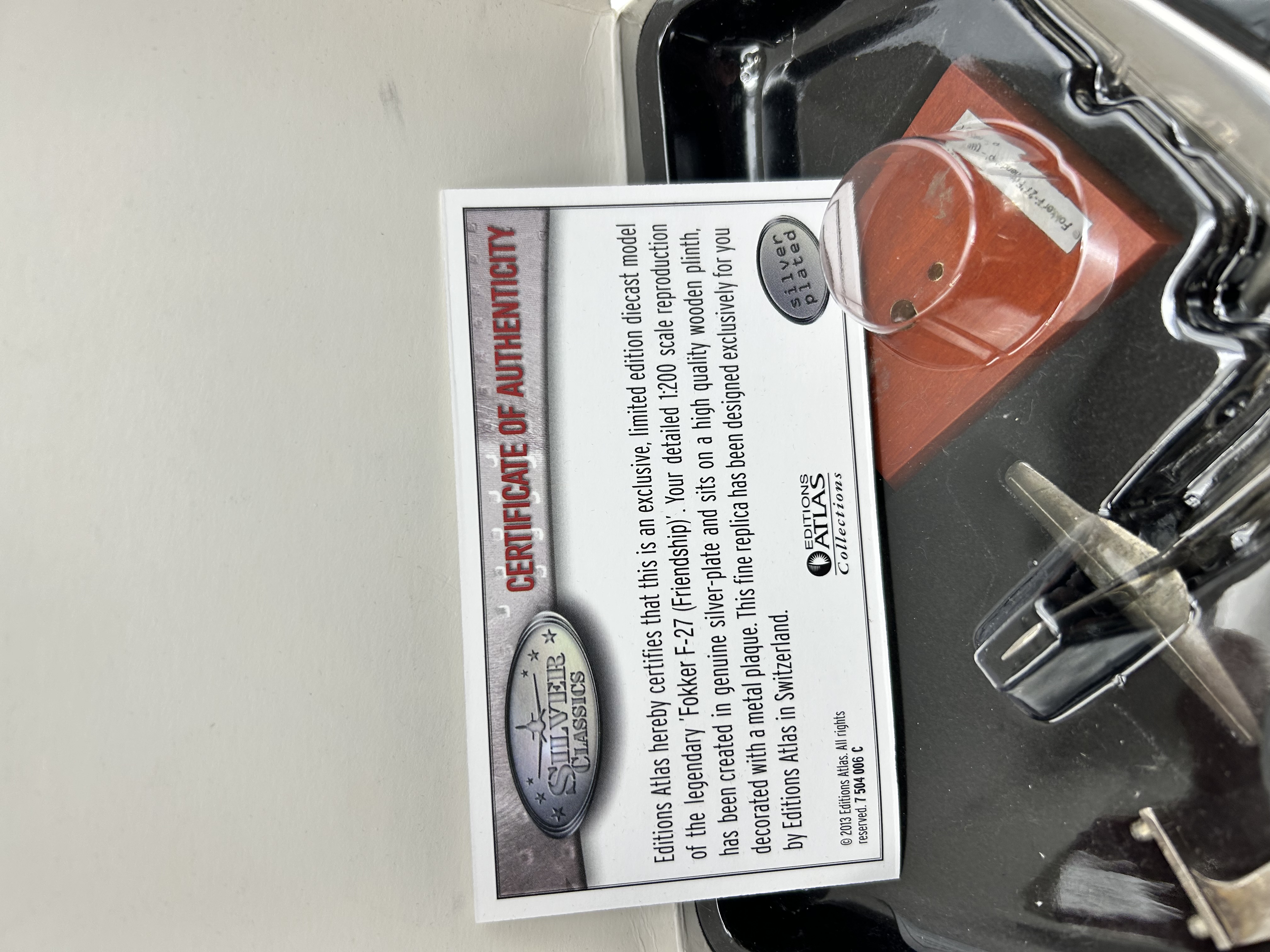 A pair of limited edition 1:200 scale diecast model aircraft from the Silver Classics collection by Editions Atlas Collections. The group consists of a Fokker F-27 Friendship and a Bristol Type 170 Superfreighter Mk 32. Each model is constructed from diecast metal with a genuine silver-plated finish. Both aircraft are accompanied by their respective wooden display plinths featuring metal identification plaques and individual Certificates of Authenticity. The items are housed in their original silver-toned retail display boxes with clear viewing windows and protective internal packaging.