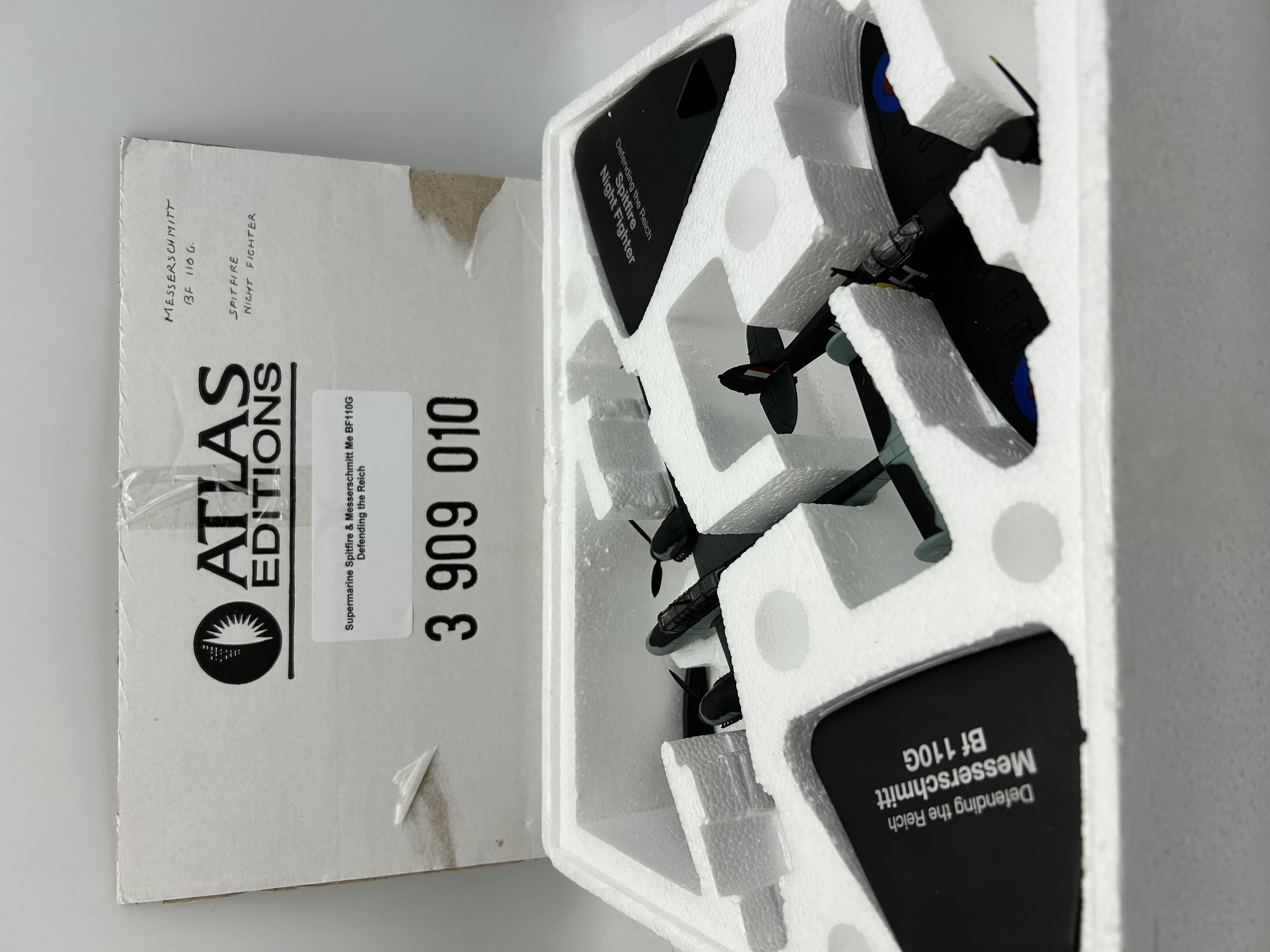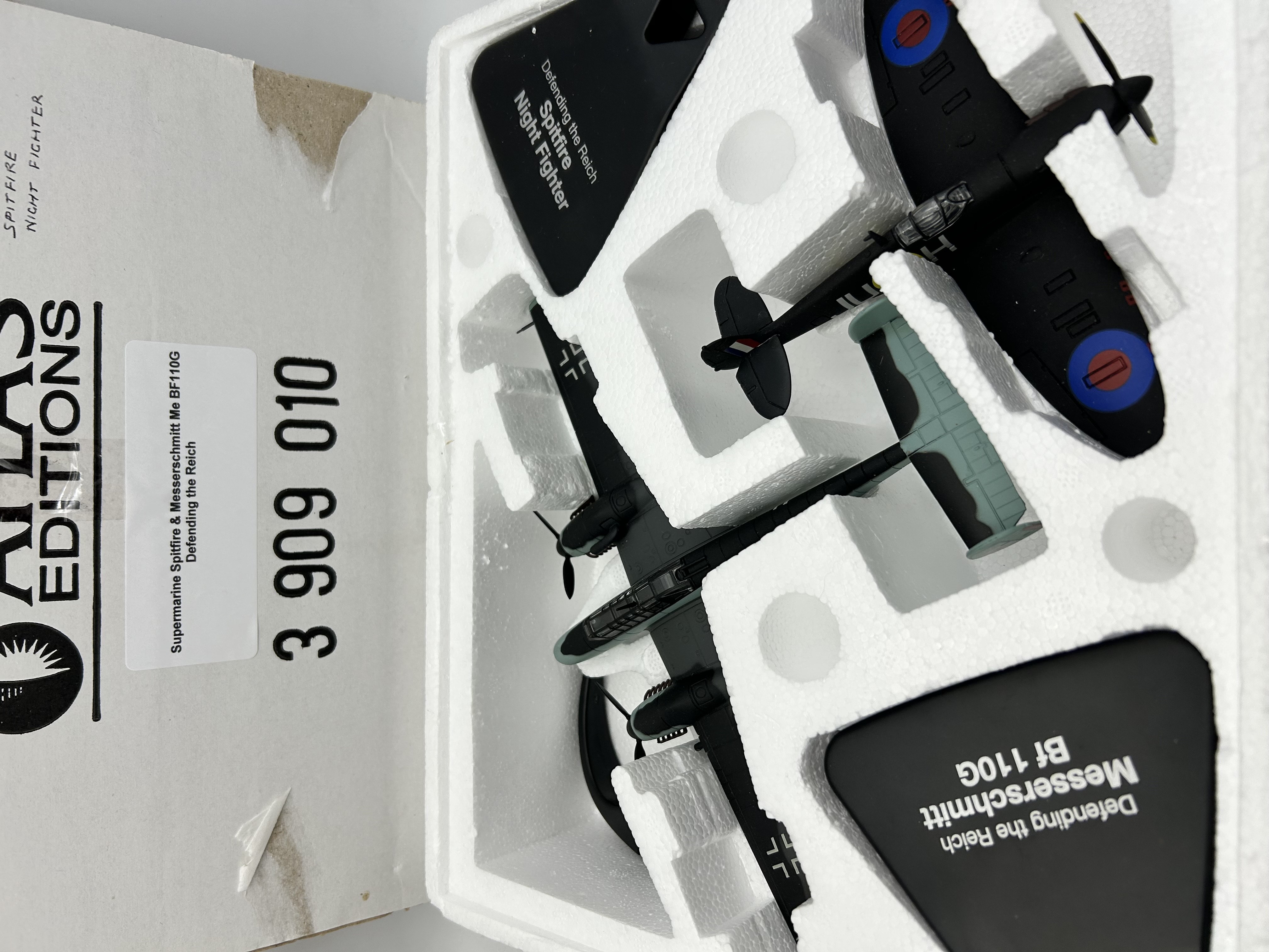 Two die-cast model aircraft from the Atlas Editions Defending the Reich series, featuring a Supermarine Spitfire Night Fighter and a Messerschmitt Bf 110G. The Spitfire model is finished in a matte black livery with Royal Air Force roundels. The Messerschmitt model features a camouflage scheme with German Luftwaffe markings. Both aircraft are accompanied by black plastic display stands with printed identification. The set is presented in its original molded polystyrene tray and branded cardboard box, identified by item number 3 909 010.