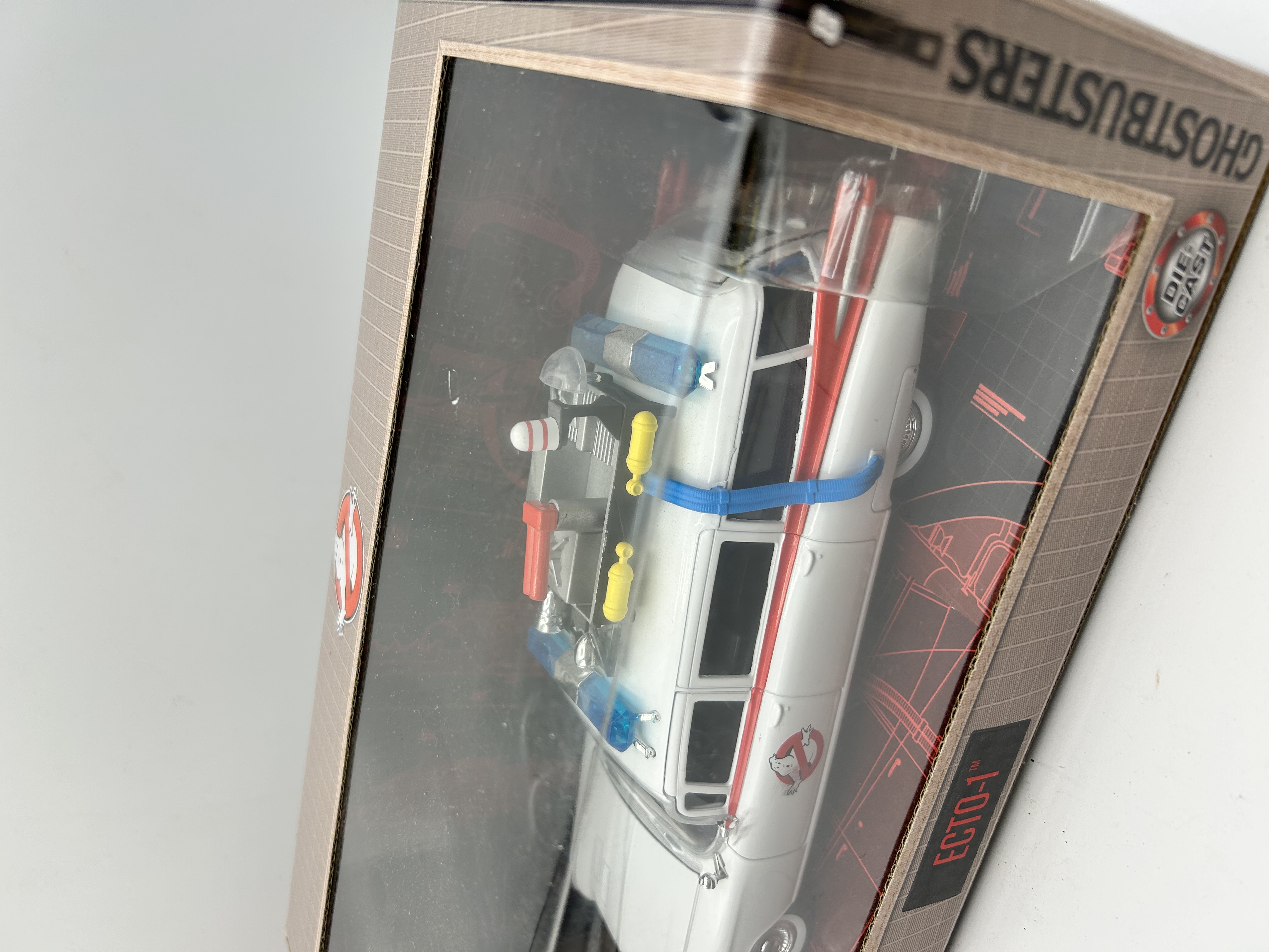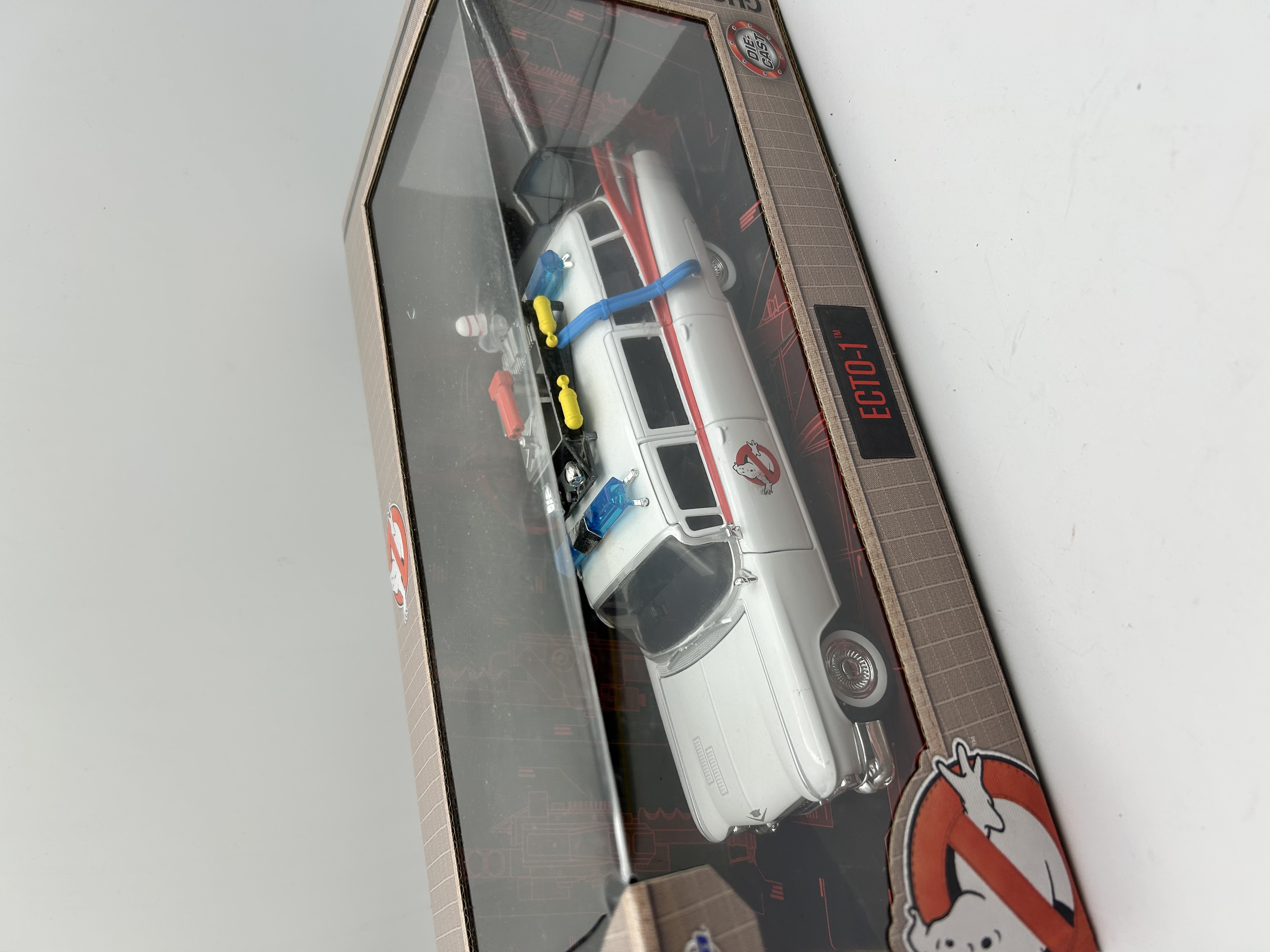 A Jada Toys die-cast model of the Ecto-1 vehicle from the Ghostbusters franchise. The model is a 1/24 scale representation of a 1959 Cadillac ambulance. The vehicle is finished in white with red accents and features the no ghosts logo on the side doors. The roof is outfitted with various equipment including blue light bars, yellow tanks, and red and blue hoses. The item is housed in its original retail window-box packaging, which includes Ghostbusters branding and a die-cast emblem.