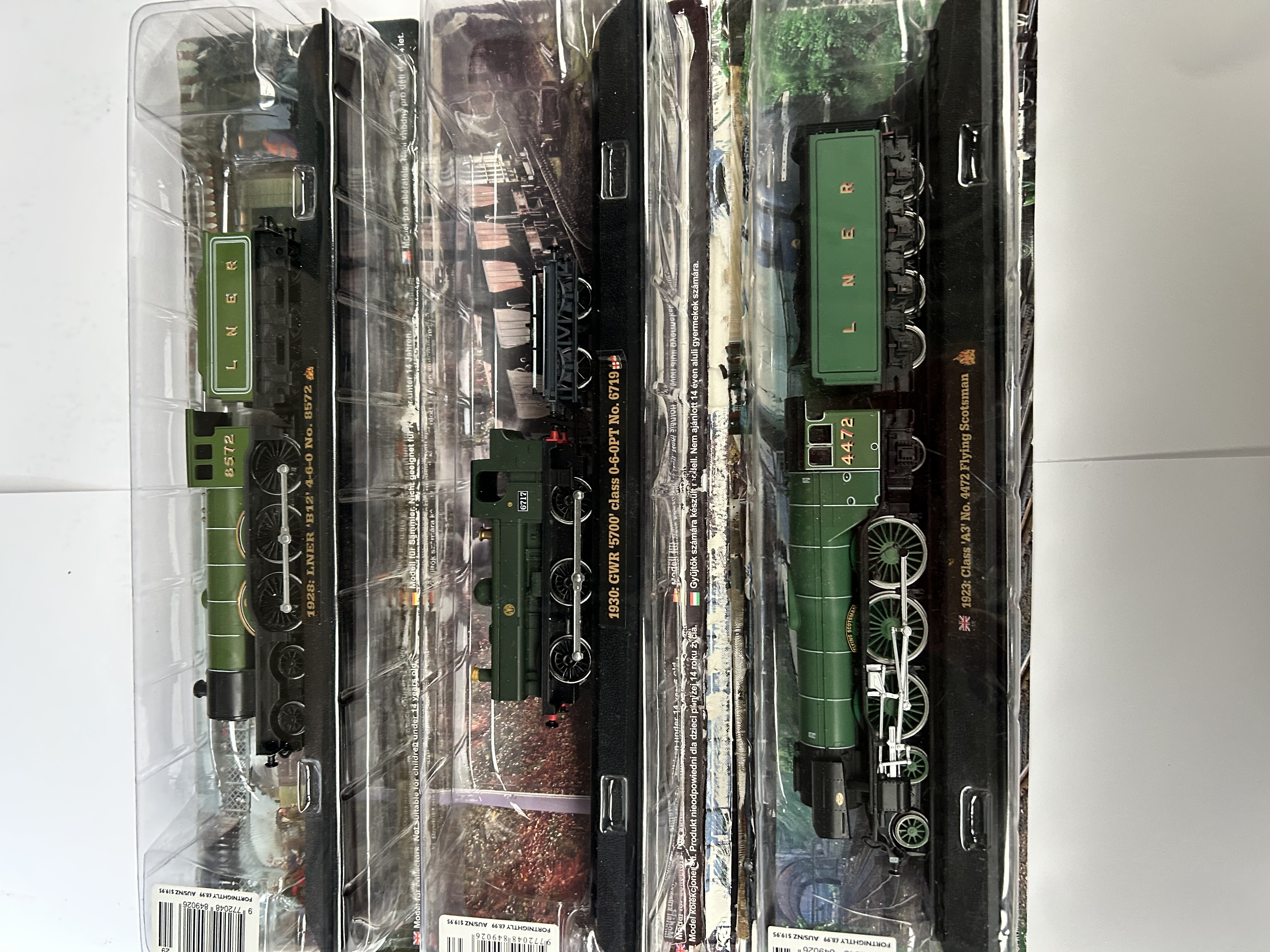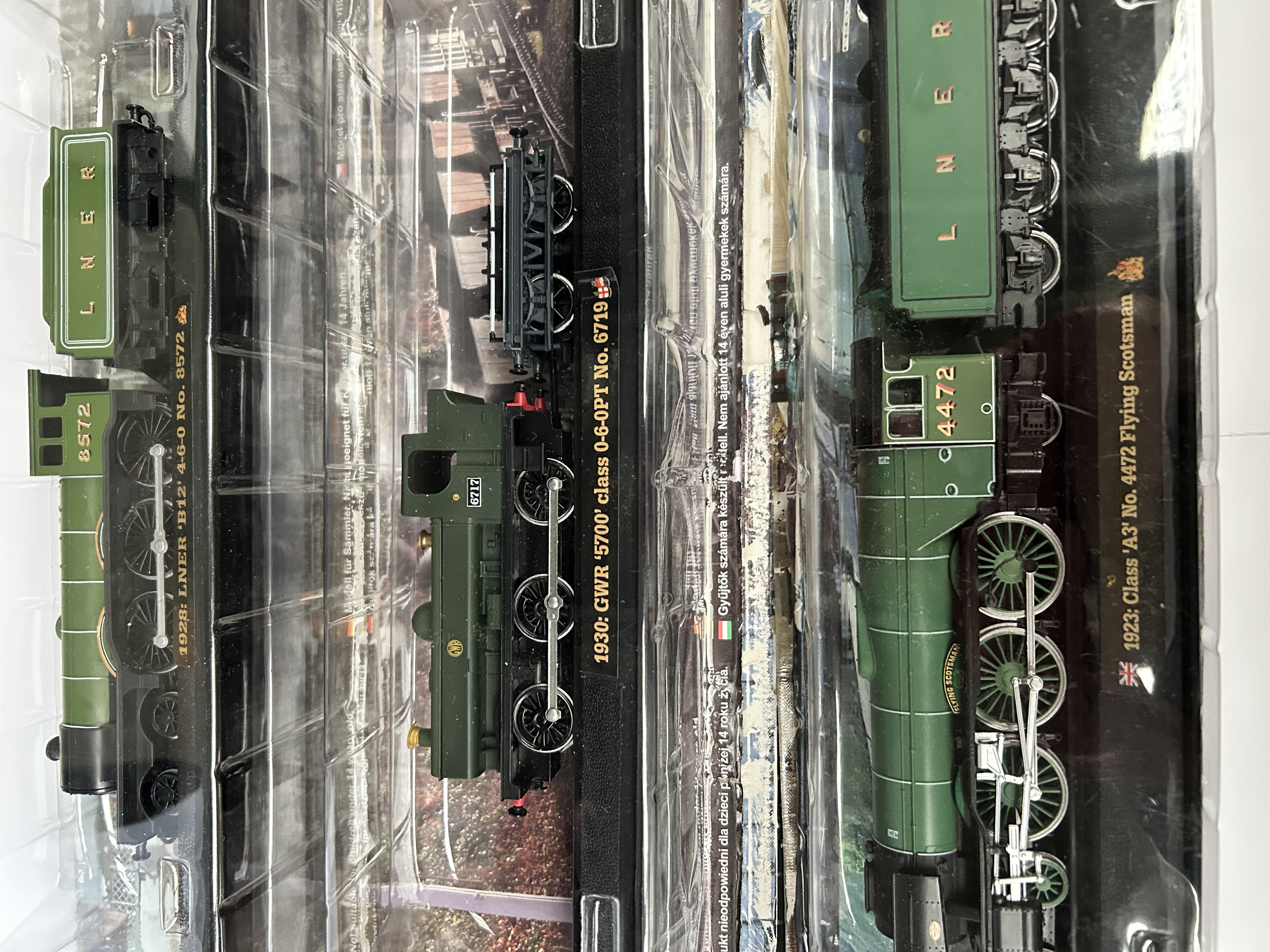 A trio of static model locomotives from the Great British Locomotives Collection partwork series. The group includes an LNER B12 4-6-0 No. 8572, a GWR 5700 class 0-6-0PT No. 6719, and a Class A3 No. 4472 Flying Scotsman. Each model is constructed from die-cast metal and plastic components, finished in a representative green livery with authentic company markings, numbering, and nameplates. The models are mounted on black display bases featuring printed identification and historical information. Each item is housed in its original clear plastic blister packaging.