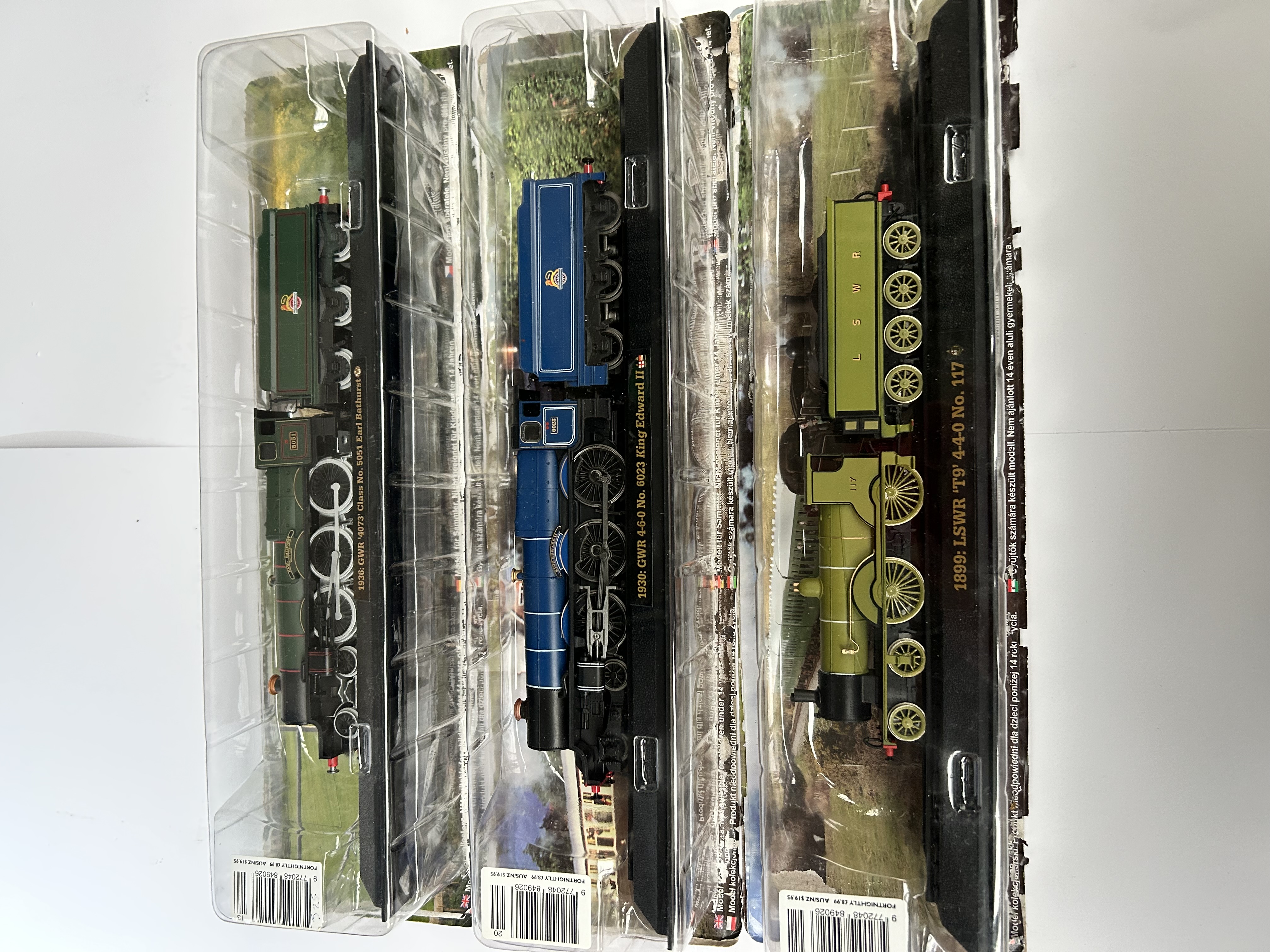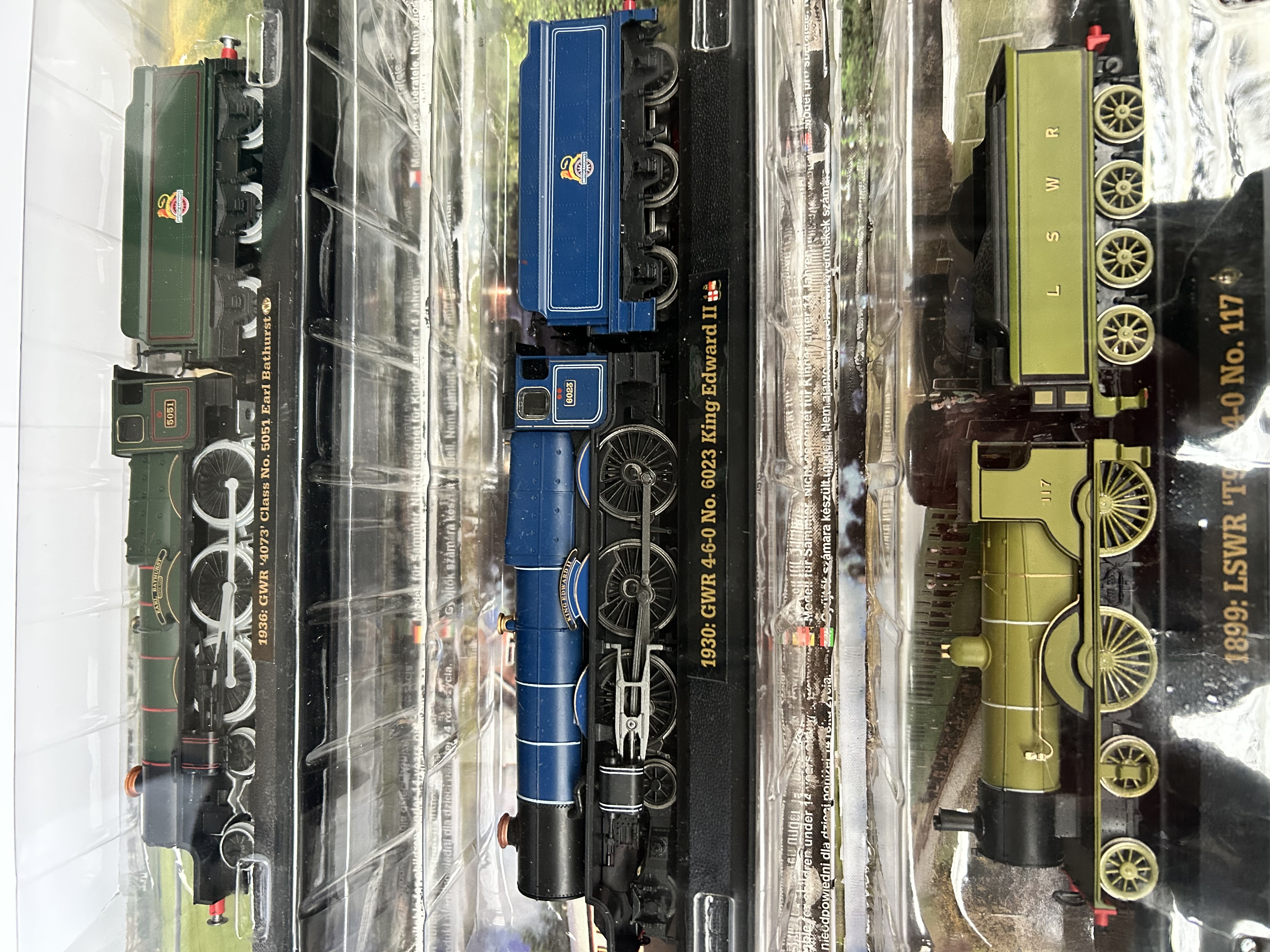 A trio of Great British Locomotive Collection OO gauge static display models. The lot comprises three individual locomotives with tenders, each mounted on a black plastic display plinth. Included are a 1936 GWR 4073 Class No. 5051 Earl Bathurst in green livery, a 1930 GWR 4-6-0 No. 6023 King Edward II in blue livery, and an 1899 LSWR T9 4-4-0 No. 117 in olive green livery. The models are constructed from plastic and die-cast components, featuring printed numbering and company insignia. Each item remains sealed in its original clear plastic blister packaging, which includes retail barcodes and subscription series identification.