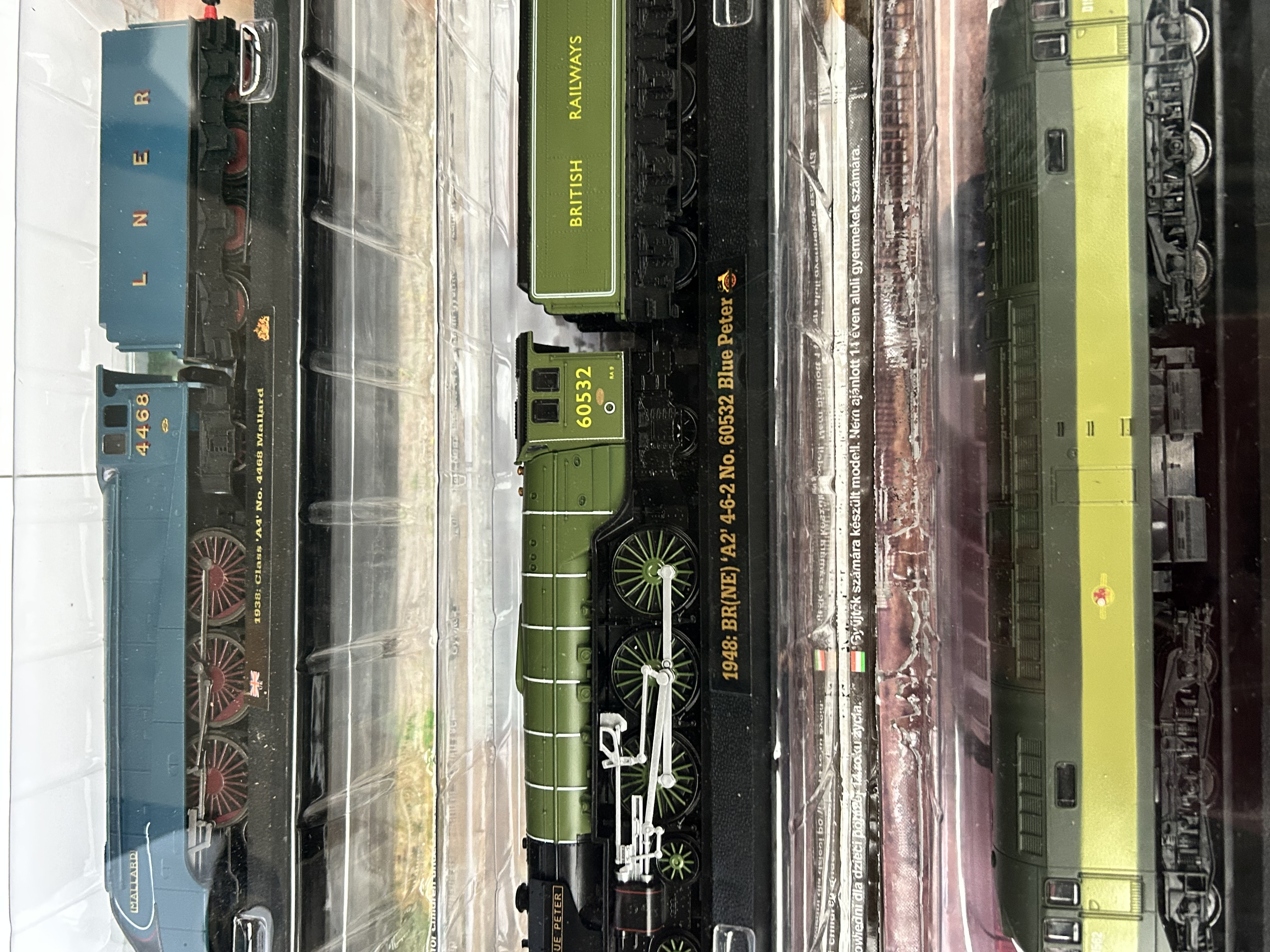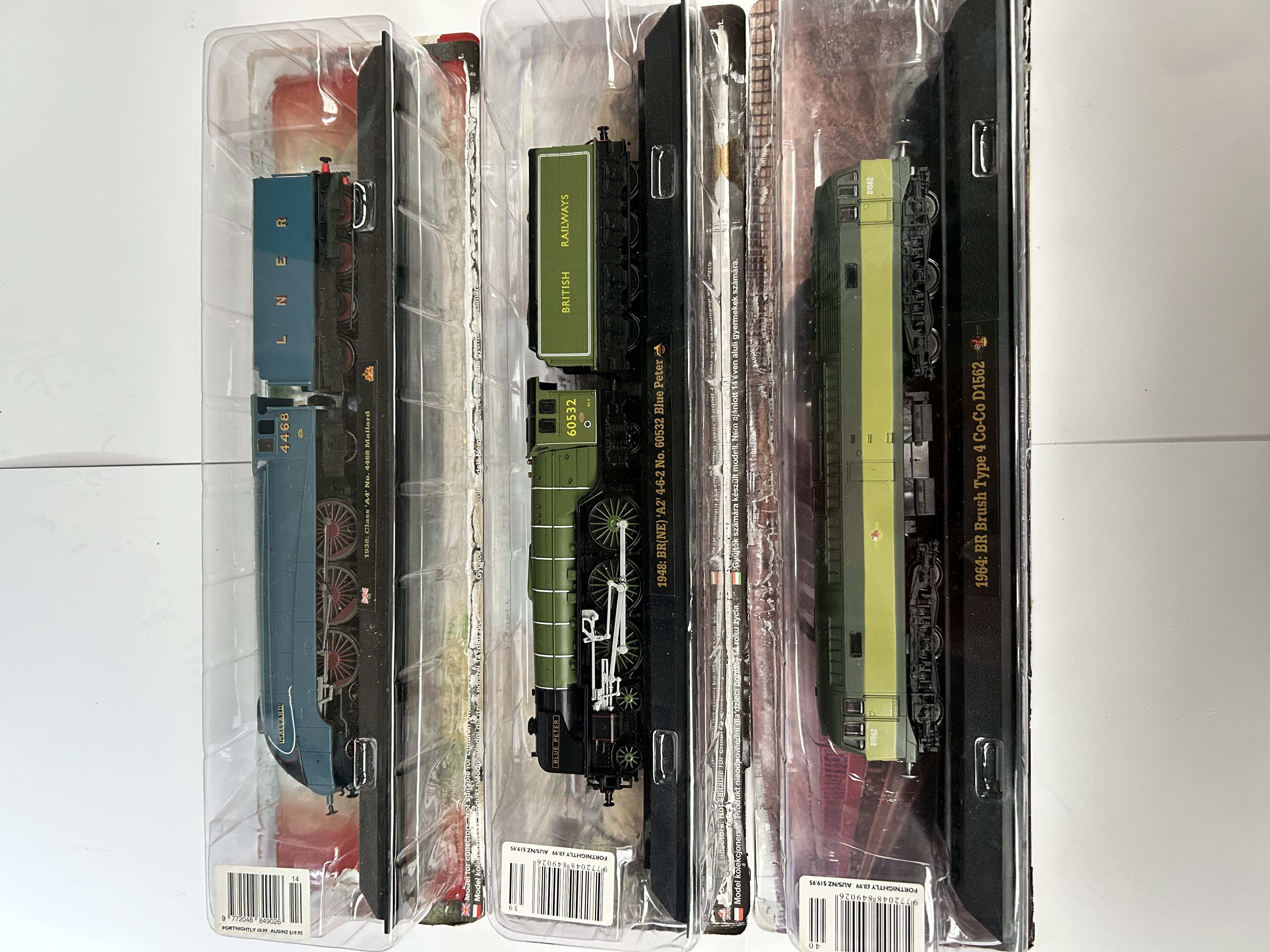 A trio of static model locomotives from the Great British Locomotives Collection series. Each model is mounted on a black display base with a descriptive plaque and remains in its original plastic blister packaging. The group consists of a blue LNER Class A4 No. 4468 Mallard steam locomotive with tender, a green BR NE A2 4-6-2 No. 60532 Blue Peter steam locomotive with tender, and a two-tone green 1964 BR Brush Type 4 Co-Co D1562 diesel locomotive. The models display detailed liveries and authentic markings including road numbers and company names such as LNER and British Railways. Barcode labels on the packaging identify these as part of a fortnightly collectible series.