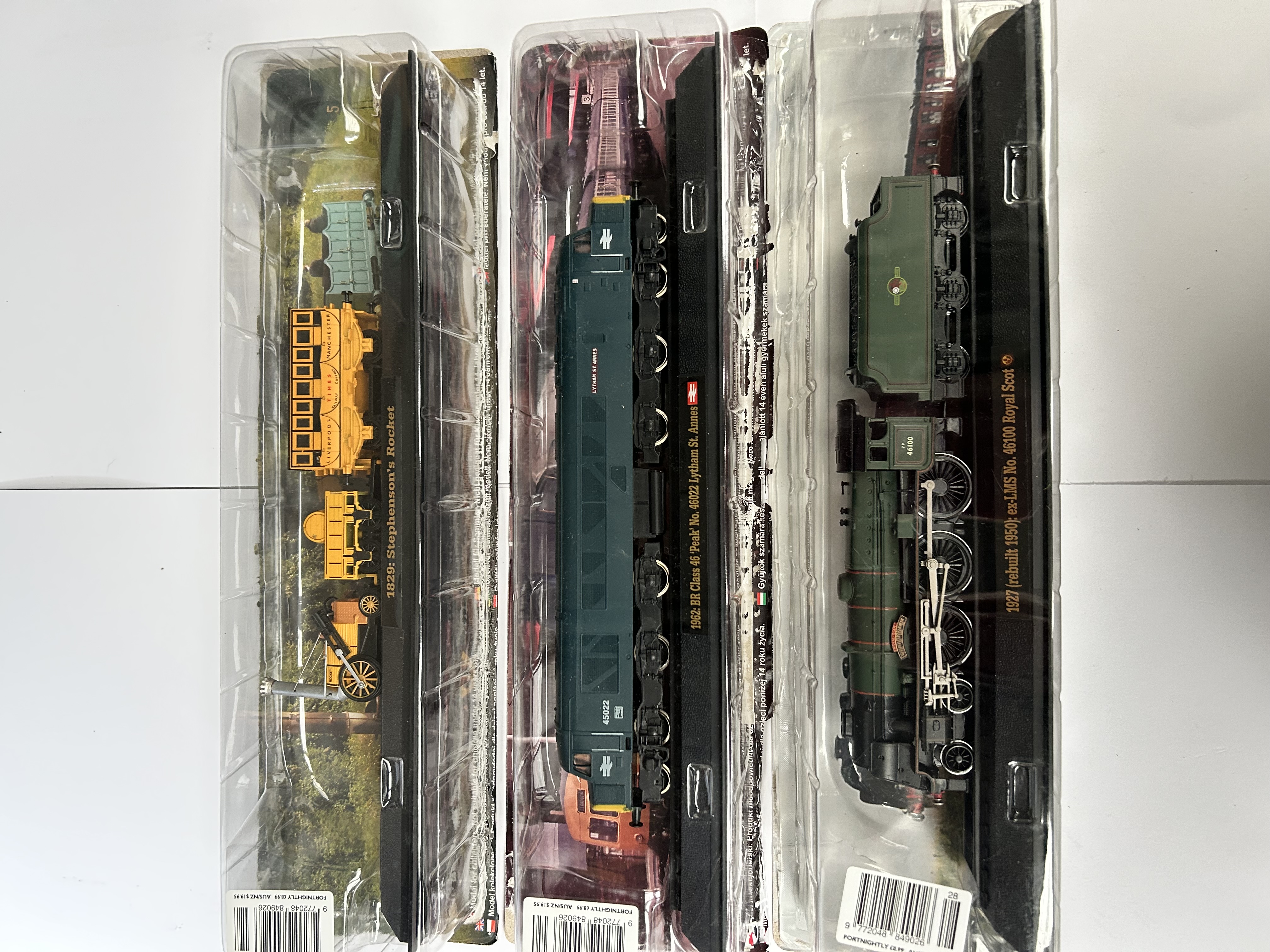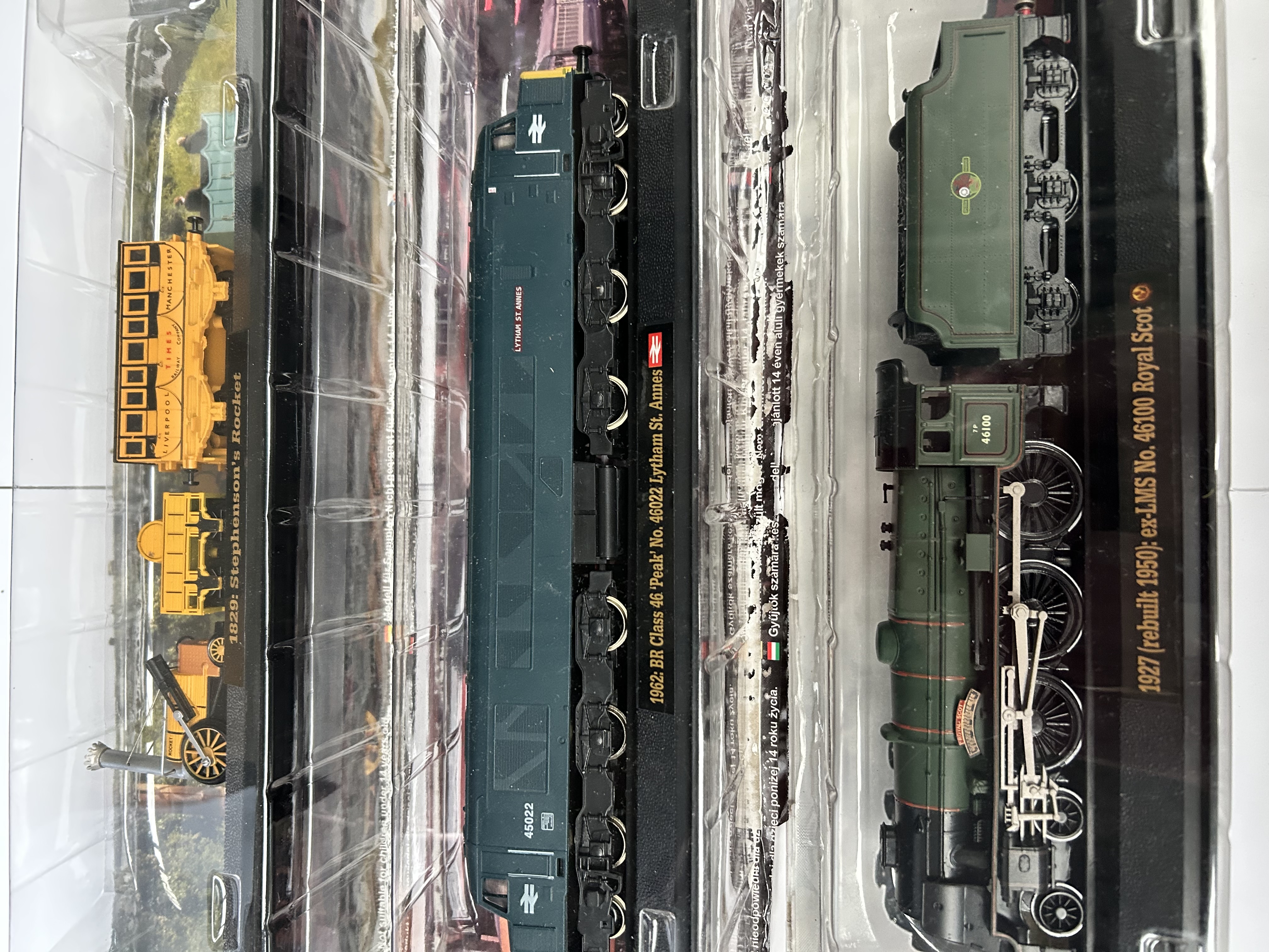 A trio of static scale model locomotives, each presented in original clear plastic blister packaging on a black display base with gold-tone identifying text. The collection includes an 1829 Stephenson’s Rocket with a yellow Liverpool Manchester Times carriage; a 1962 BR Class 46 Peak diesel-electric locomotive No. 46022 Lytham St. Annes in green British Rail livery; and a 1927 (rebuilt 1950) ex-LMS No. 46100 Royal Scot steam locomotive with tender in dark green. The packaging features barcodes and indicates the models were part of a fortnightly publication series. Multilingual warning labels are present on the reverse identifying the items as adult collectibles.