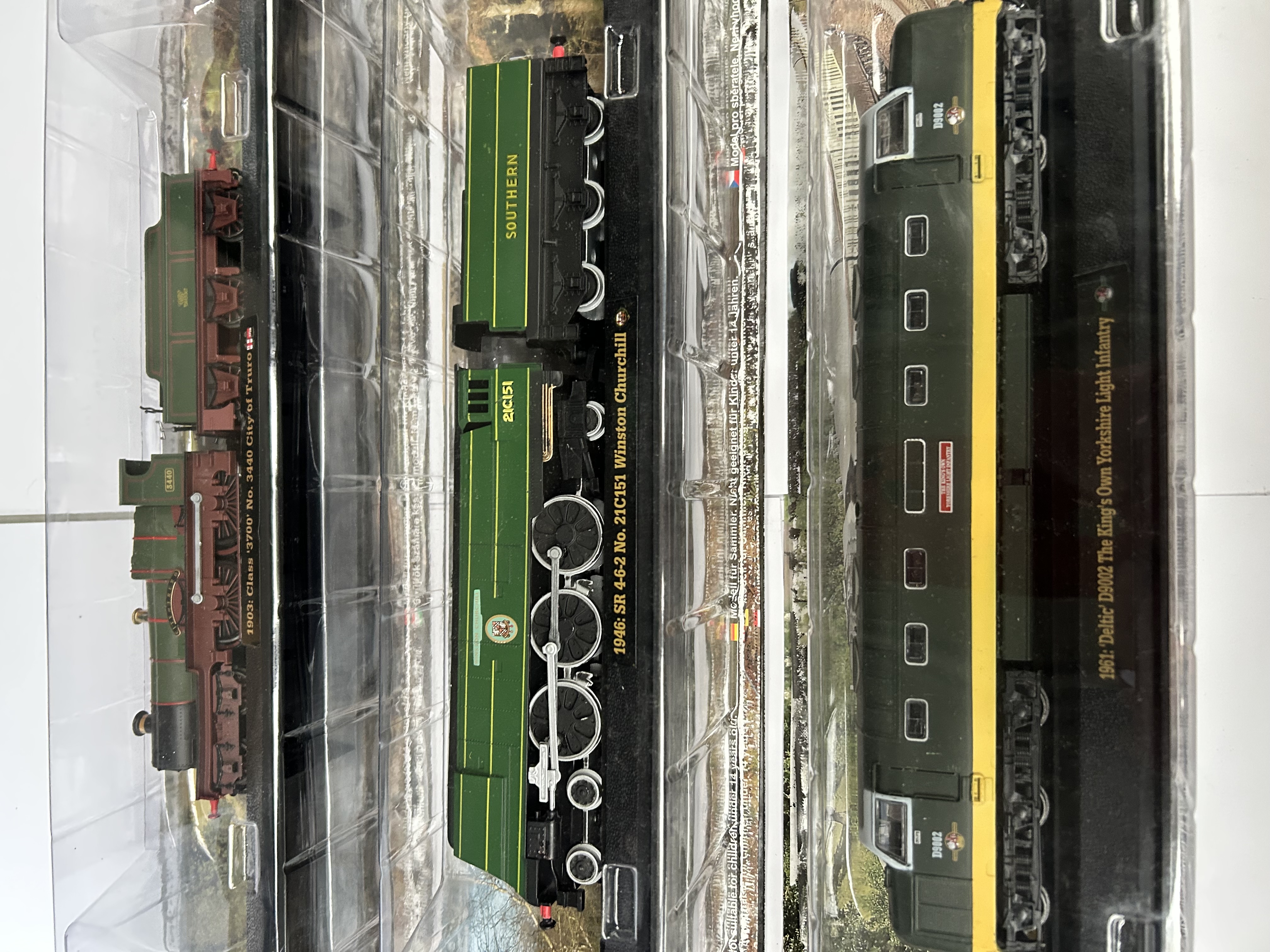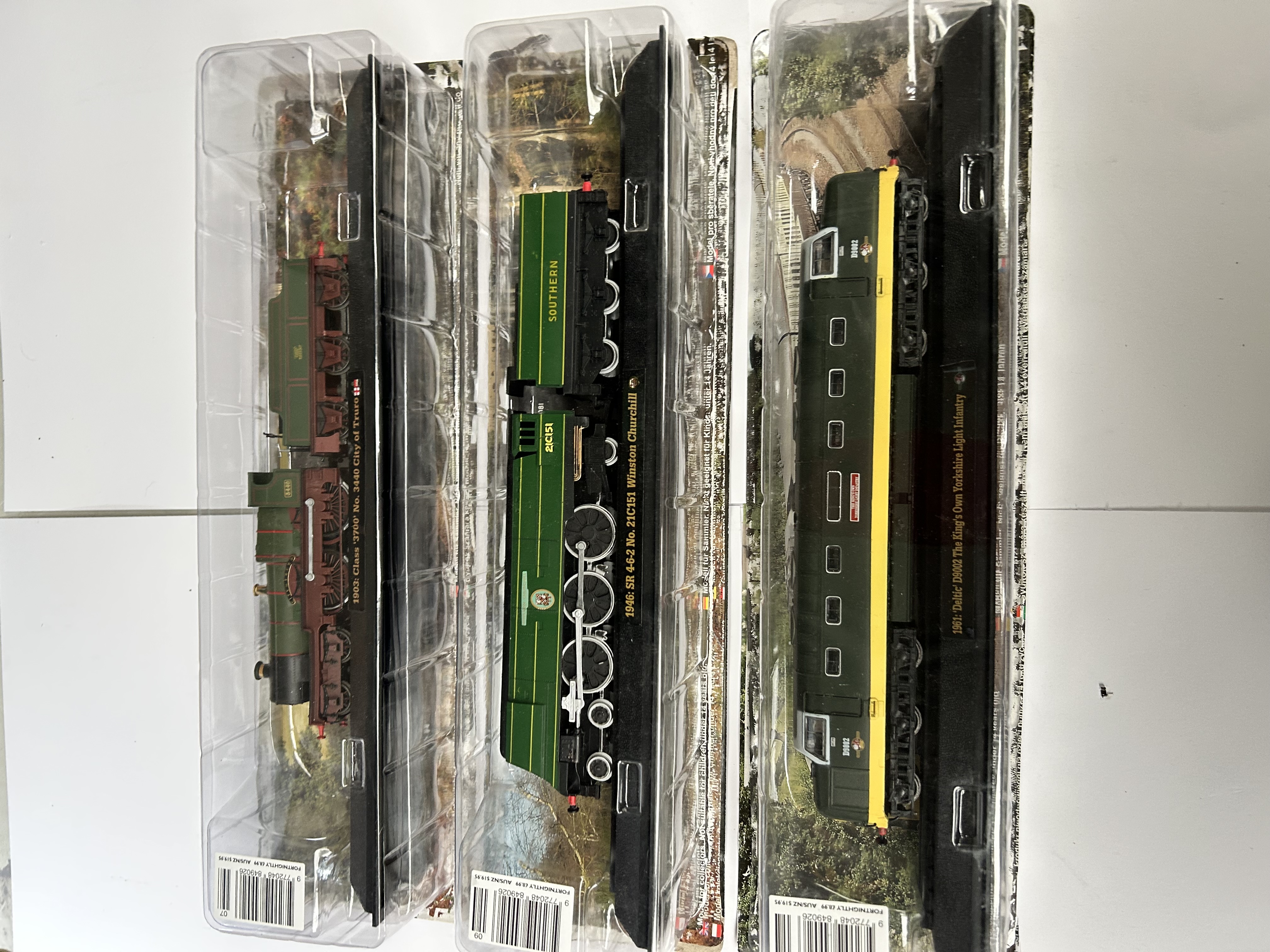 A trio of die-cast model locomotives presented in original factory-sealed blister packaging. The collection includes a 1903 Class 3700 No. 3440 City of Truro in Great Western Railway livery, a 1946 SR 4-6-2 No. 21C151 Winston Churchill in Southern Railway green, and a 1961 Deltic D9002 The King’s Own Yorkshire Light Infantry in British Rail green. Each model is mounted on a black display plinth featuring gold-tone identifying text and is set against a scenic photographic background card. The packaging includes barcodes and multilingual information for adult collectors, indicating these items were produced as part of a fortnightly publication series.