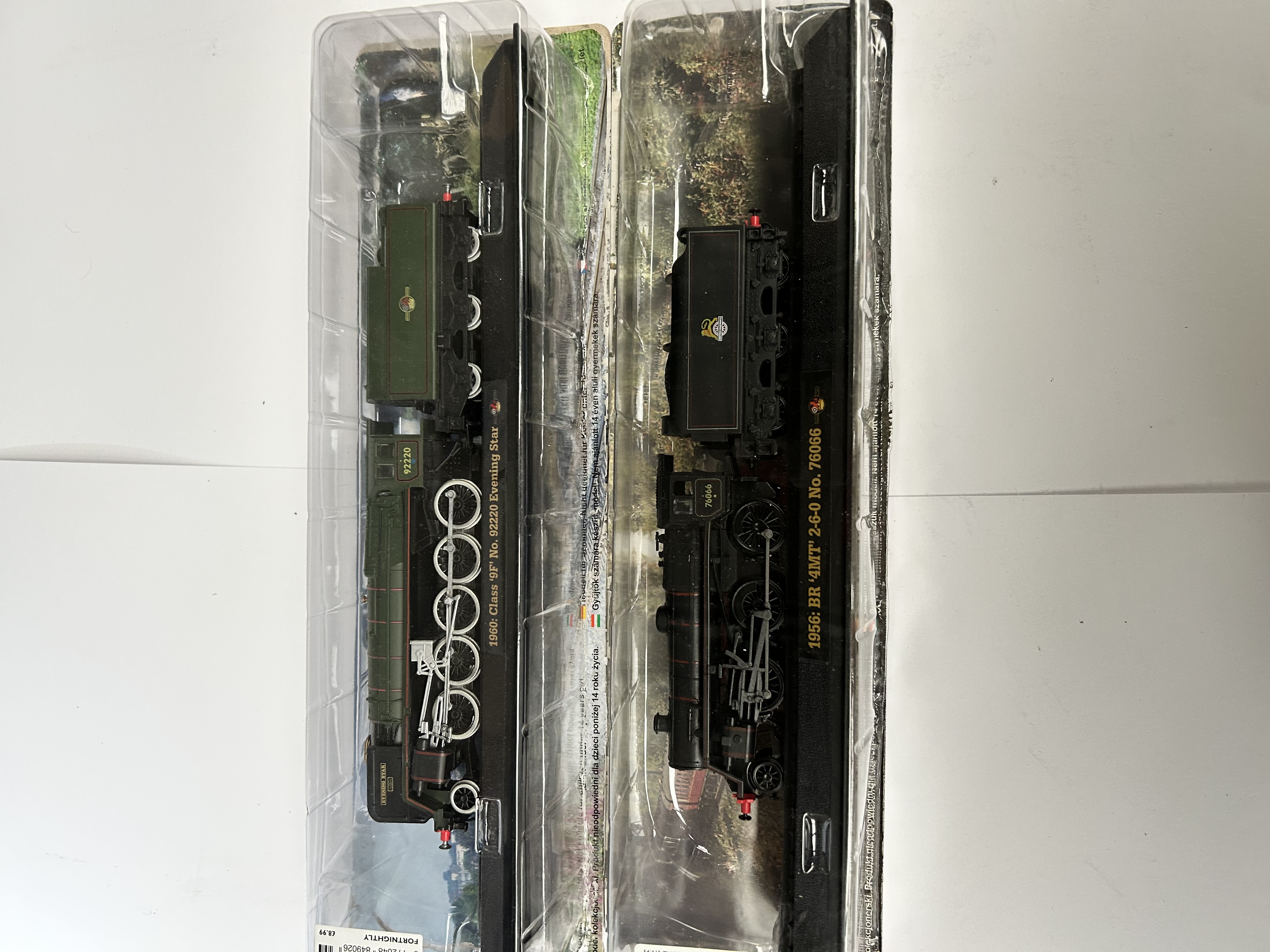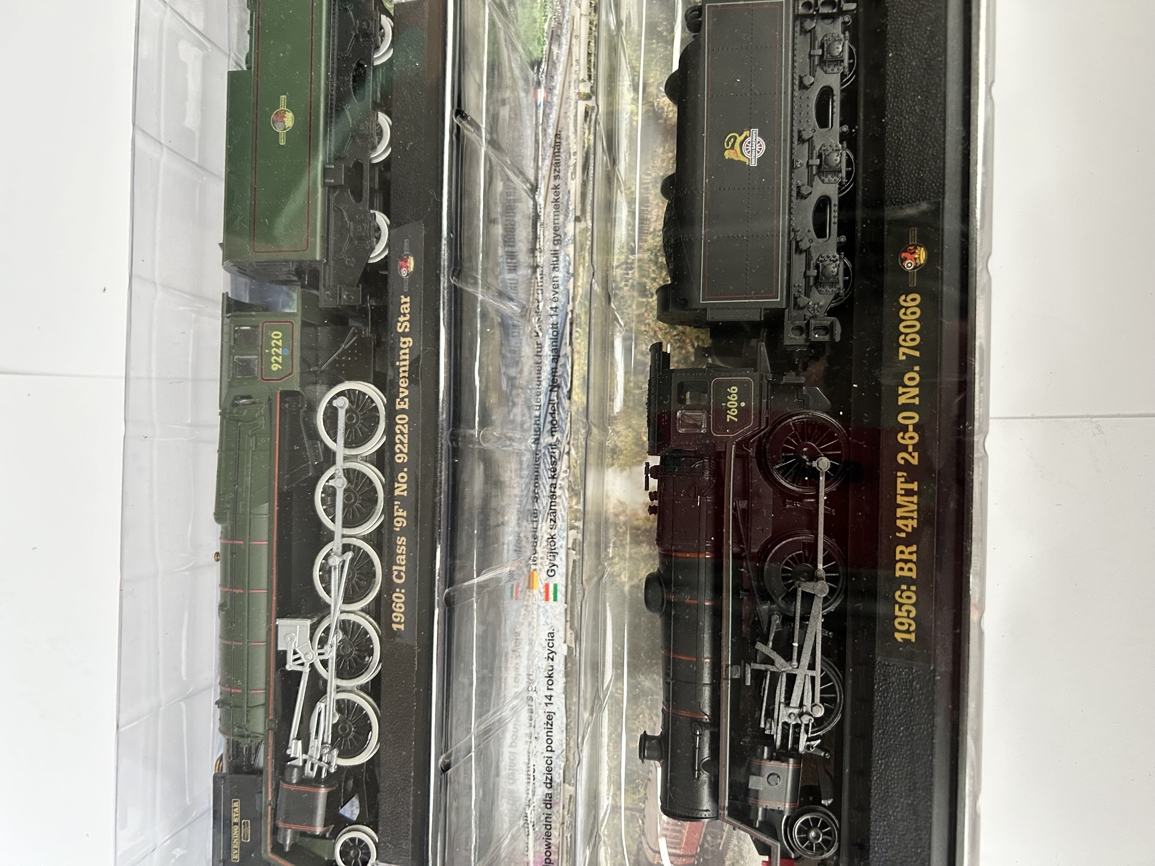 A pair of static scale model steam locomotives presented in original clear plastic display packaging. The collection includes a British Railways Class 9F 2-10-0 locomotive, Evening Star, No. 92220, finished in a green livery. The second model is a British Railways Class 4MT 2-6-0 locomotive, No. 76066, finished in a black livery with red lining. Both models are mounted on black display plinths that include the locomotive class, number, name, and original year of service. The packaging includes card inserts with multilingual cautionary text.