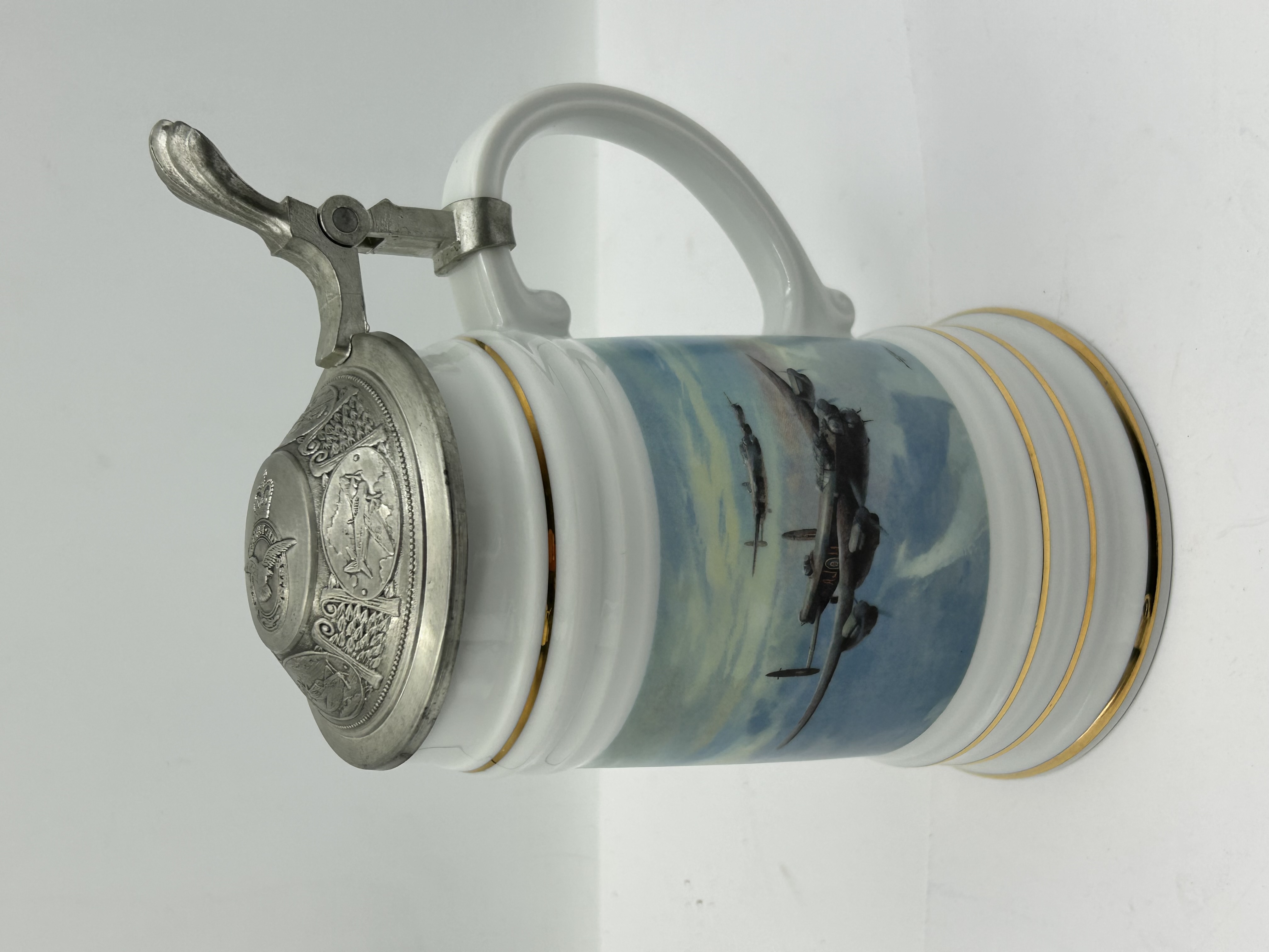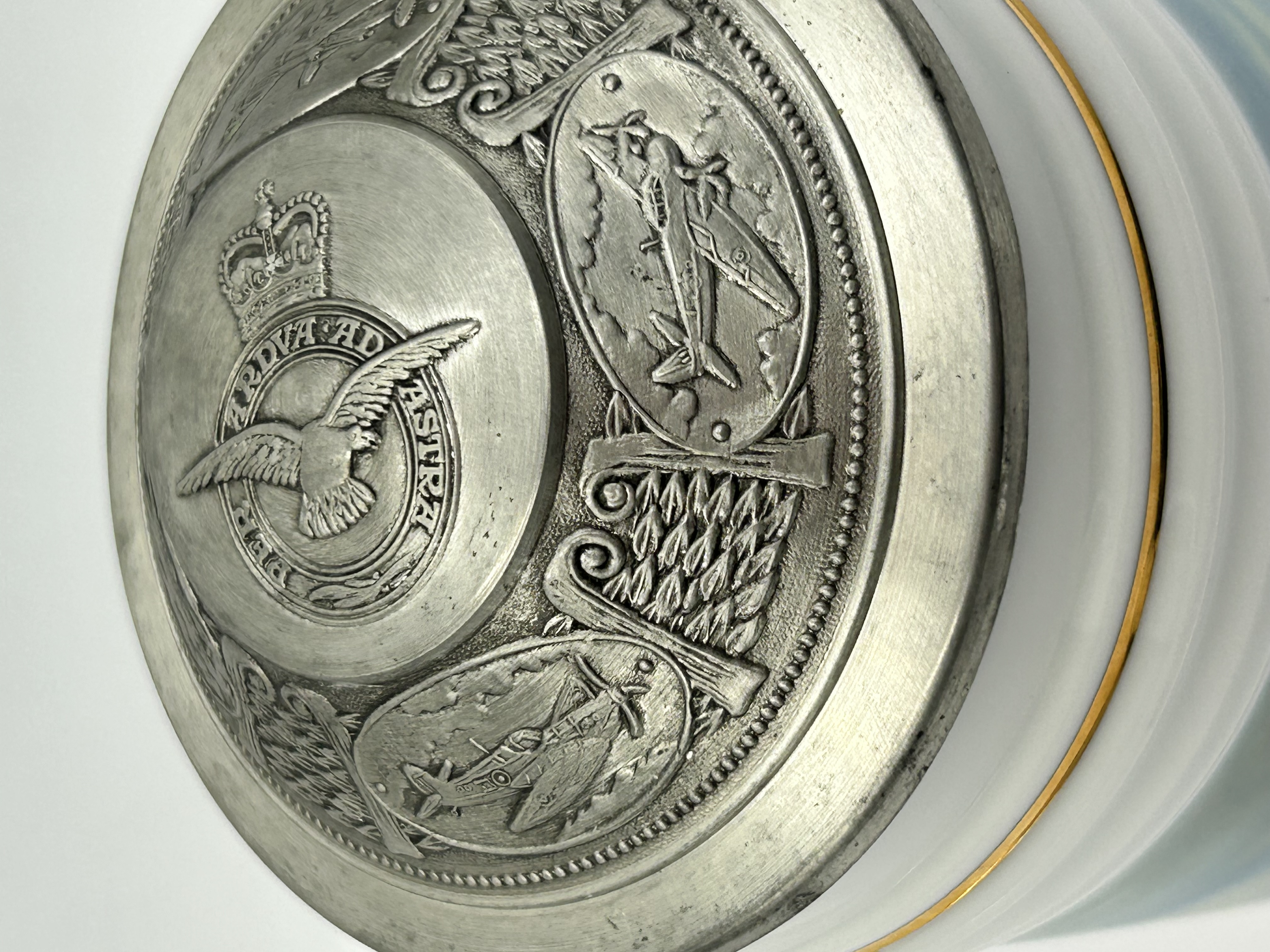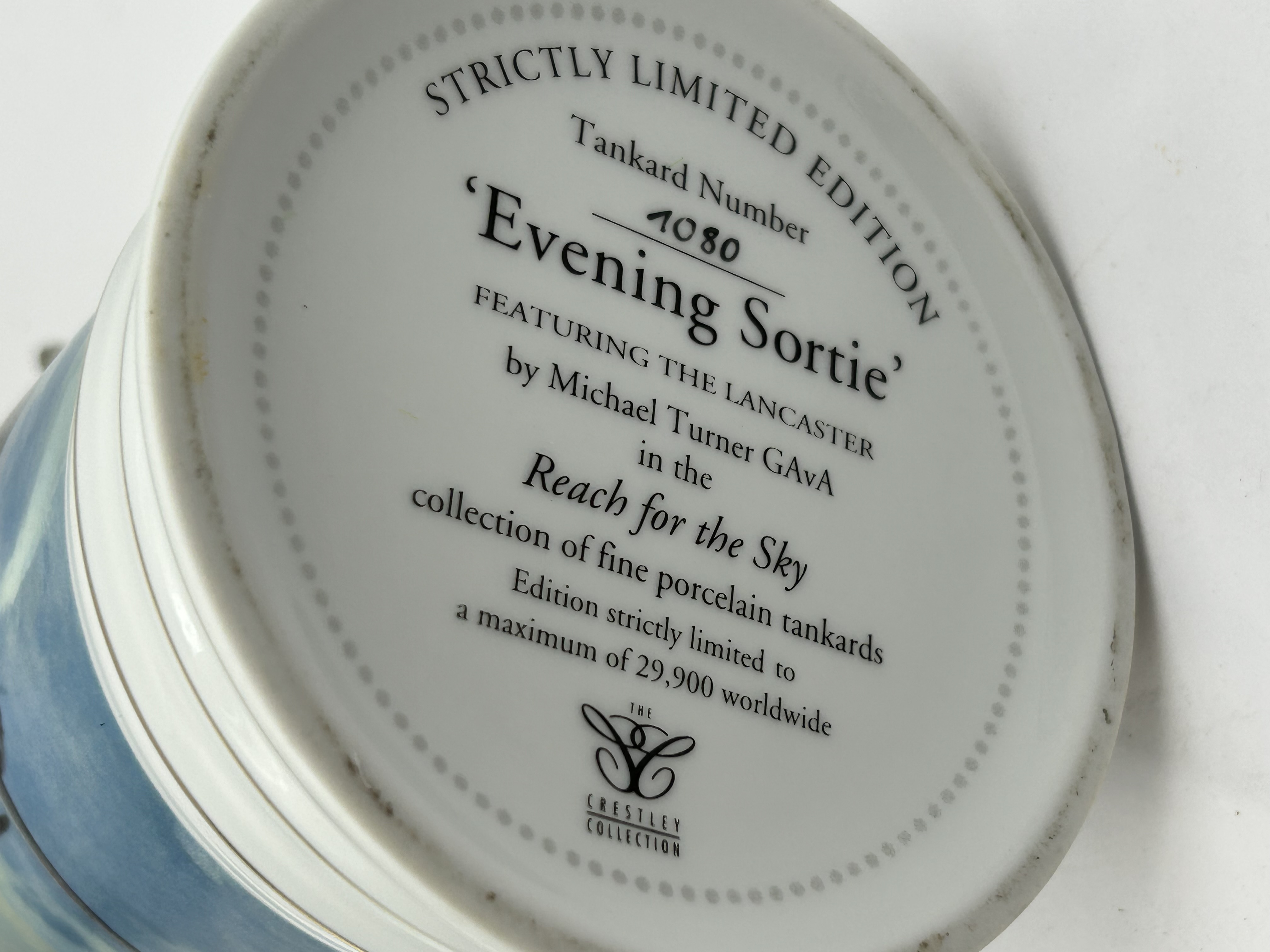 A limited edition porcelain tankard from The Crestley Collection, titled Evening Sortie. The piece features wrap-around aviation artwork by Michael Turner GAvA depicting Avro Lancaster bombers in flight. The white porcelain body is decorated with gold-tone banding at the rim and base. It is fitted with a hinged pewter lid embossed with the Royal Air Force crest, the motto PER ARDUA AD ASTRA, and two oval vignettes of World War II era aircraft. The underside of the base bears descriptive text identifying this as tankard number 1080 from the Reach for the Sky collection, with a stated edition limit of 29,900 worldwide.