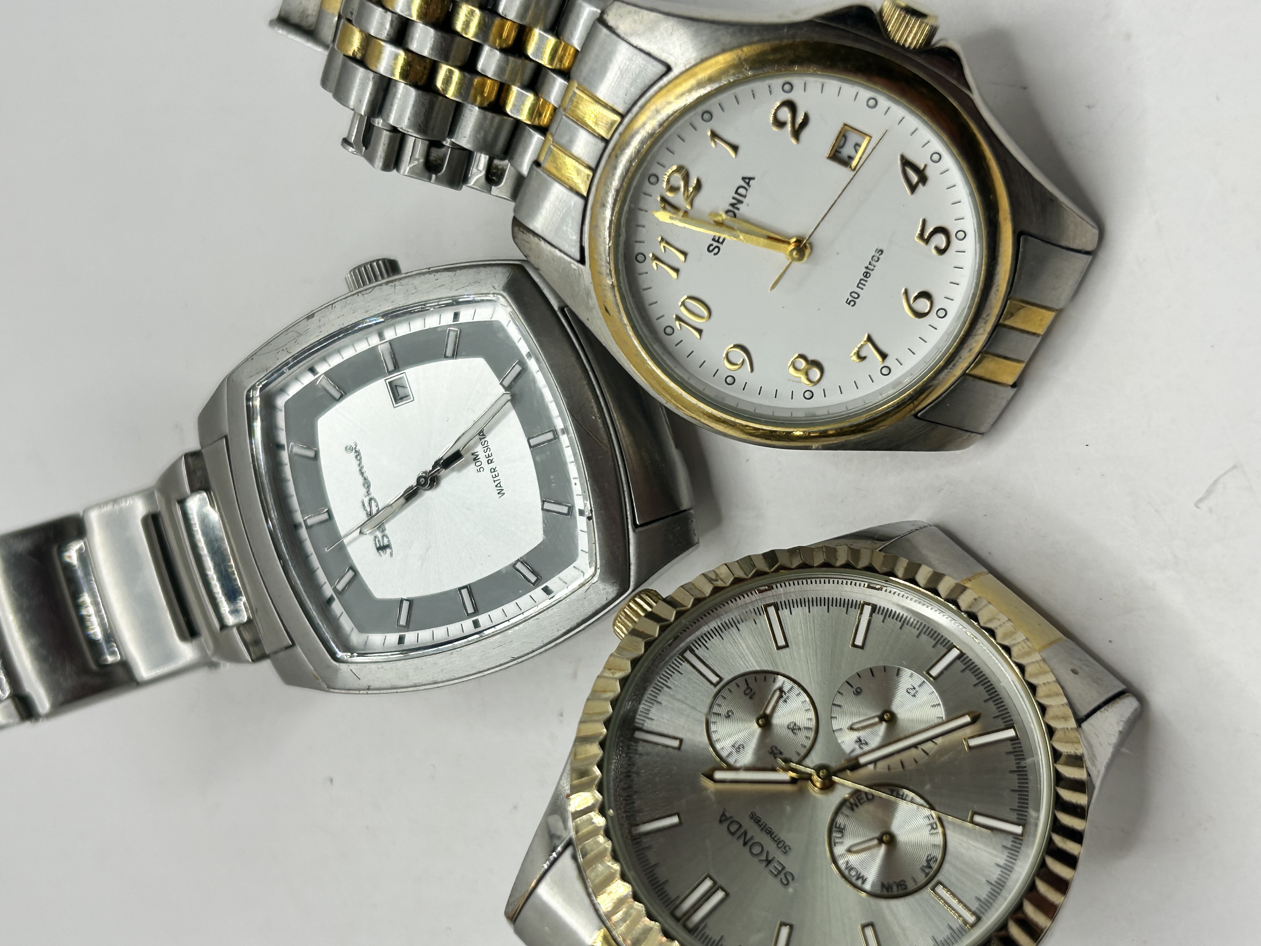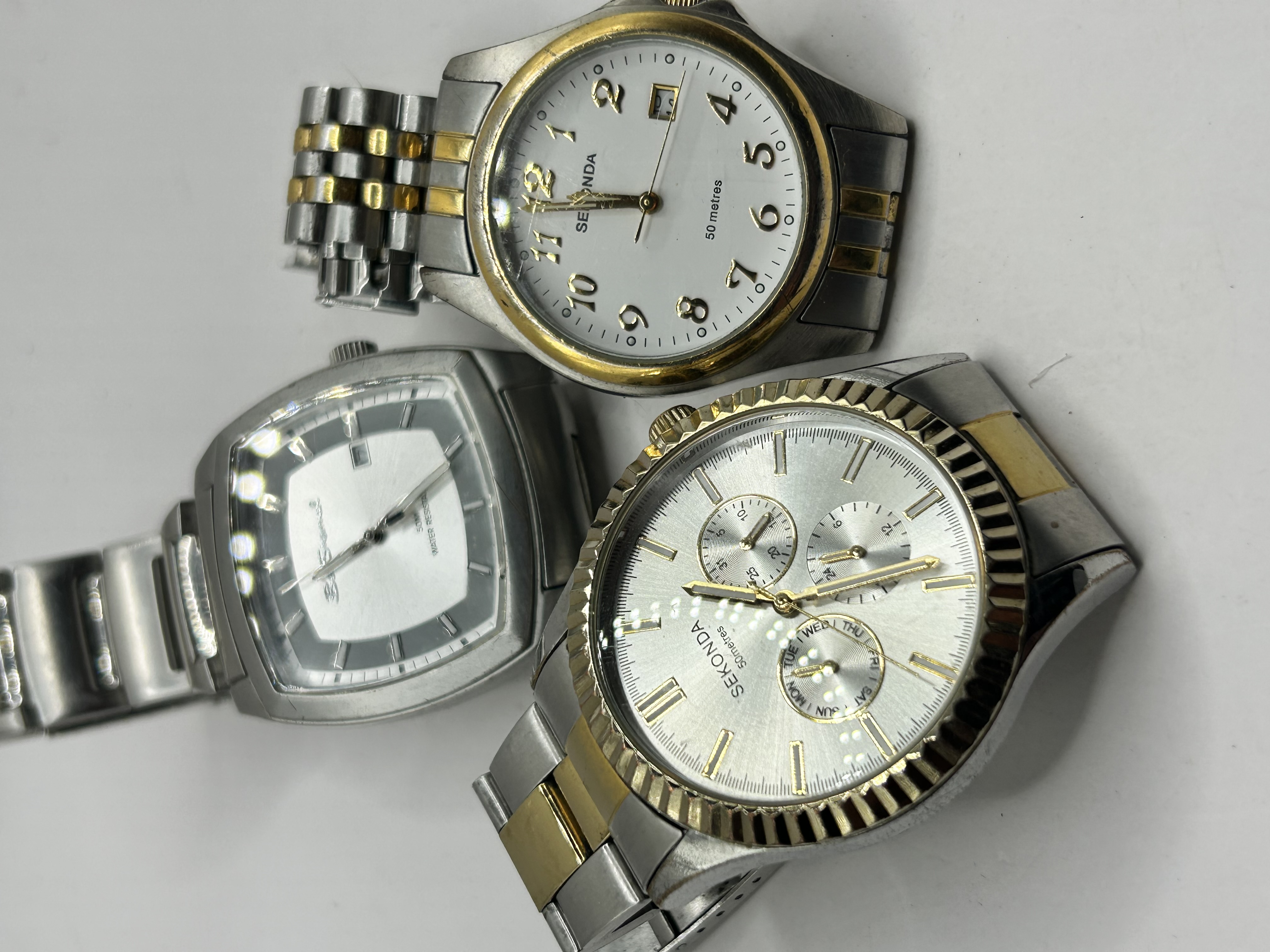 A trio of contemporary men’s wristwatches comprising two examples by Sekonda and one by Ben Sherman. The first Sekonda features a bi-color stainless steel case and jubilee-style bracelet, with a white dial, gold-toned Arabic numerals, and a date aperture at the three o’clock position. The second Sekonda presents a bi-color stainless steel case with a fluted gold-toned bezel, a silver-toned sunray dial with three sub-dials, and an oyster-style bracelet. The Ben Sherman wristwatch features a cushion-shaped stainless steel case with an integrated bracelet and a white dial with a grey border and date aperture at the six o’clock position. All three timepieces are marked as water-resistant to 50 meters.