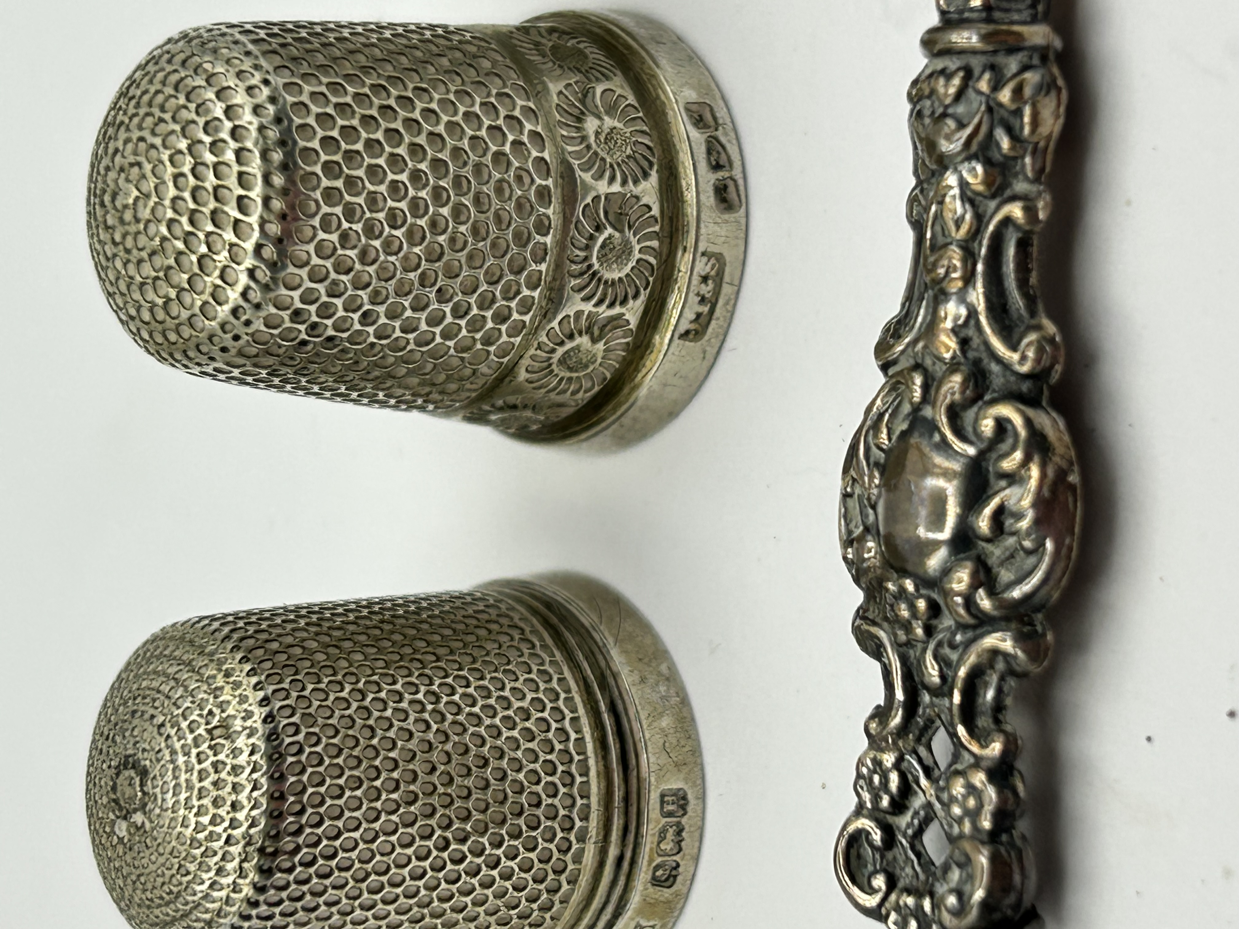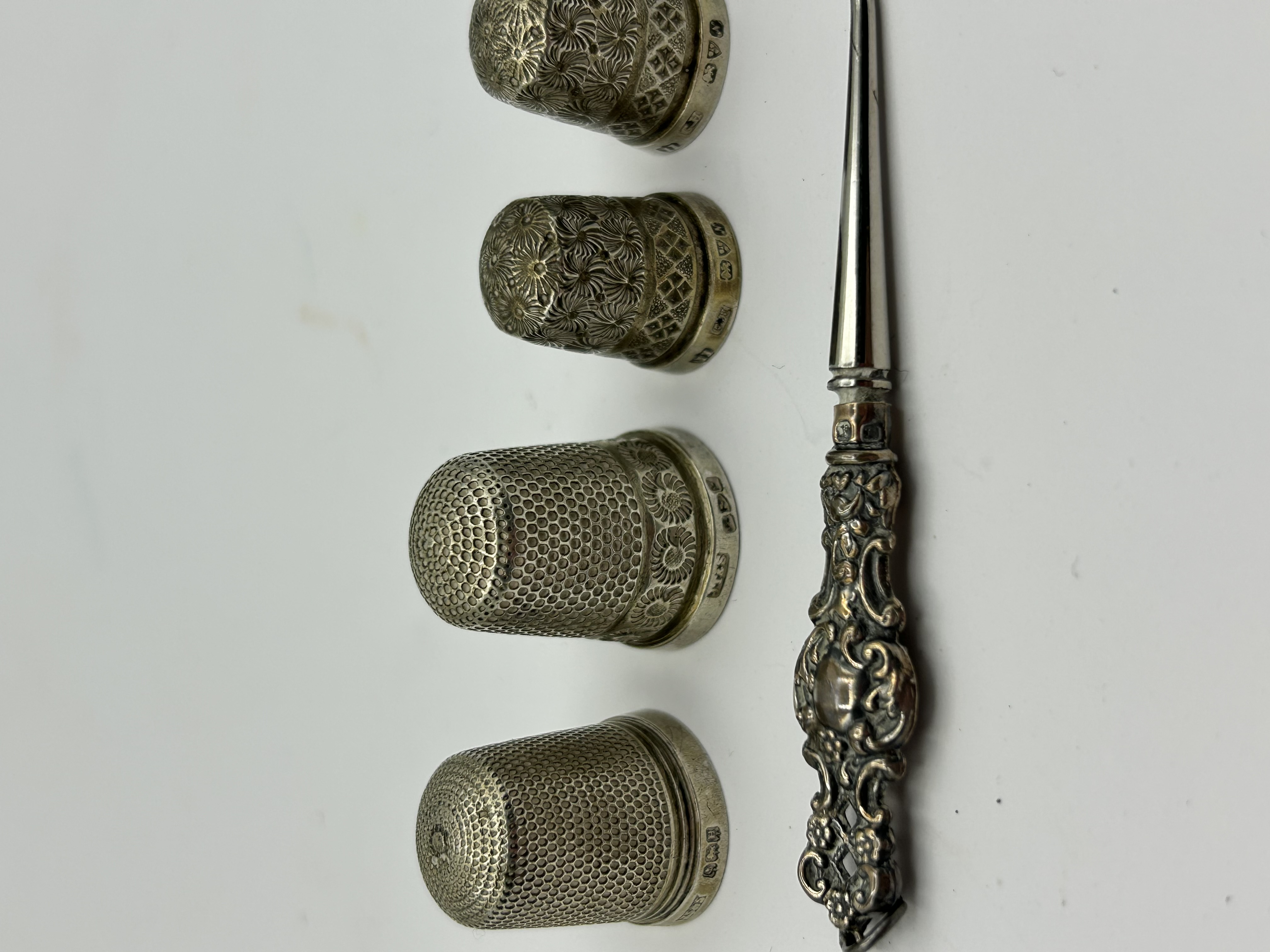 A collection of sterling silver sewing and vanity accessories, including thimbles by makers such as Henry Griffith and Sons and James Fenton. The thimbles feature various decorative patterns including sunburst floral designs, honeycomb textures, and embossed daisy bands. Multiple items bear British hallmarks for Birmingham, including the lion passant and anchor assay mark. Maker marks include HC&S for Henry Griffith and Sons, JF for James Fenton, and CH. The button hook consists of a steel shaft and a repousse silver handle decorated with foliate scrollwork and a central unengraved cartouche.