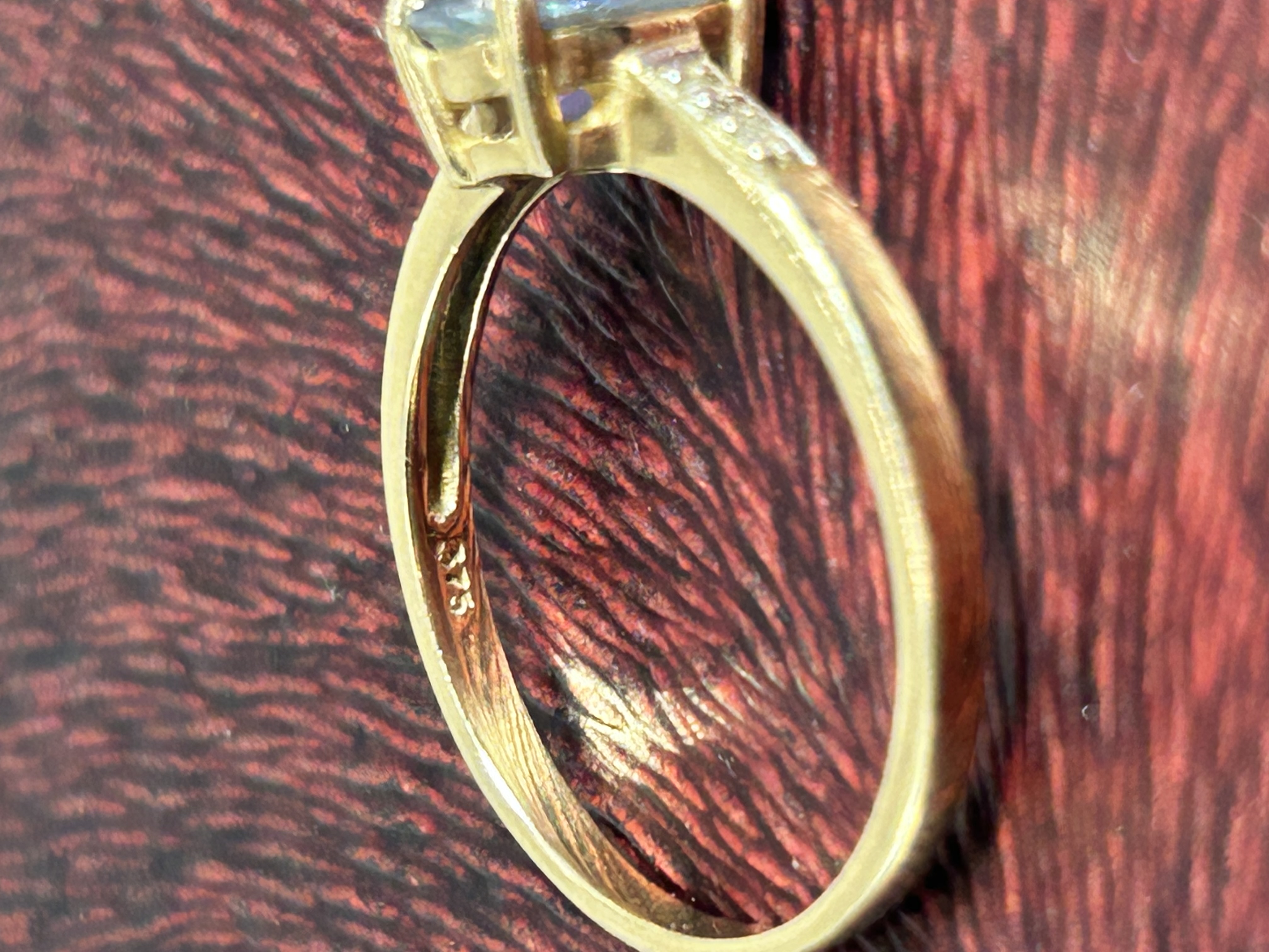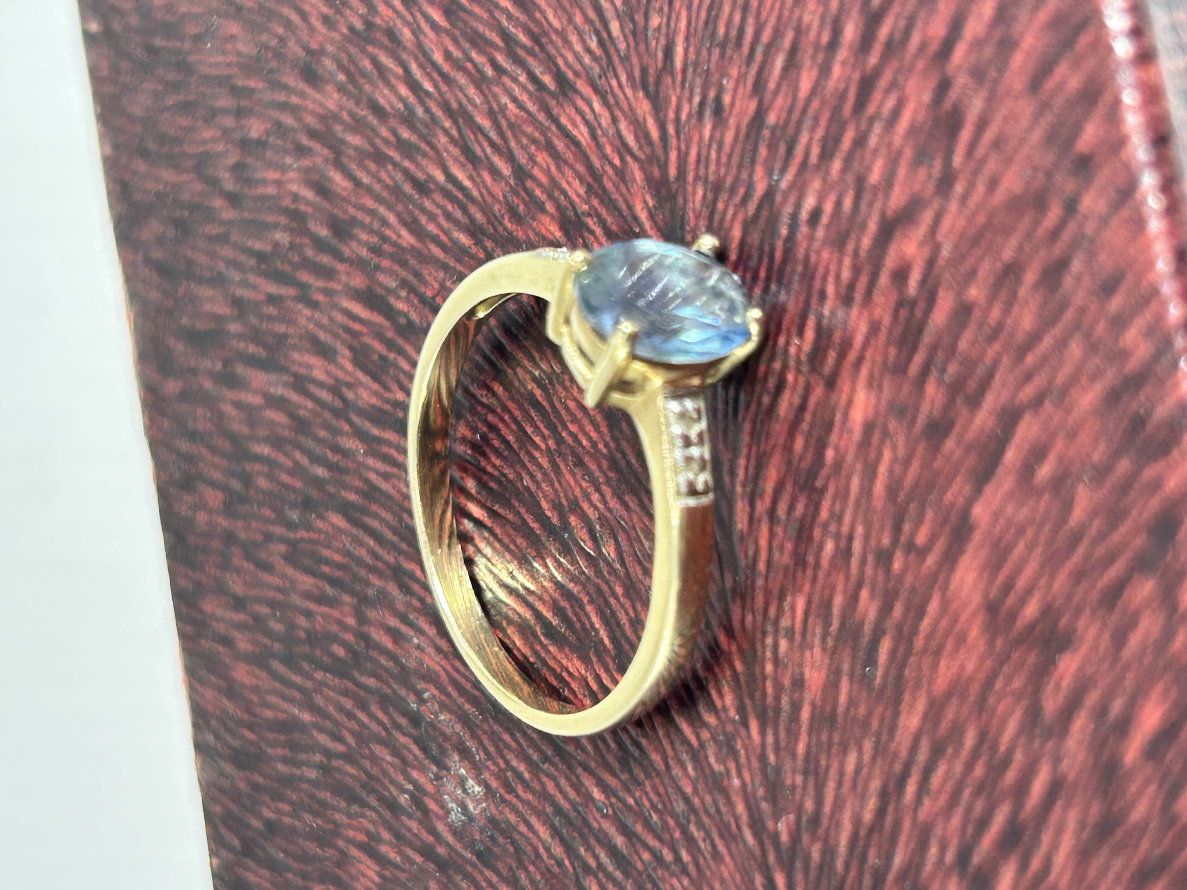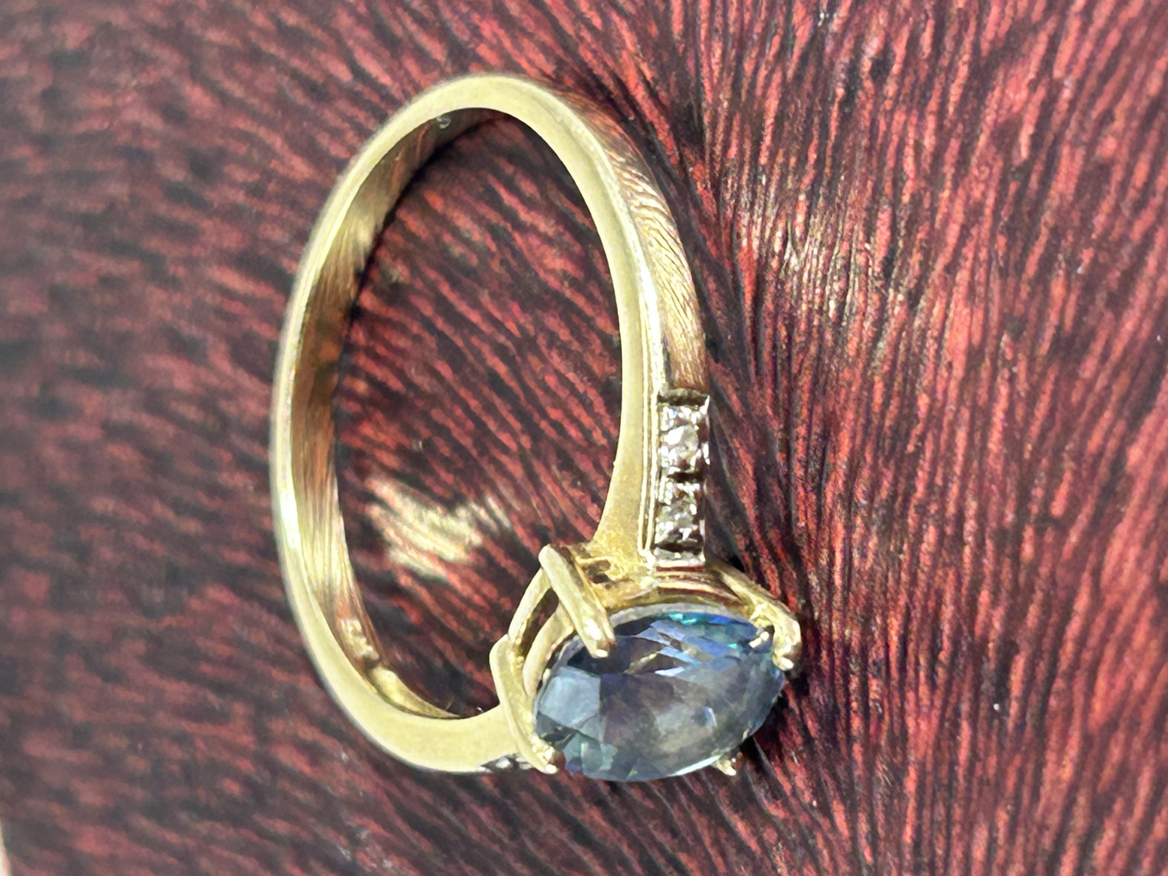 A 9ct gold five stone cornflower blue sapphire and diamond ring. The piece features a central oval-faceted cornflower blue sapphire secured in a four-prong setting. The shoulders of the band are accented with small round-cut diamonds set into the metal. The interior of the band bears a 375 hallmark, confirming the gold construction. The primary gemstone exhibits characteristic light refraction and internal facets.