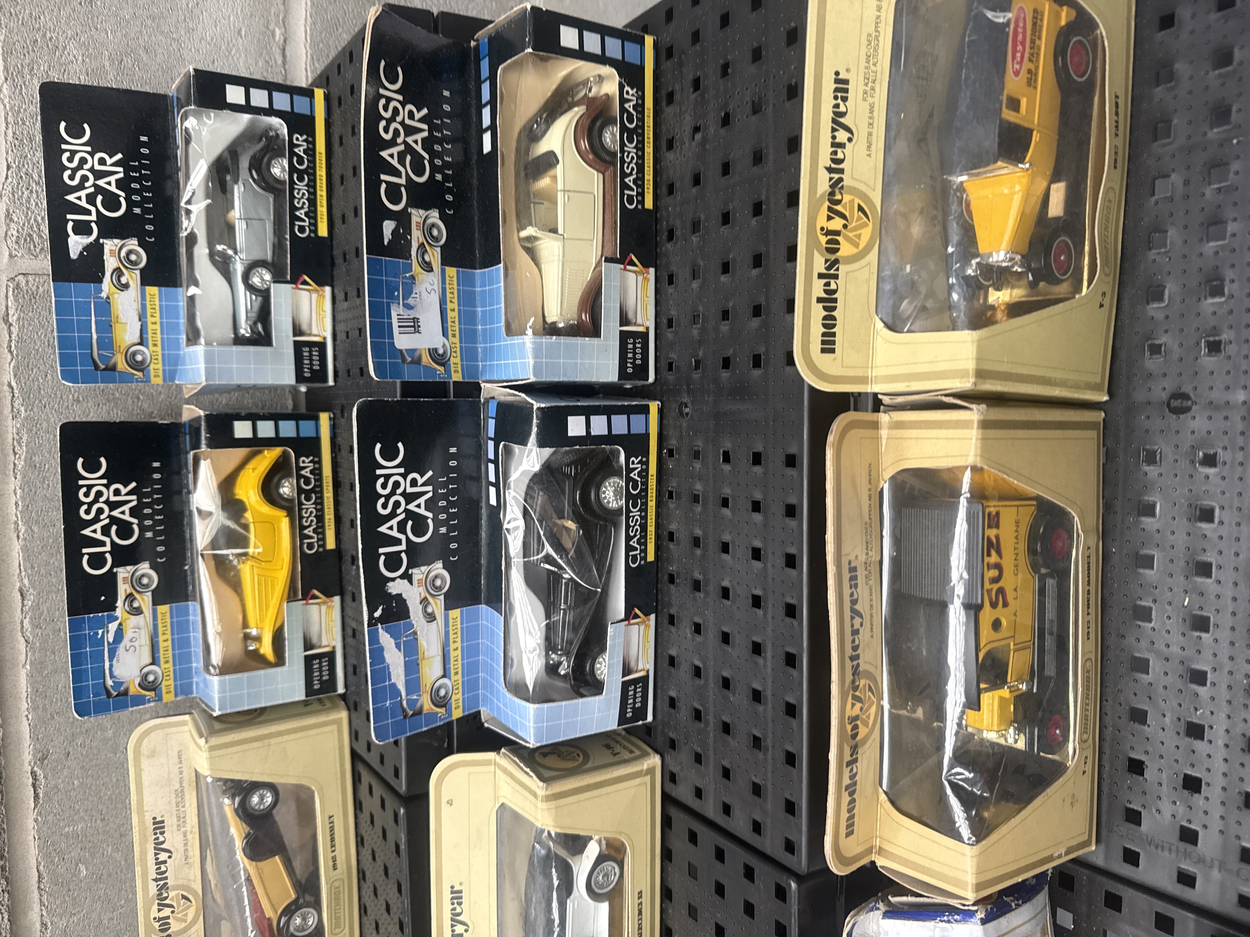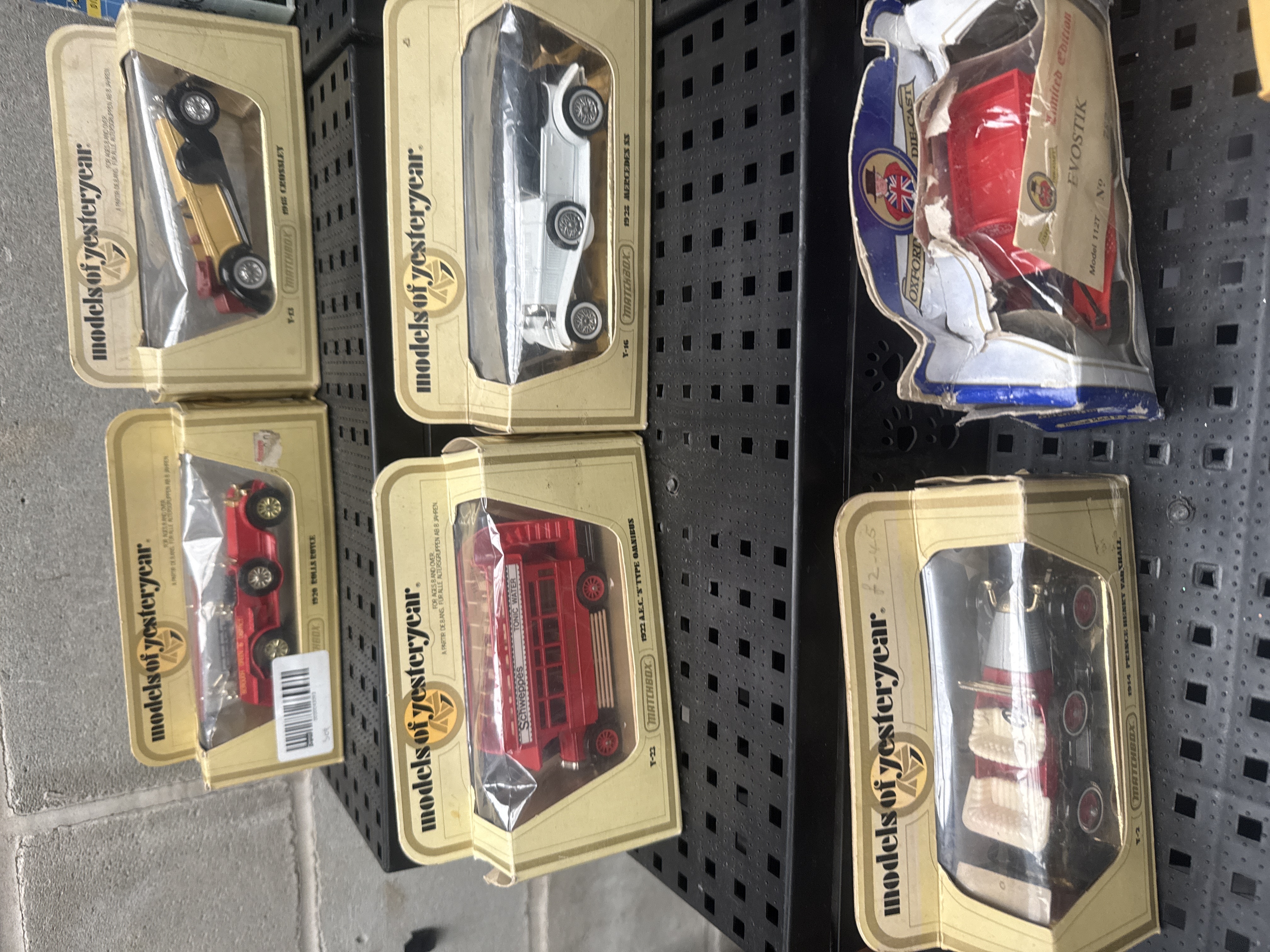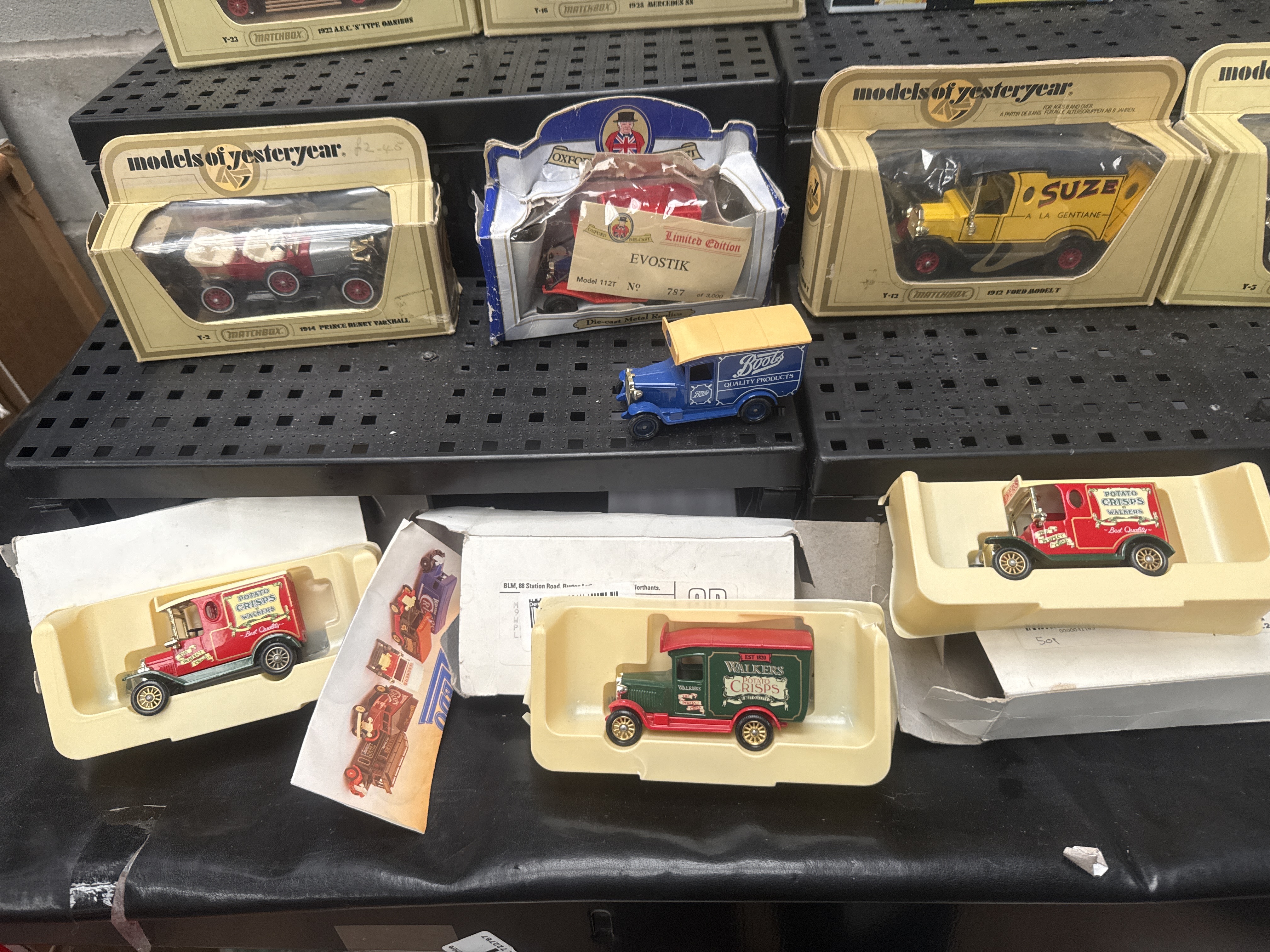 A collection of 16 die-cast model vehicles, primarily featuring the Matchbox Models of Yesteryear series. The group includes various vintage-style automobiles, commercial vans, and public transport vehicles from the early to mid-20th century. Identified models include a 1920 Rolls Royce, a 1922 AEC S Type Omnibus in Schweppes livery, a 1928 Mercedes SS, a 1912 Ford Model T in Suze livery, and a 1914 Prince Henry Vauxhall. The collection also features promotional vans with liveries for Boots and Walkers Potato Crisps. In addition to the Matchbox series, the lot contains four examples from the Classic Car Model Collection and a limited edition Oxford Die-Cast Evostik model. The vehicles are constructed from die-cast metal with plastic components. Most items are housed in their original window boxes or inner plastic display trays.
