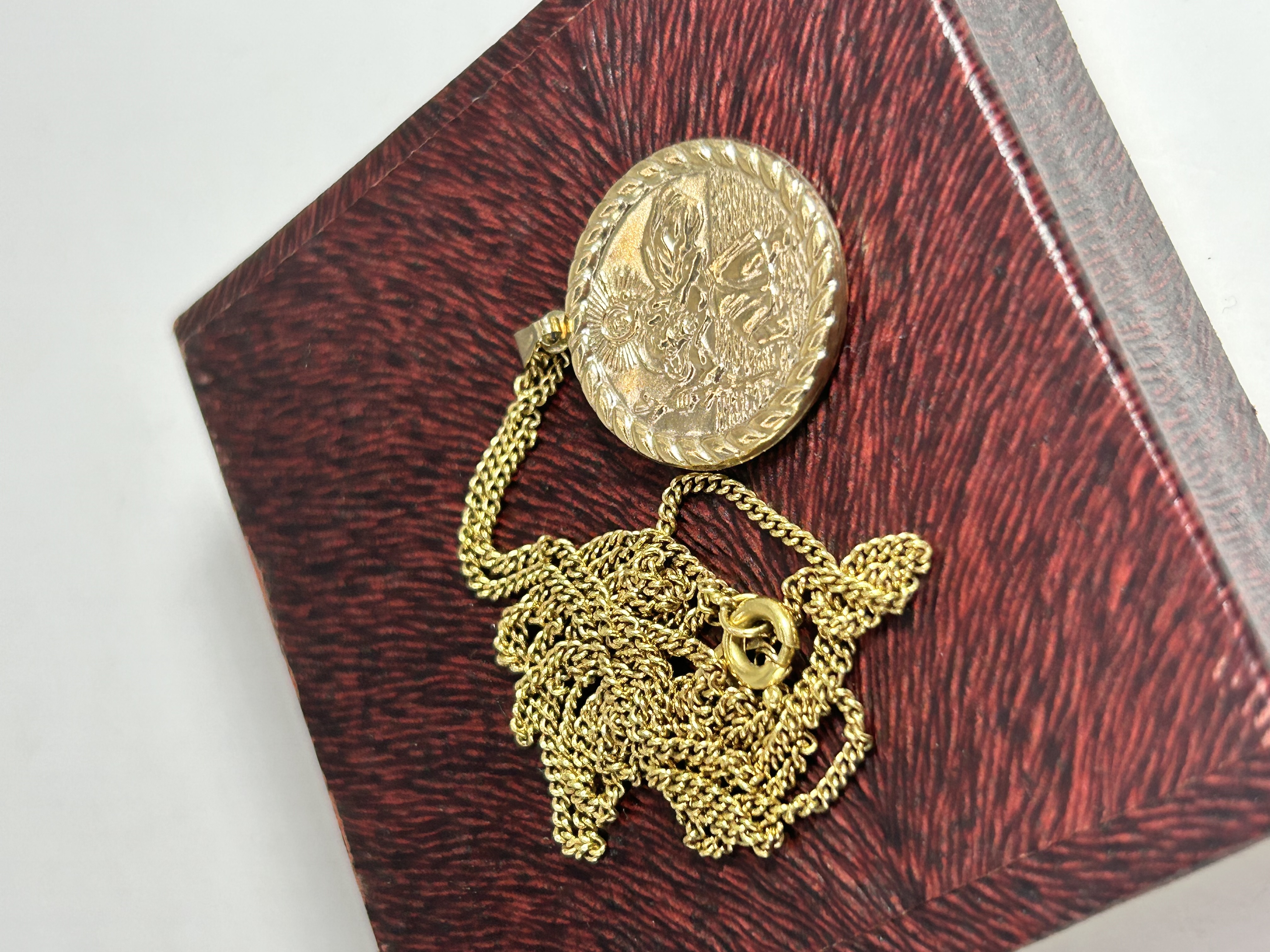 A 9ct gold circular medallion pendant featuring a relief depiction of a winged, haloed figure holding a staff, enclosed by a twisted-rope style border. The pendant is suspended by a tapered bail from a fine-gauge curb link chain equipped with a spring ring clasp. An illegible hallmark is present on the bail. The construction and style are consistent with Edwardian era jewelry.