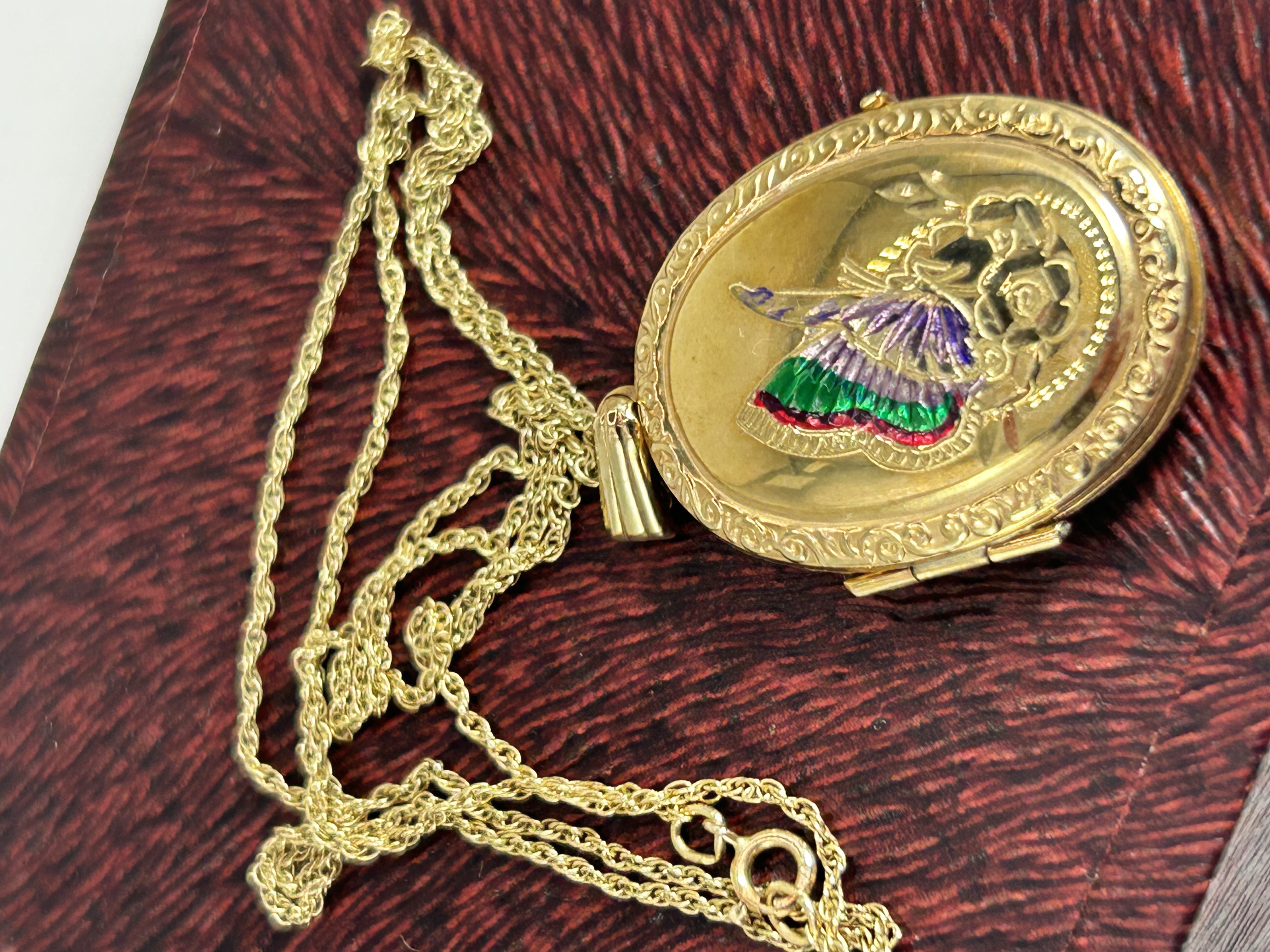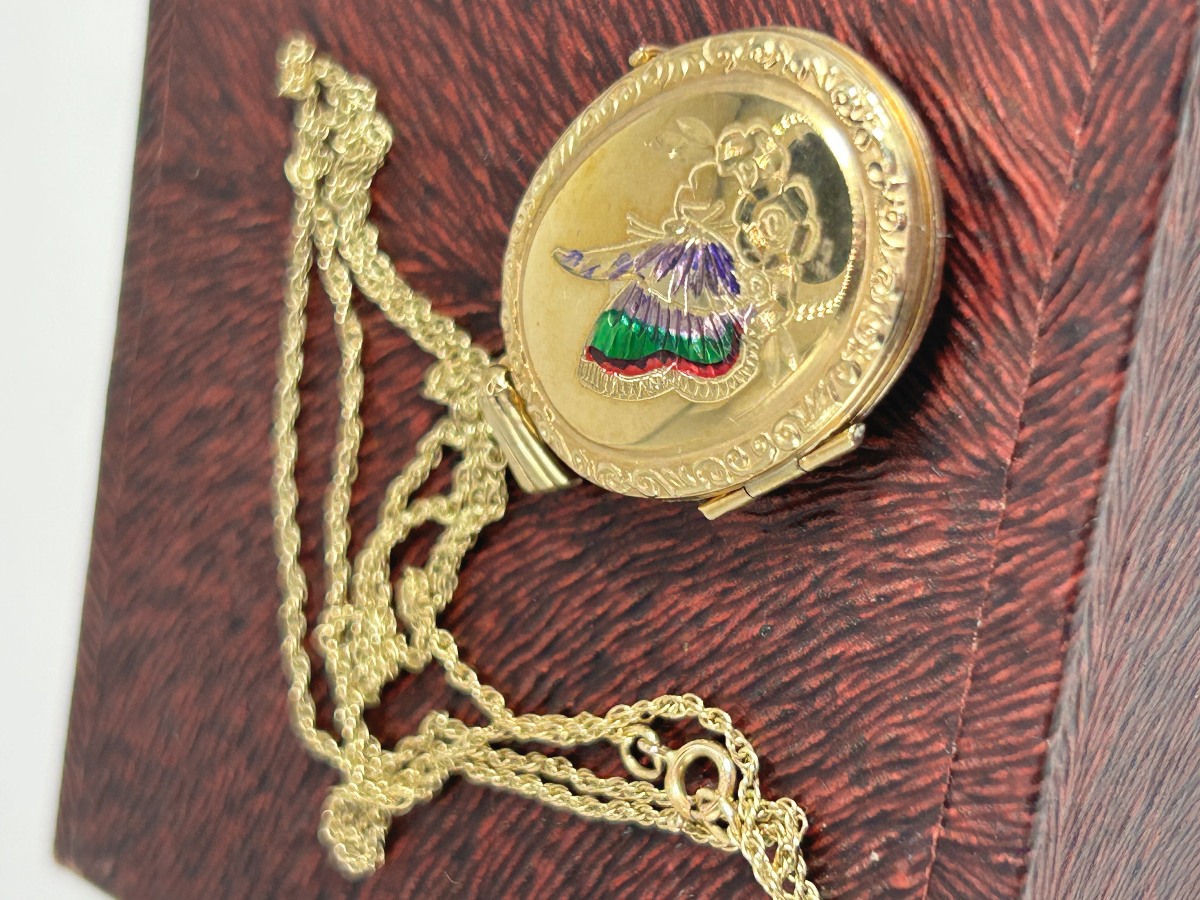 This lot features a vintage-style 9ct gold oval locket paired with a matching rope-link chain. The front of the locket displays a central motif featuring a female figure in a multi-colored, tiered dress accented with purple, green, and red enamel. The figure is framed by an ornate, engraved foliate border. The pendant is suspended by a simple bail from the 9ct gold chain, which is fitted with a spring-ring closure.