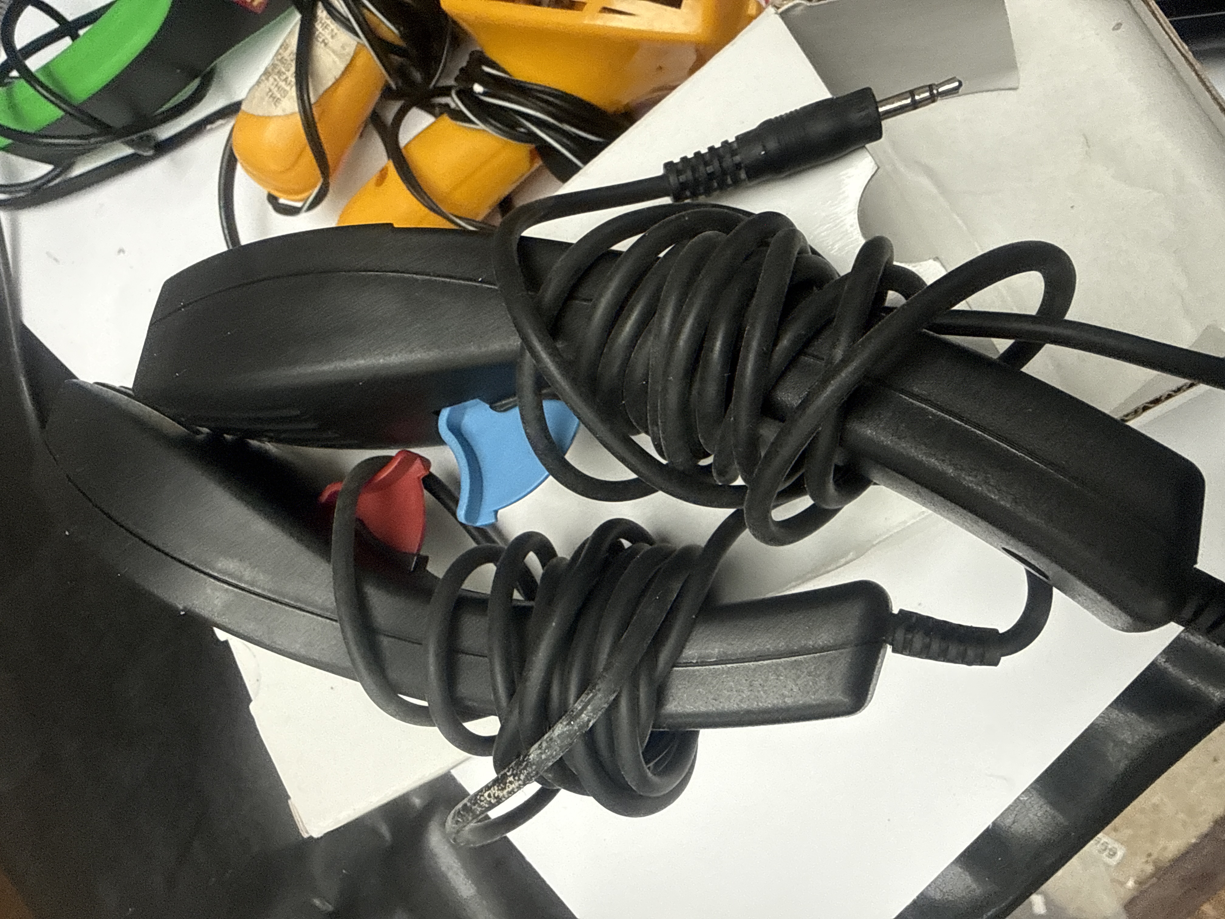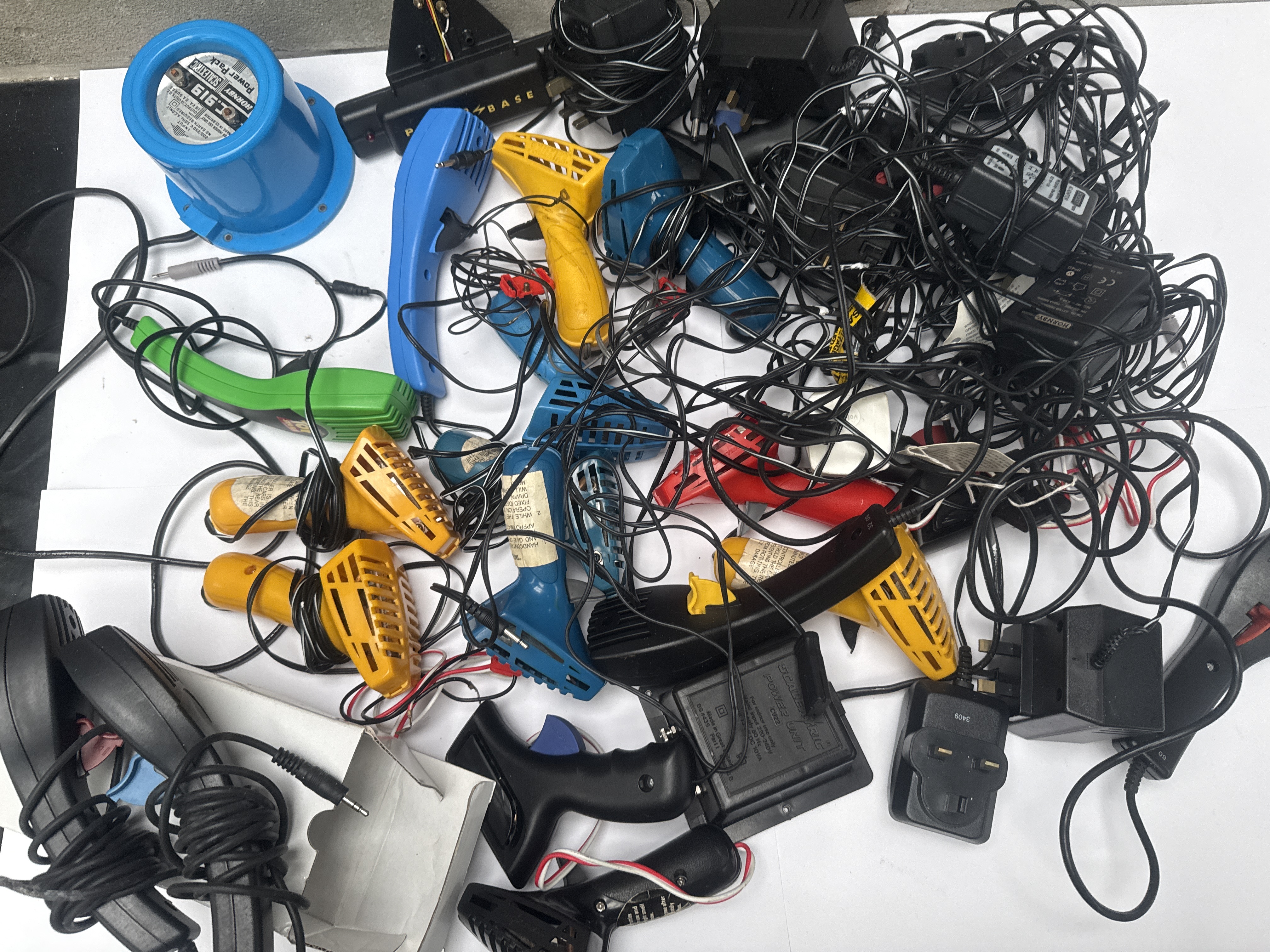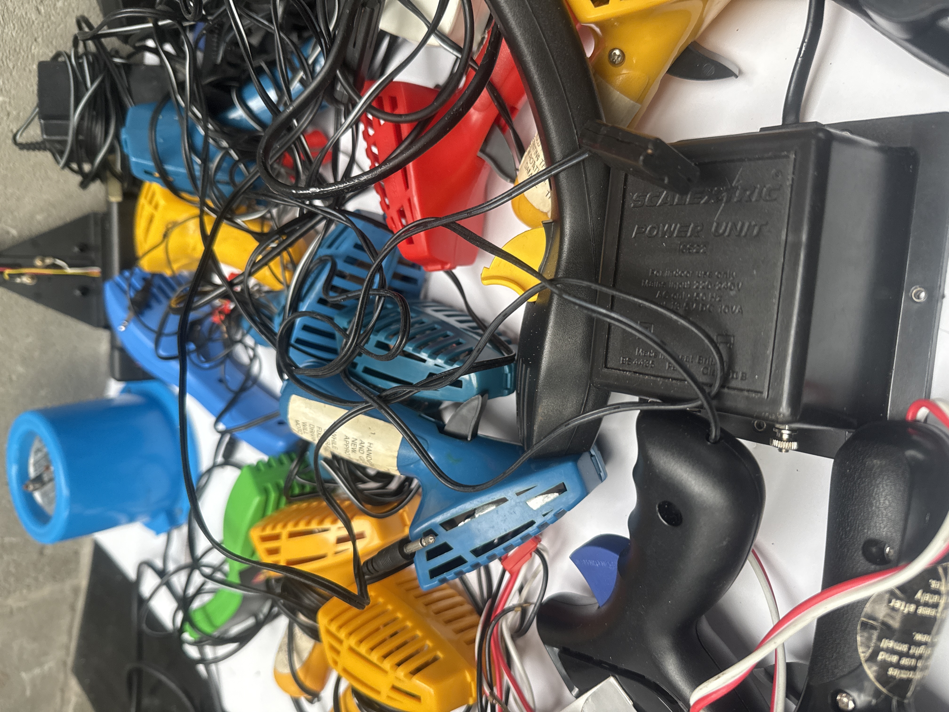 A collection of vintage and contemporary Scalextric and Hornby slot car racing accessories. The group comprises multiple pistol-grip hand controllers in various colors including yellow, blue, green, red, and black. Electrical components include assorted AC power adapters, a black Scalextric Power Unit (model C922), and a large blue cylindrical Scalextric Power Pack. The items are constructed primarily of molded plastic with integrated electrical wiring and metal connectors. Visible markings include brand logos and technical specifications for the power units.