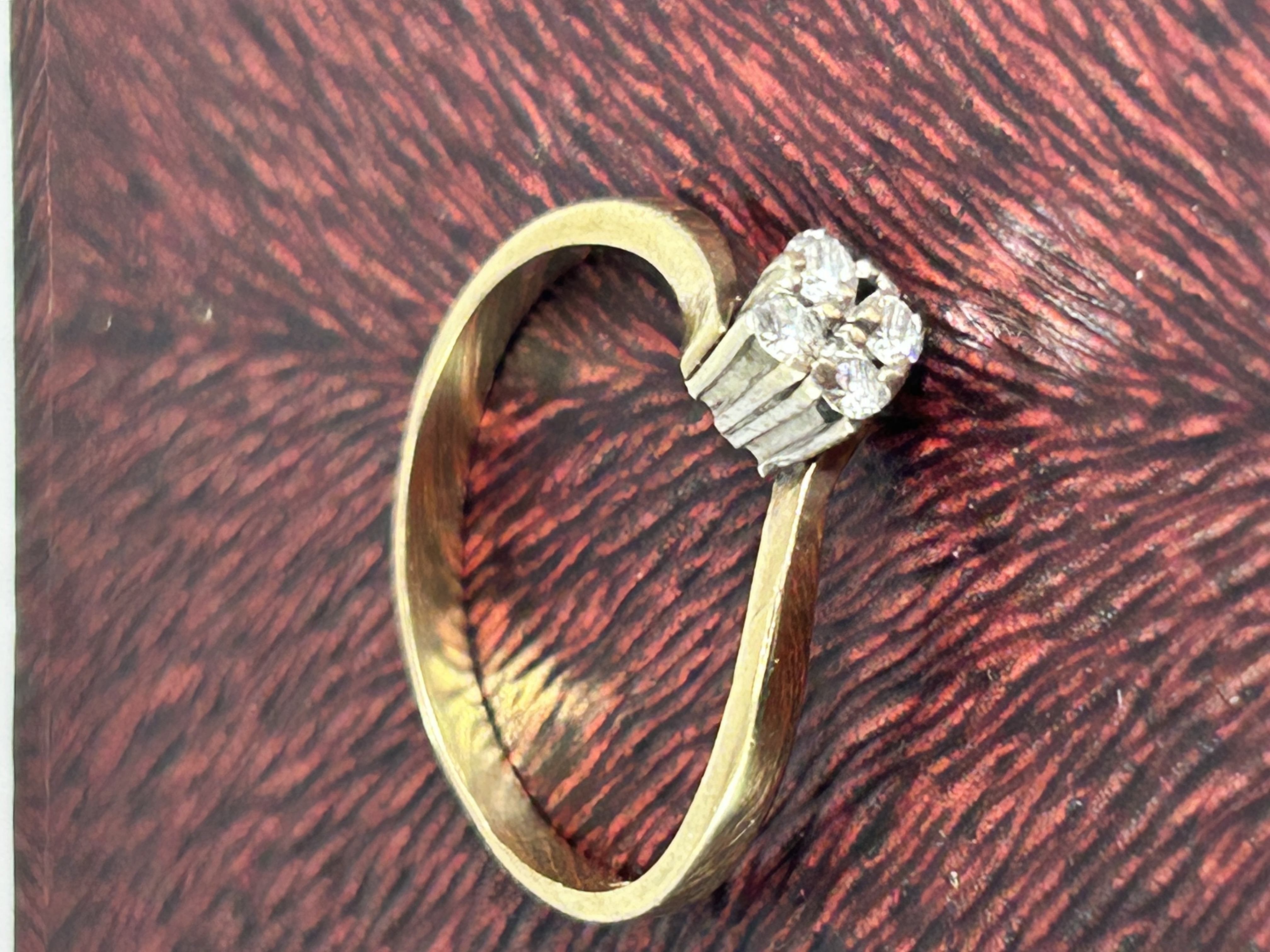 A 9ct gold diamond cluster ring featuring a bypass-style band. The head of the ring is constructed with a tiered white metal setting housing several round brilliant-cut diamonds arranged in a square cluster. The interior of the band is hallmarked 14K and bears the maker mark LTD.