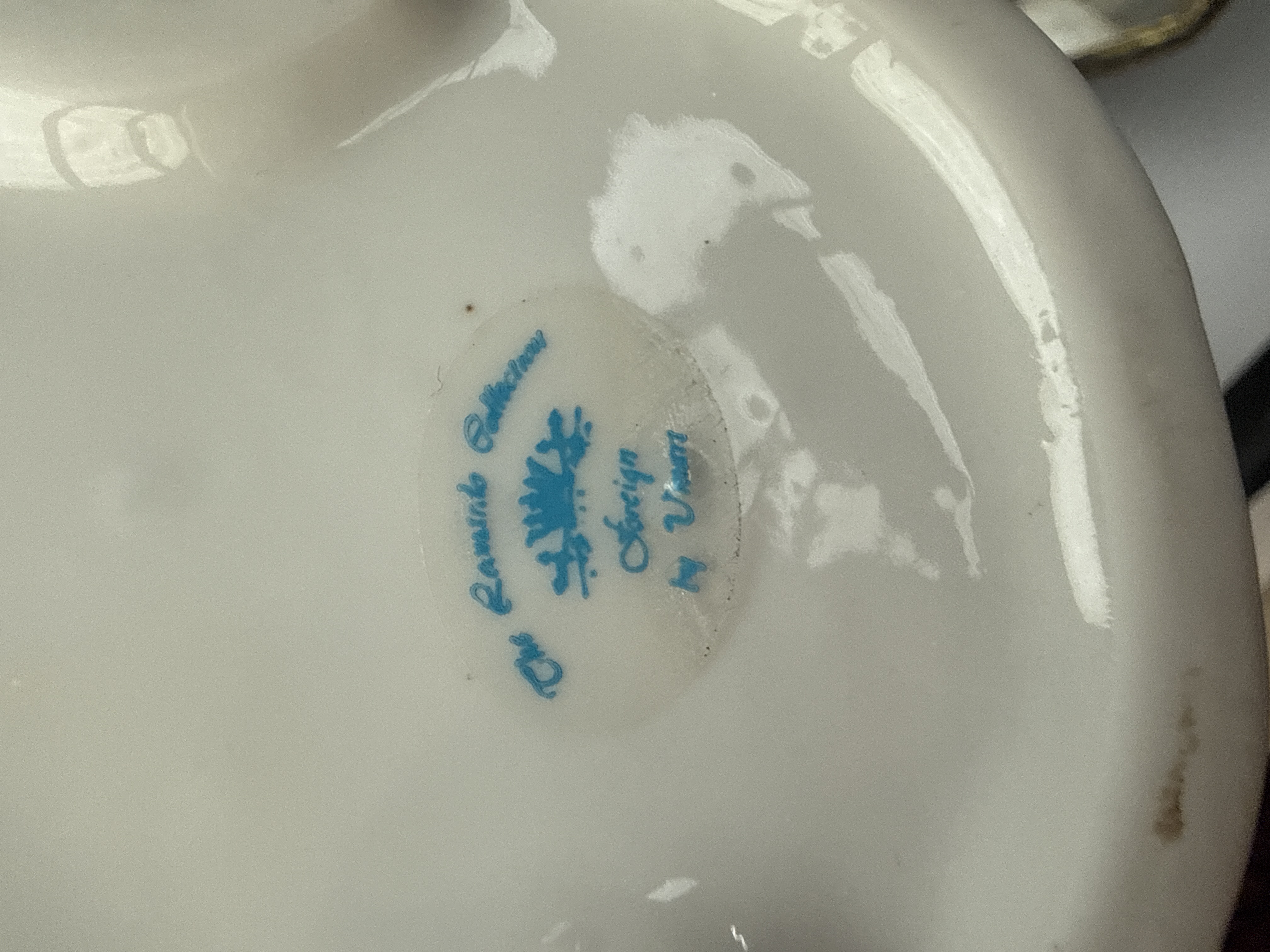 This lot comprises 12 vintage decorative and vanity objects. Included is a porcelain figurine depicting a lady in a blue and white gown holding a parasol. The collection features several white porcelain vanity items decorated with pink floral transfers and gilt rims, including an atomizer perfume bottle, two vases, a bell, a lidded jar, a small pitcher, and a bowl. Select porcelain pieces are marked on the underside in blue with The Romantic Collection Foreign by V… . The lot further includes a vanity set consisting of a hand mirror, a hairbrush, and a clothes brush, each featuring embroidered floral panels under protective covers within ornate gold-tone metal frames. These items are accompanied by a matching glass-topped tray with a lace insert and metal gallery.
