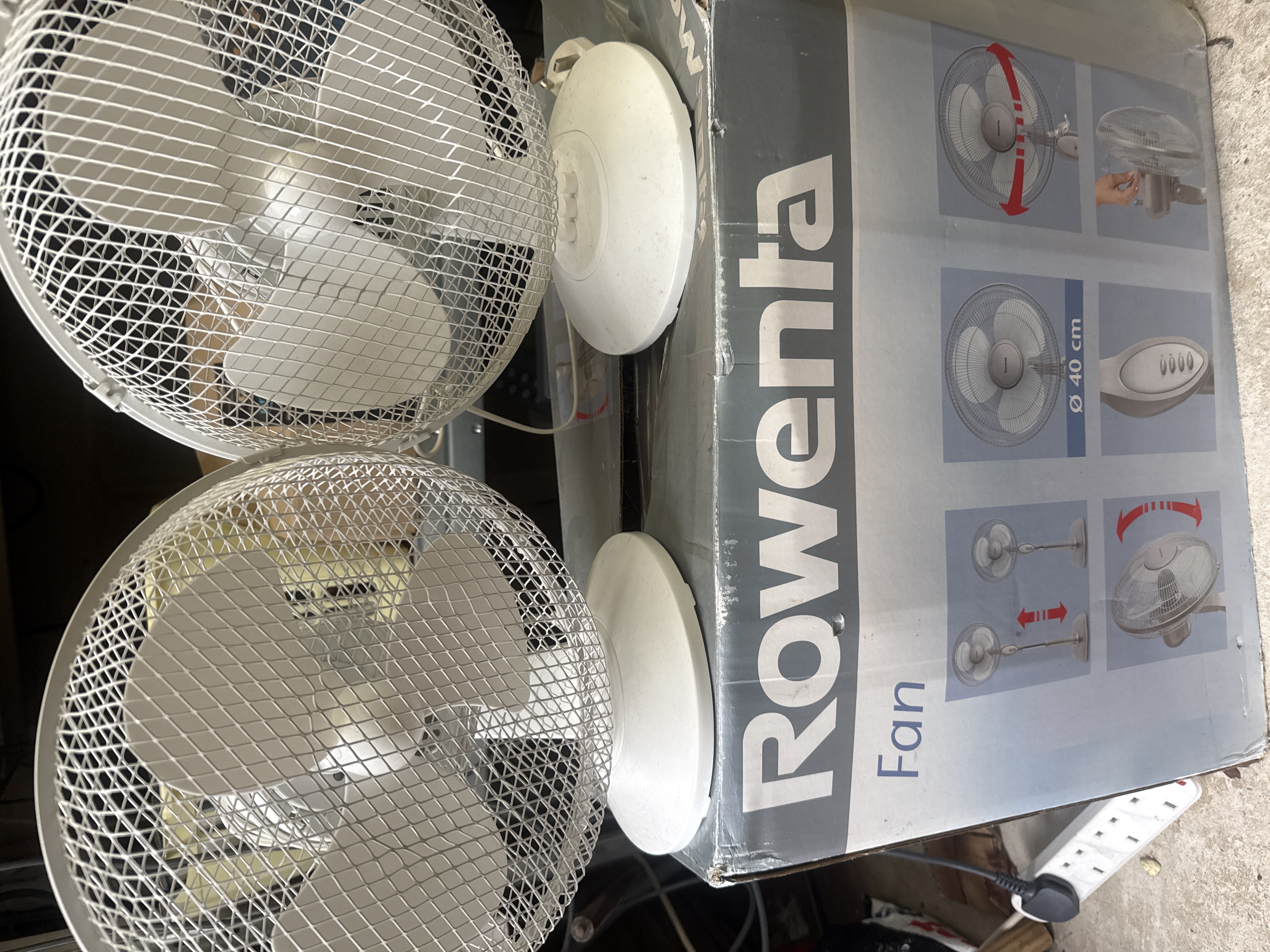 Three Rowenta Turbo Silence series electric oscillating fans. Each unit is constructed with a white plastic housing and a three-blade fan assembly. The fans are enclosed within circular white metal wire safety cages. The lot includes original manufacturer cardboard packaging featuring the Rowenta logo and product illustrations. The packaging indicates a fan diameter of 40 cm.