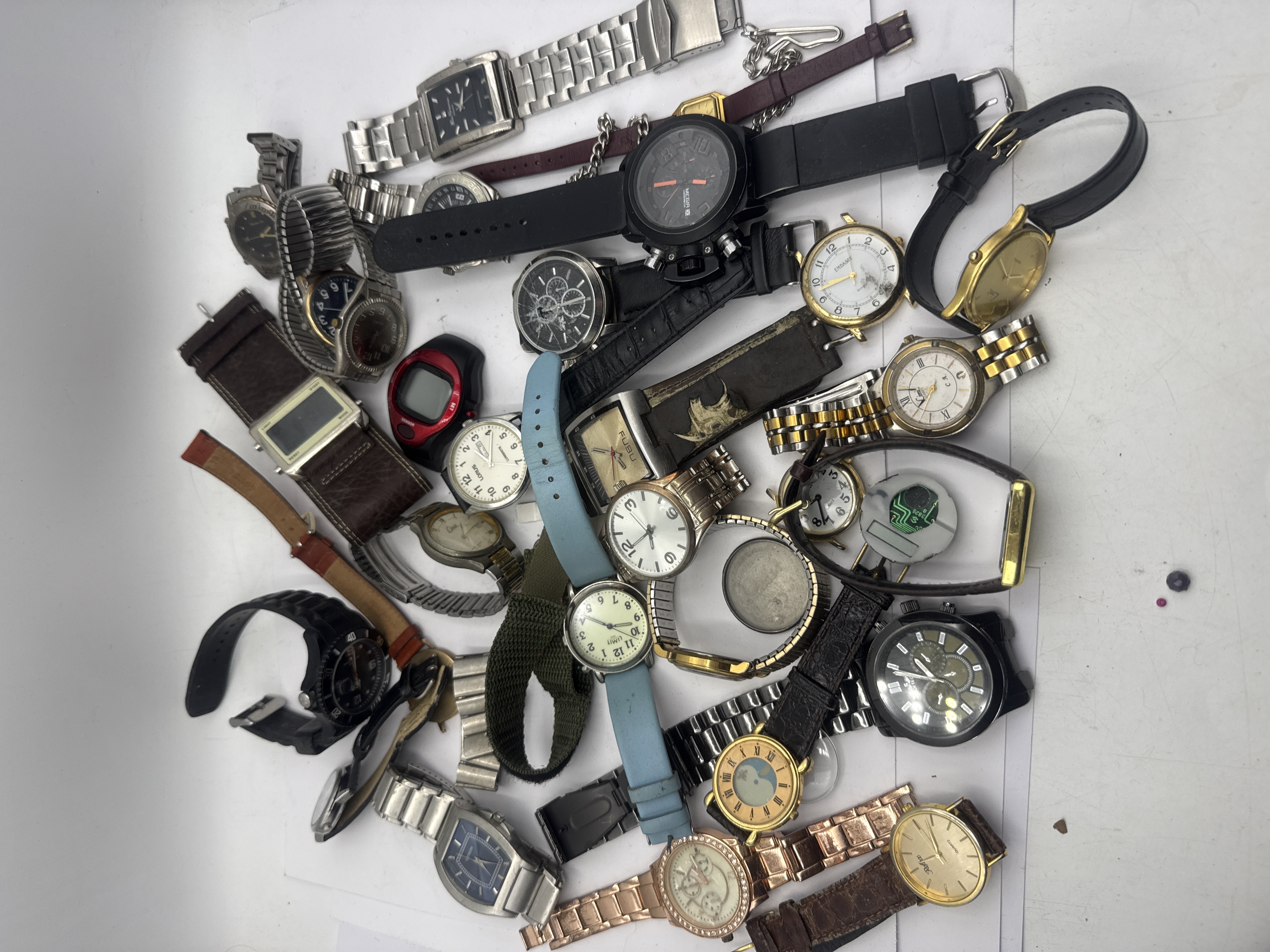 An assortment of analog and digital wristwatches in various styles including dress watches, chronographs, and sports models. The collection features a variety of brands such as Megir, Lorus, Embassy, FUBU, and Limit, with several dials marked Quartz. Construction materials include stainless steel, gold-tone metal, leather, rubber, and fabric straps. The lot contains a range of case shapes including round, rectangular, and oversized designs with dial colors in white, black, blue, and gold.