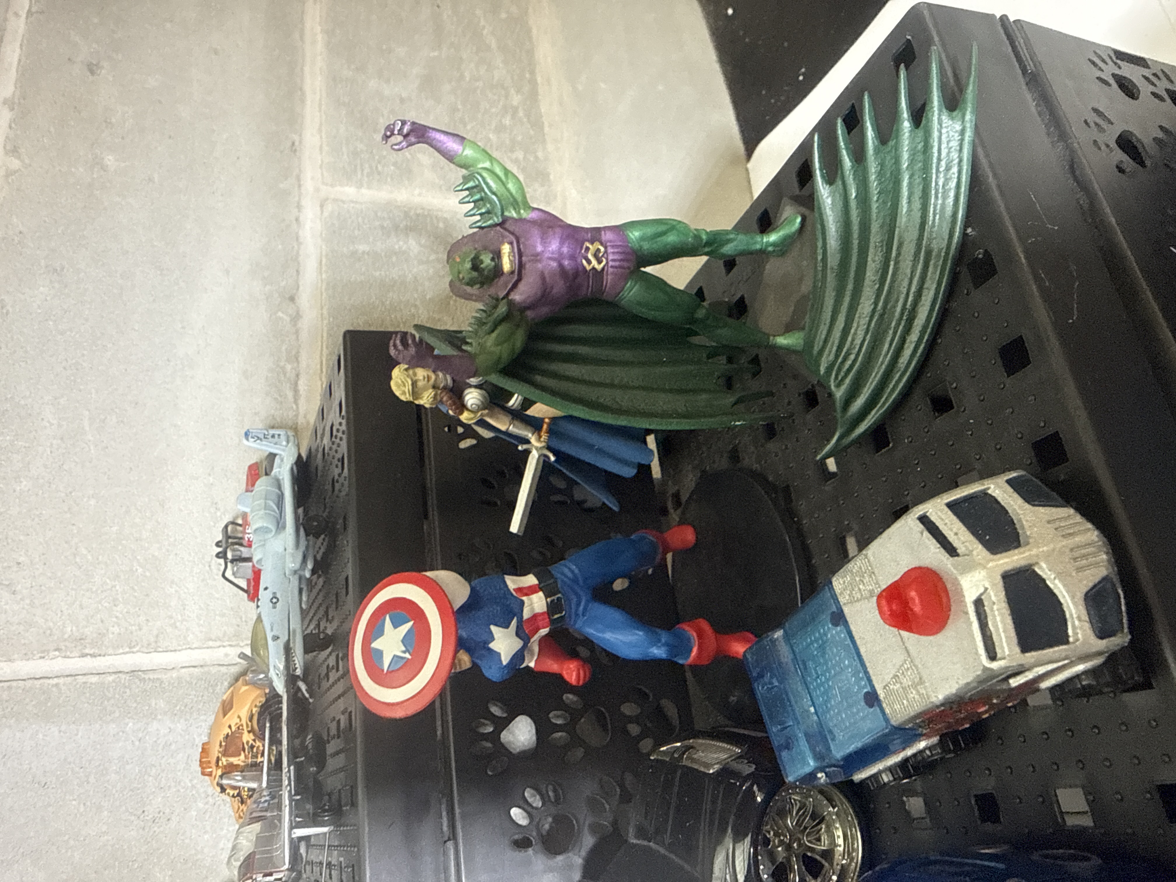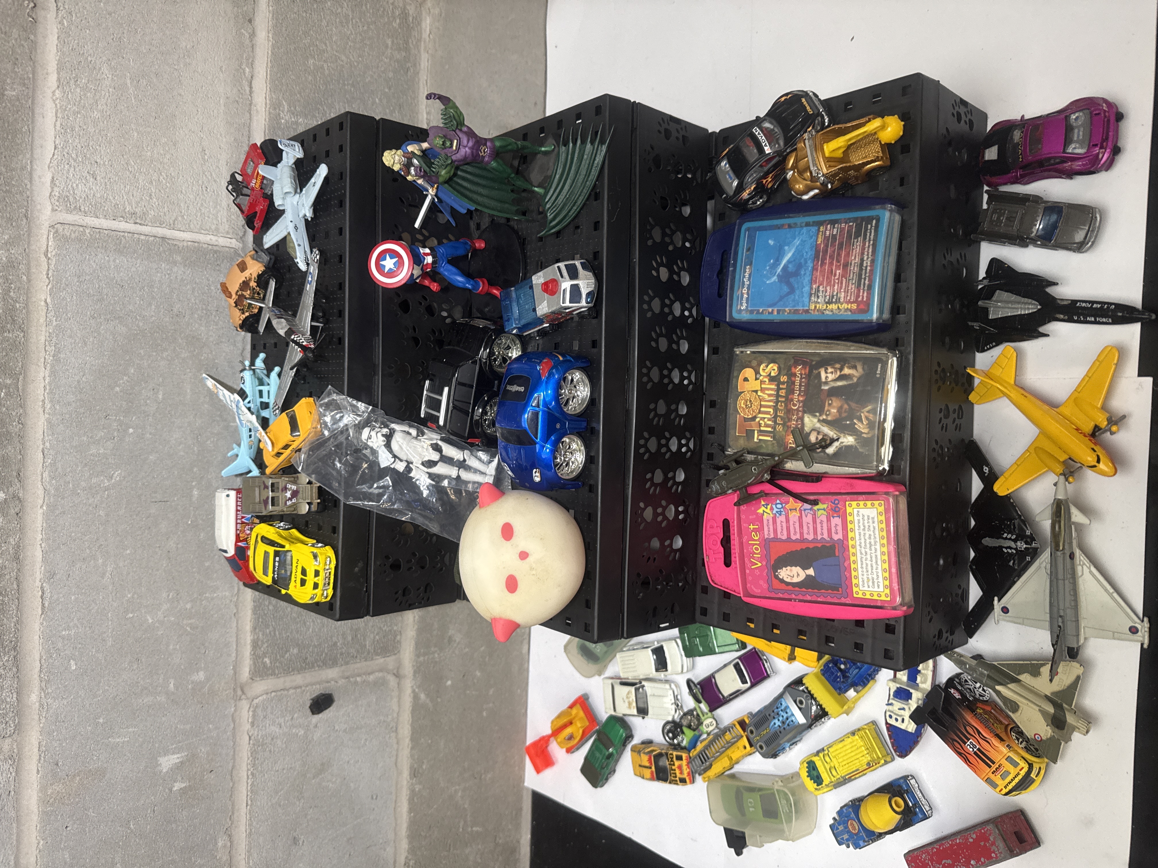 An assortment of various toys and collectibles featuring a collection of die cast vehicles in multiple scales and colors. The vehicle selection includes cars and trucks with racing decals such as ADVAN, alongside military and commercial aircraft including jets with U.S. AIR FORCE markings. Action figures within the lot include Marvel characters Captain America and Thor, and a Star Wars Stormtrooper figure. The collection also contains card games, specifically Top Trumps Specials Pirates of the Caribbean and a Violet character case. The items are constructed from die cast metal, molded plastic, and cardboard. The lot is presented on several black plastic perforated display stands featuring a paw-print motif, consistent with J Jackcube Design storage racks.