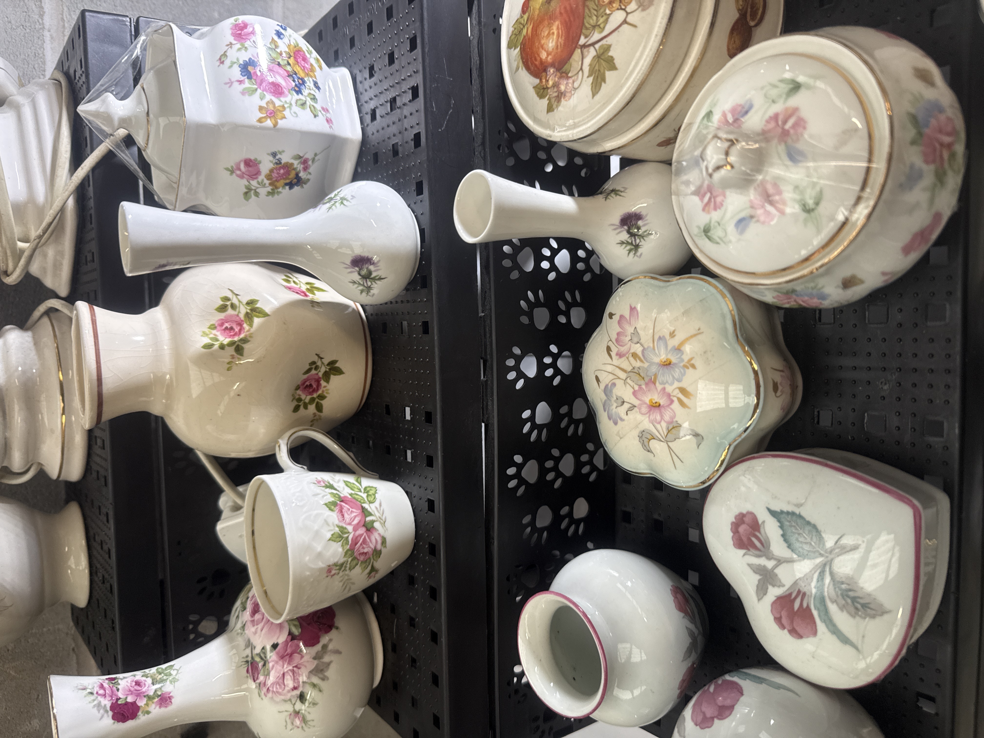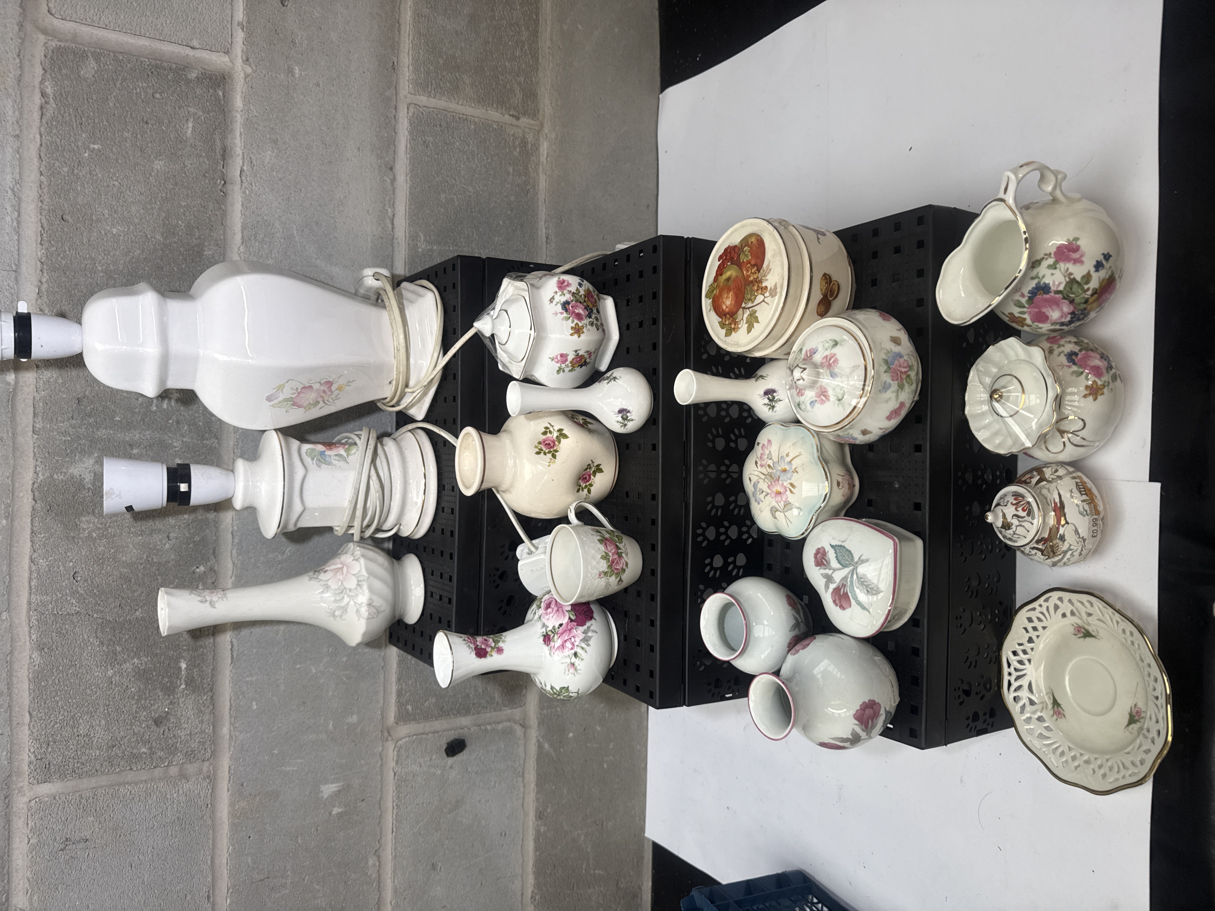 A collection of porcelain and ceramic decorative and functional items featuring various floral transfer motifs including roses and wildflowers. The assortment includes two white-glazed table lamps with floral decals, multiple bud and baluster-form vases, several lidded canisters and jars, and trinket boxes in heart and scalloped shapes. Also present are a small pitcher, a mug, and a reticulated saucer. The items feature white or cream base glazes, with several pieces displaying gilt-edged detailing. Patterns and makers identified within the group include Royal Albert Old Country Roses, Royal Doulton, Aynsley, and Johann Haviland, as well as Moss Rose and fruit-themed designs. The lamps retain their electrical cords and sockets.