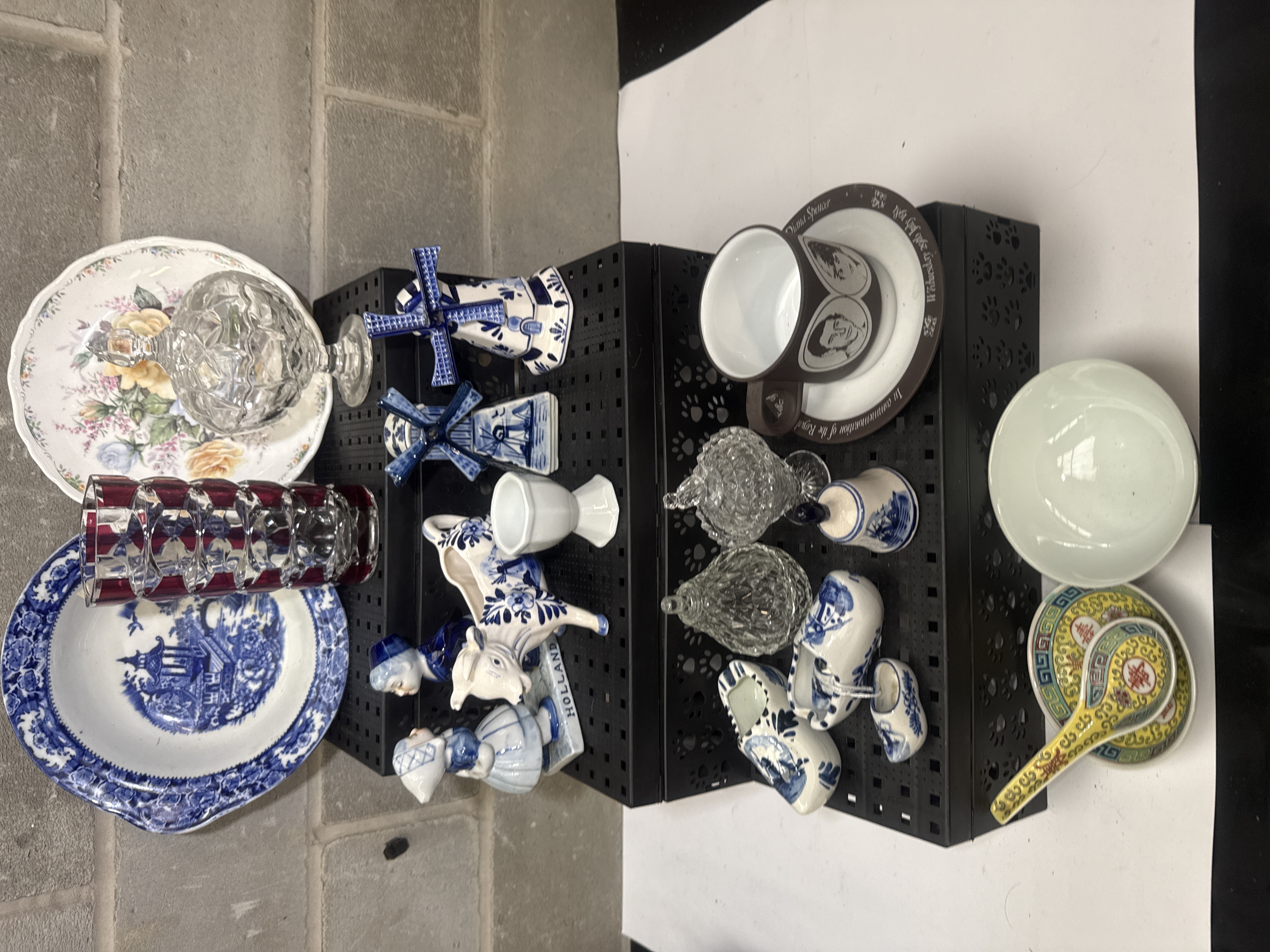 An assortment of decorative ceramics and glassware featuring several Delft Blue Holland style pieces. The ceramic collection includes two windmill figurines, a cow creamer marked HOLLAND, miniature clogs, and a Dutch figure. Also included is a brown-toned ceramic mug and saucer set commemorating the 1981 Royal Wedding of Prince Charles and Lady Diana Spencer. The glassware consists of a ruby red cut-to-clear glass vase, a faceted clear glass vessel, and various small decorative glass jars. Additional ceramic items include a floral-patterned plate, a Willow-pattern style transferware plate, and a yellow and green Asian-style bowl with a matching spoon. The pieces exhibit various decorative techniques including transfer printing, hand-painting, and glass cutting.