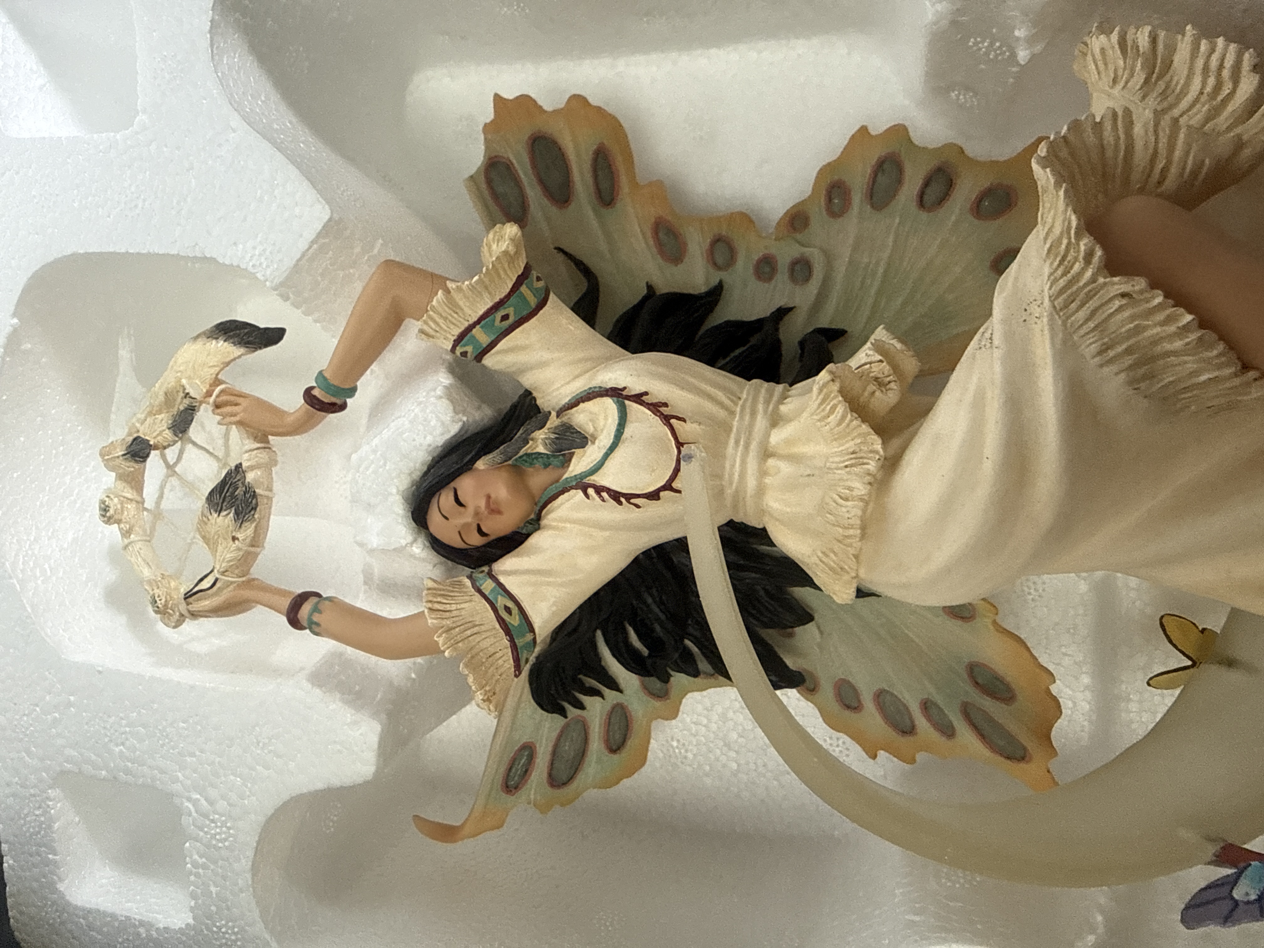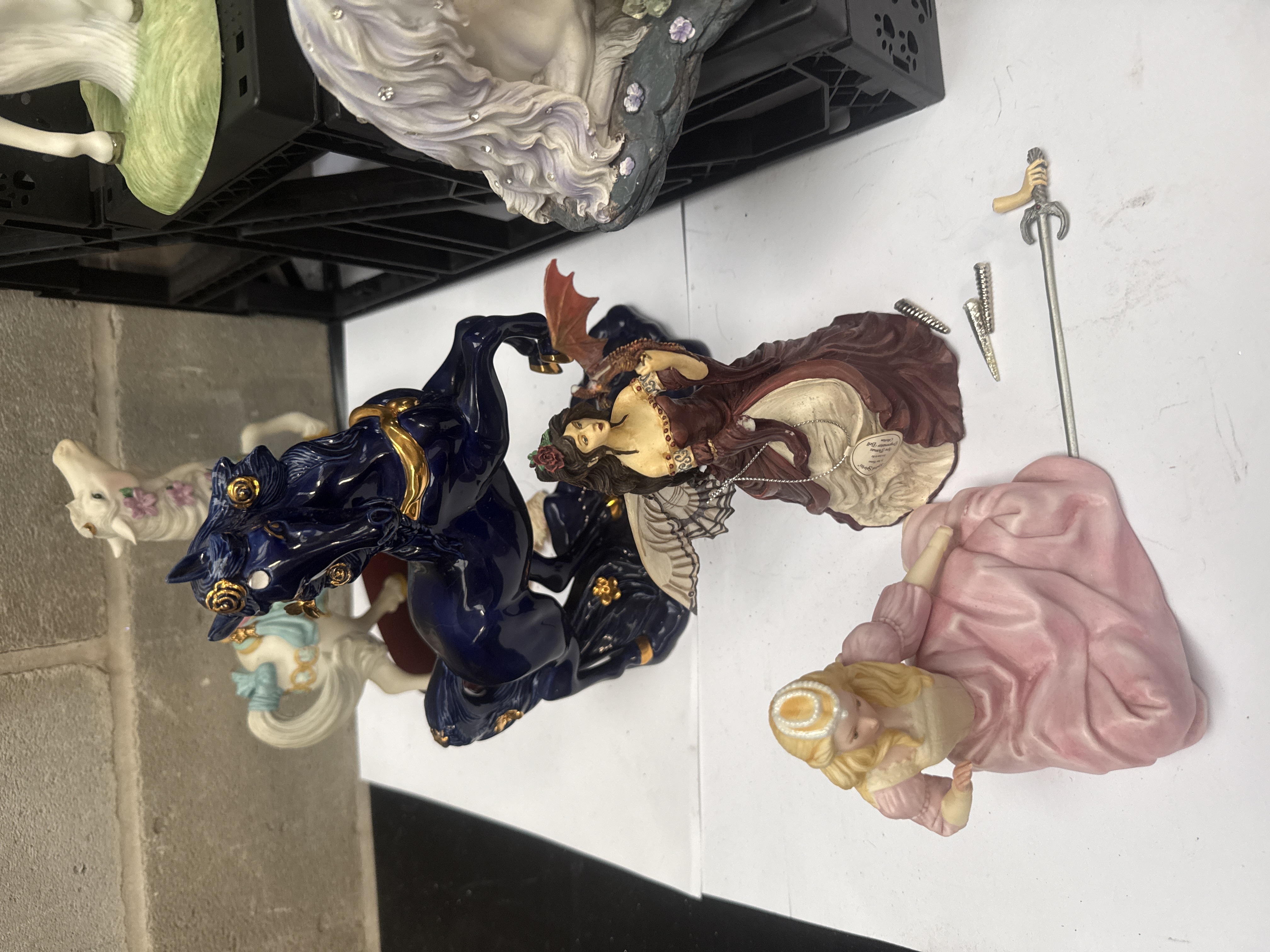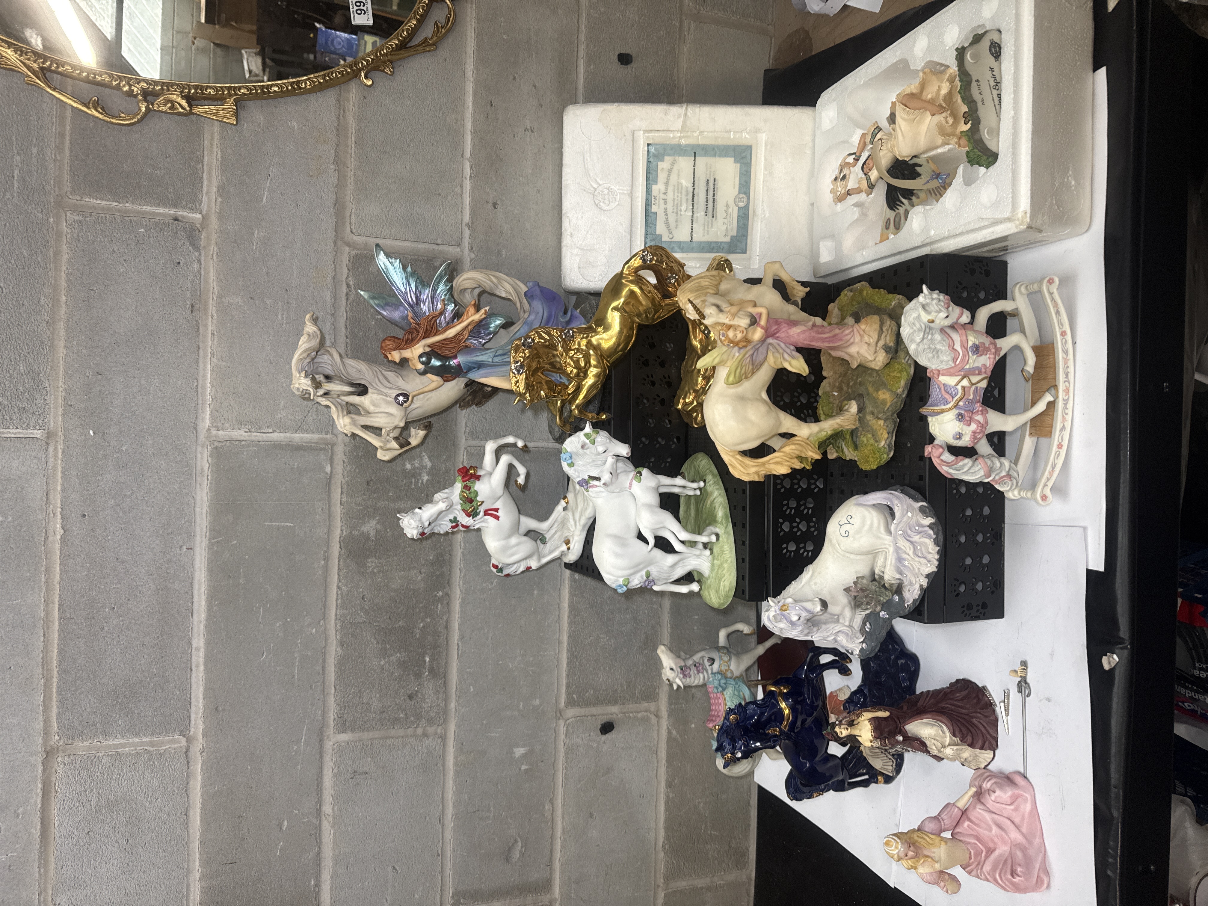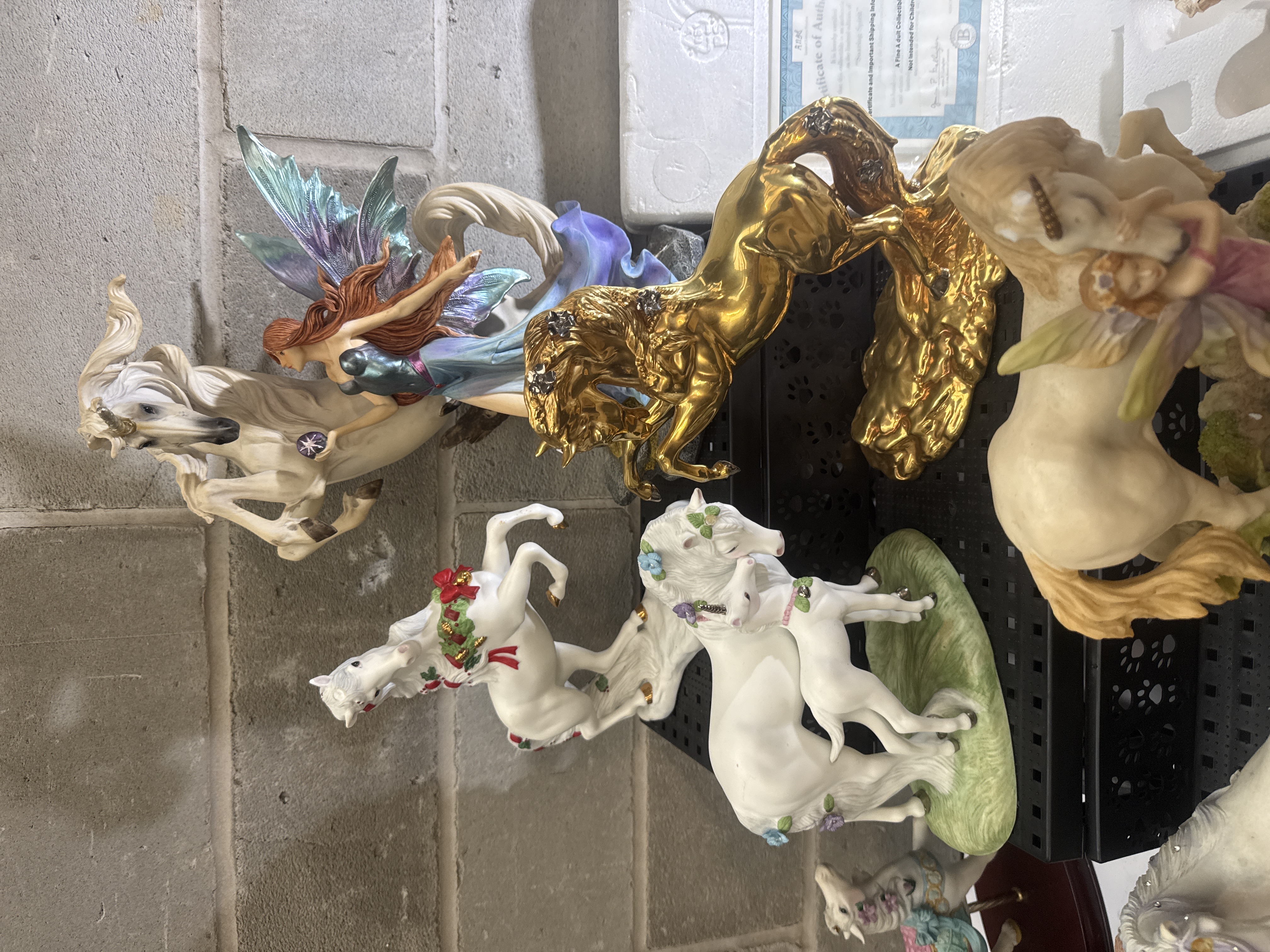 A collection of contemporary fantasy and mystical-themed figurines, including works attributed to Giuseppe Armani such as the Liberty, Swept Away, and Aurora sculptures, alongside pieces from the Morning Spirit and The Noble Spirit series. The group includes several unicorns in diverse finishes, including metallic gold, matte white with floral accents, and one featuring a holiday wreath. Also present are multiple fairy figurines with iridescent or patterned wings, including one in Native American-inspired attire holding a dreamcatcher and others in flowing gowns. The items are constructed from painted resin and porcelain, with some featuring embedded faux crystals and metallic highlights. Documentation includes a Certificate of Authenticity and tags for specific titles.