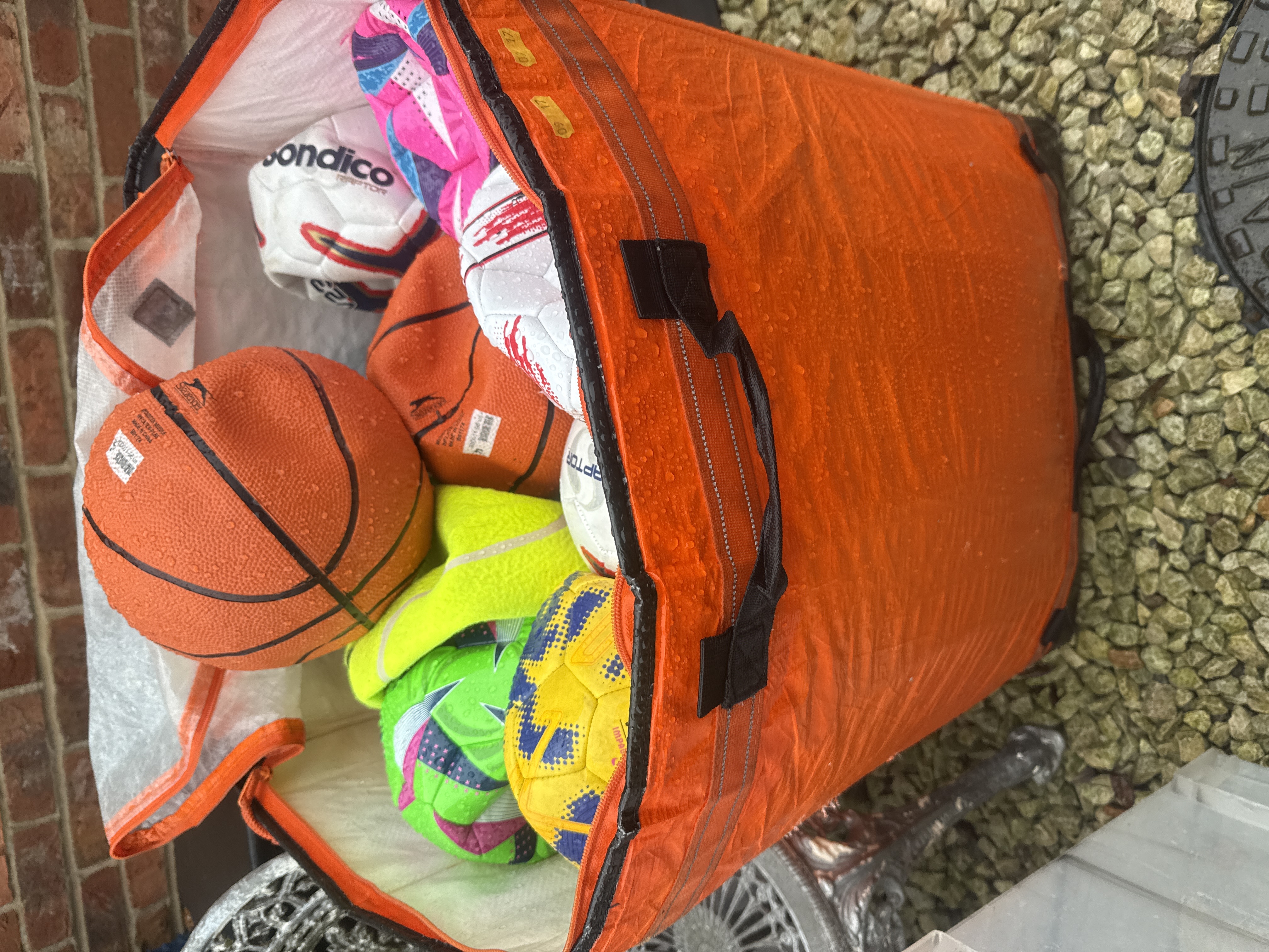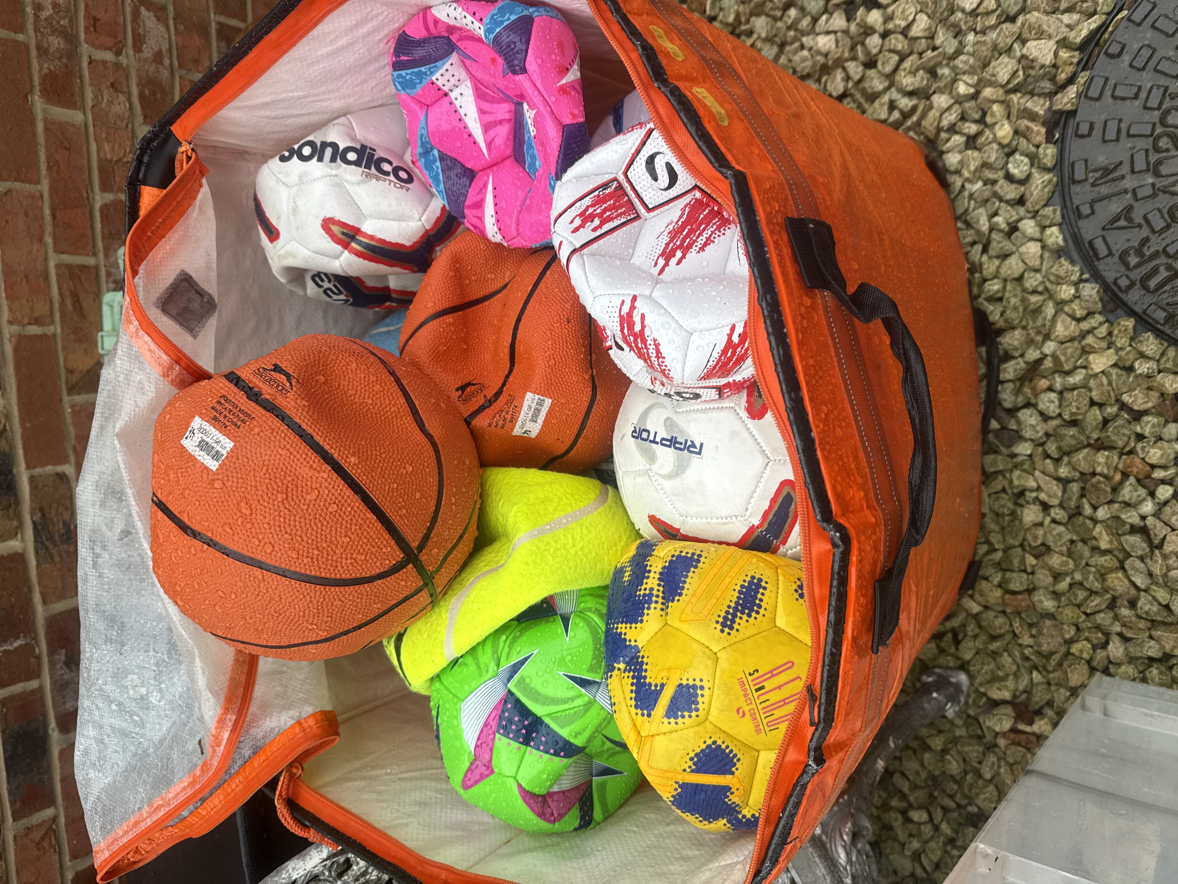 A collection of various sports balls including basketballs and soccer balls of differing sizes and designs. The lot features branding from manufacturers such as Slazenger, Sondico, and Raptor. The items are primarily constructed from synthetic materials. The orange zippered transport bag shown in the accompanying photography is not included in this lot.