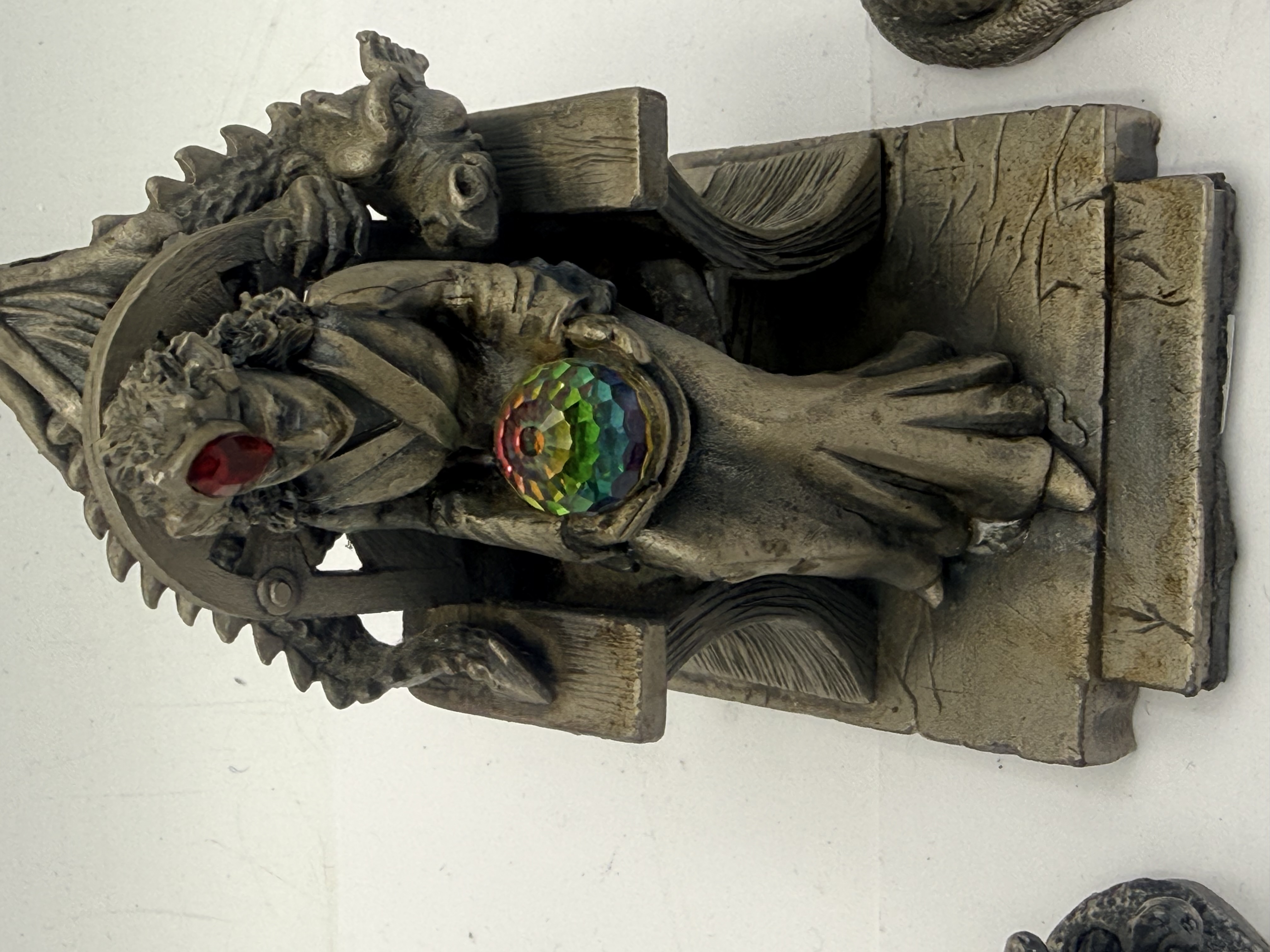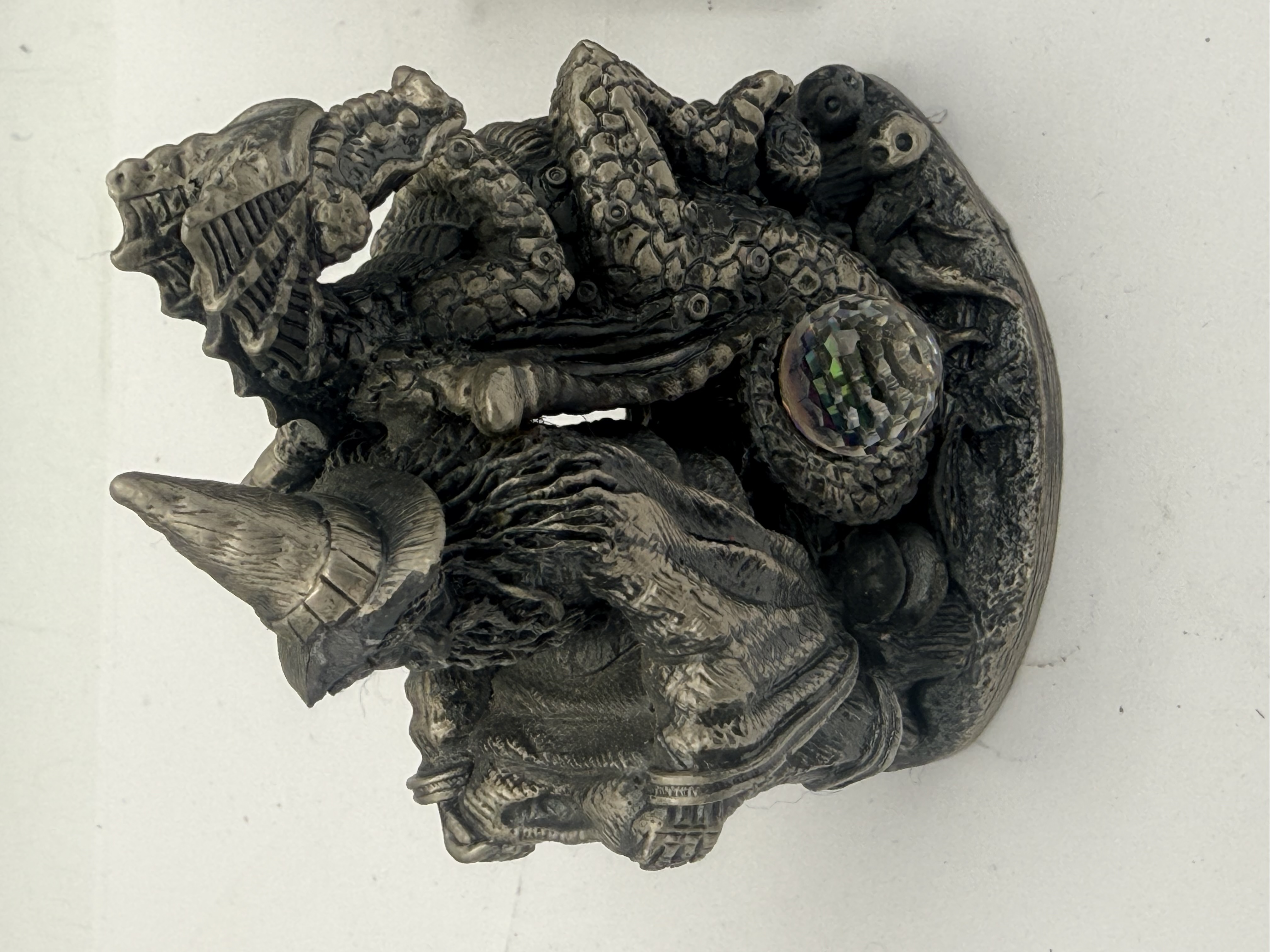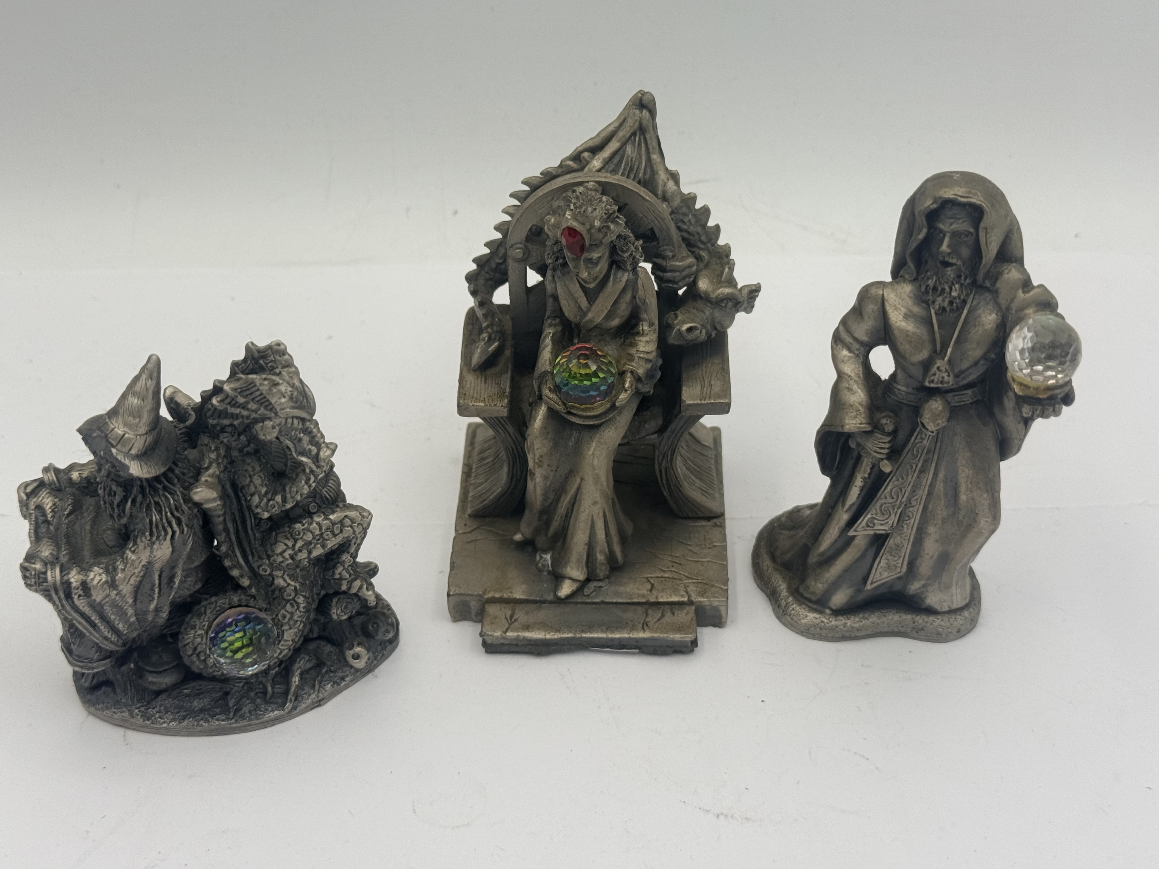 A trio of cast pewter figurines from the Myth and Magic series by Tudor Mint, produced by WAPW, U.K. The collection includes The Dragon Queen by A.G. Slocombe, depicting a figure on a dragon-themed throne set with a multi-colored faceted crystal orb and a red rhinestone accent. Also included is The Giant Sorcerer by Ray Ridge, shown as a hooded figure holding a clear faceted crystal orb, and Contemplation by Mark Locker, a 1996-1997 collectors club membership study piece featuring a wizard and dragon with an iridescent crystal orb. Each piece features intricate sculptural details and is marked on the underside with the title, artist name, and manufacturer information.