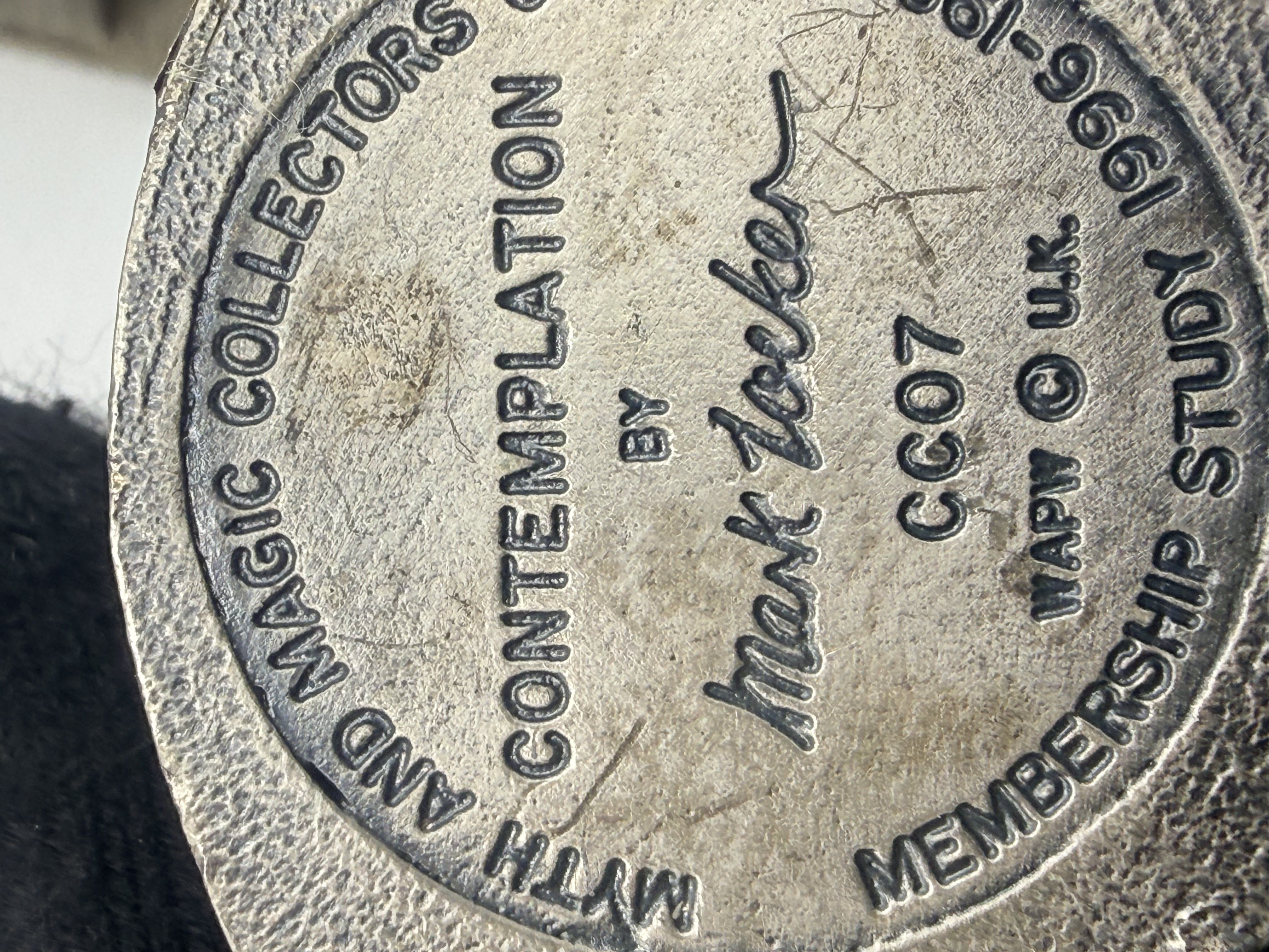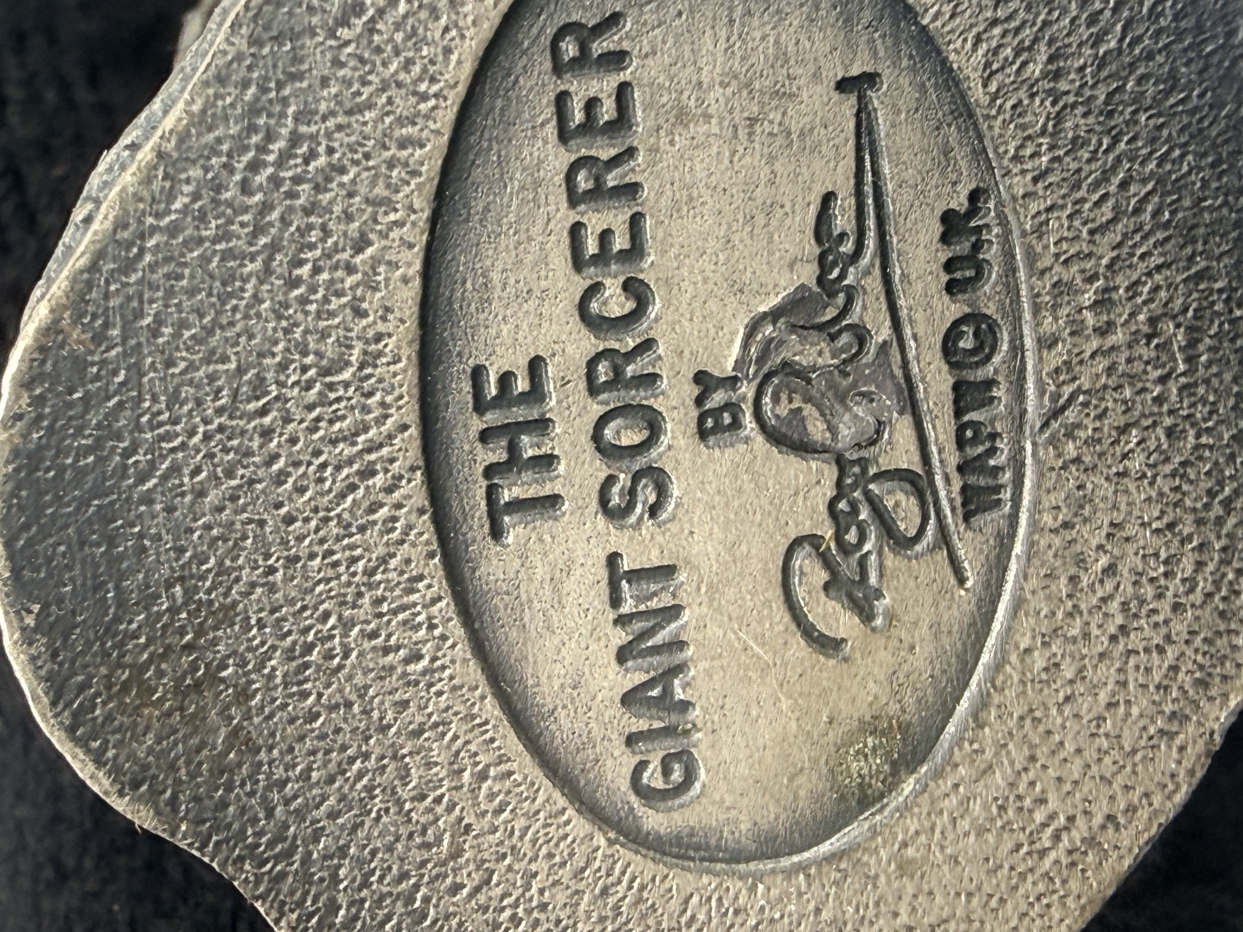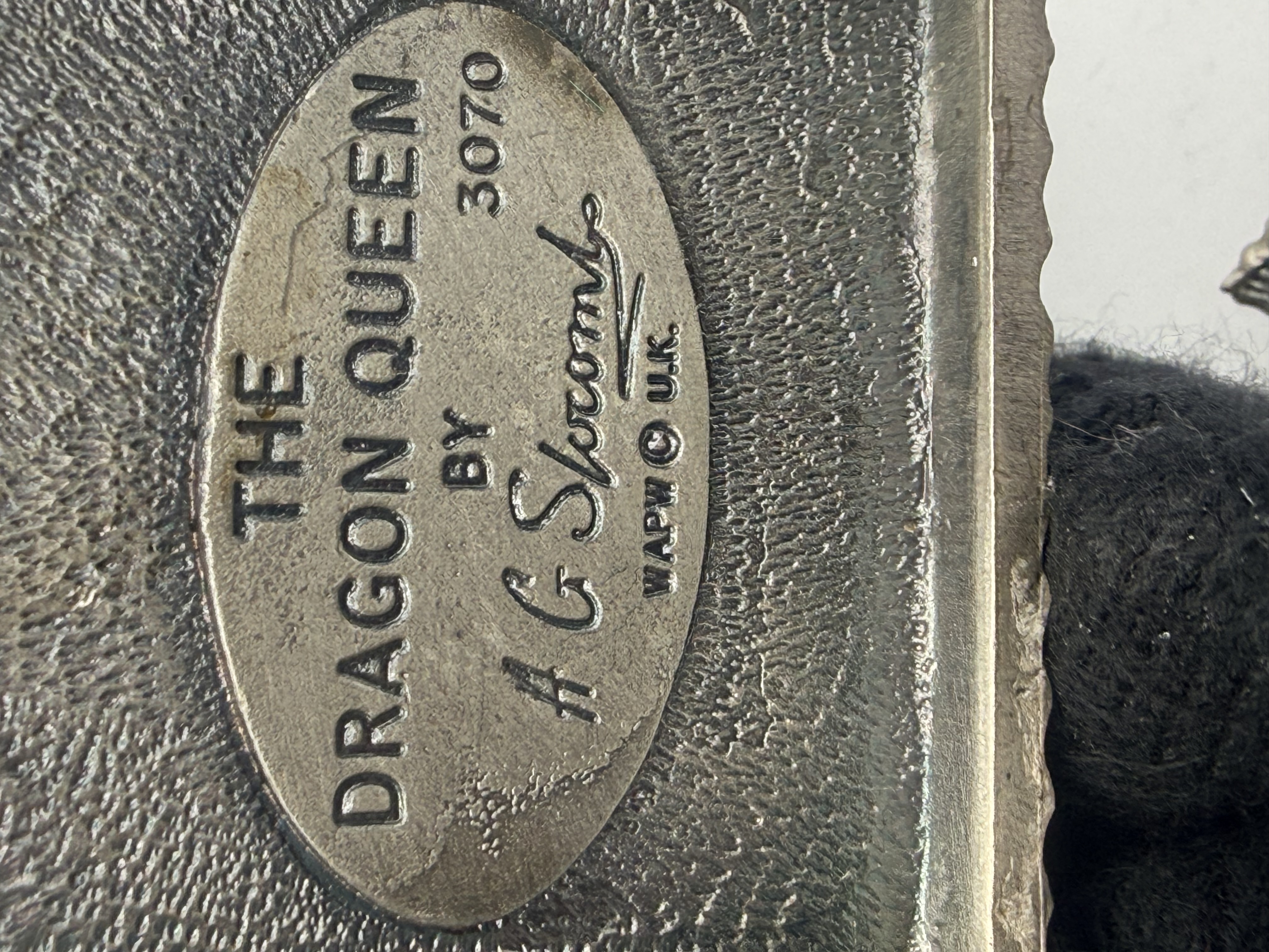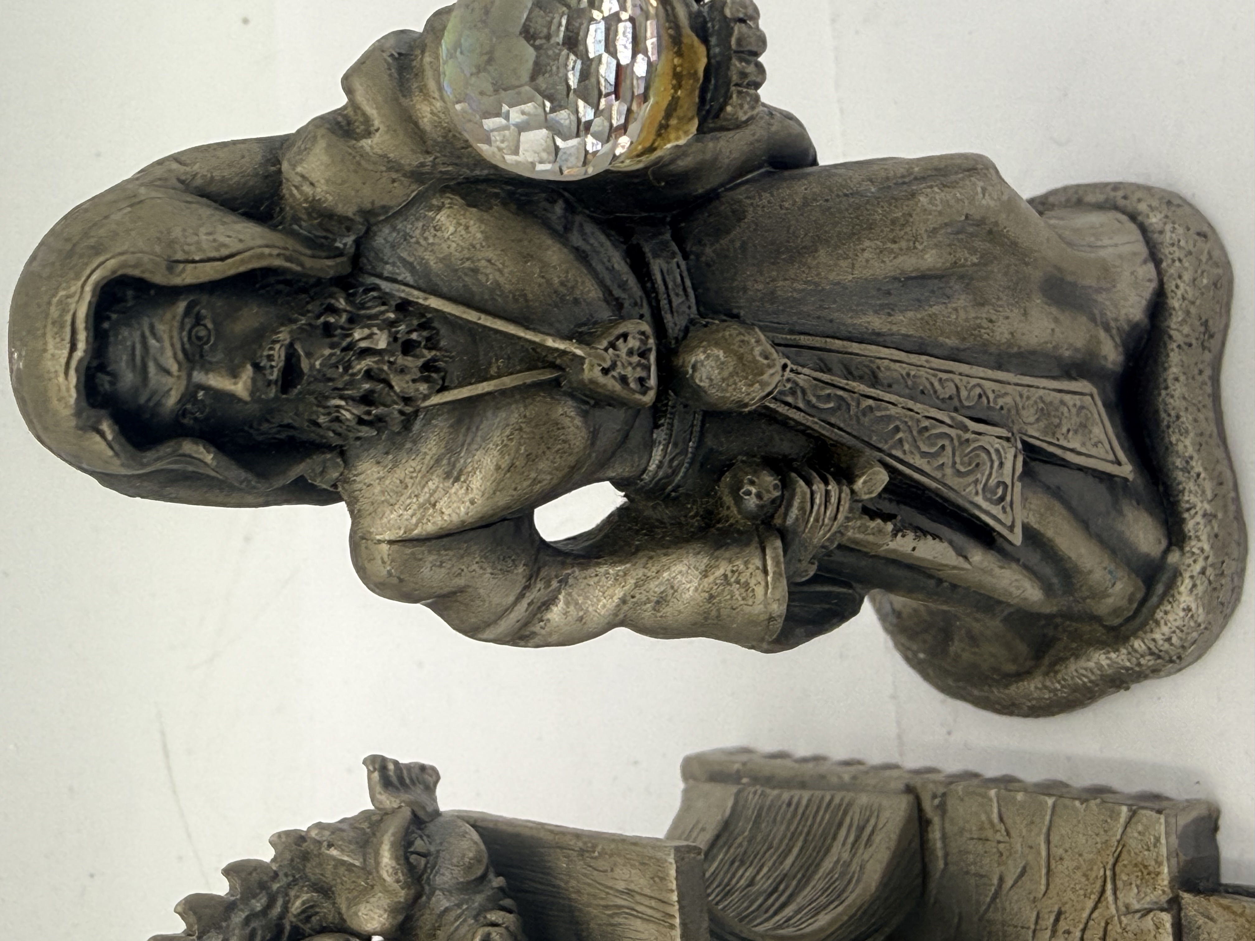 A trio of cast pewter figurines from the Myth and Magic series by Tudor Mint, produced by WAPW, U.K. The collection includes The Dragon Queen by A.G. Slocombe, depicting a figure on a dragon-themed throne set with a multi-colored faceted crystal orb and a red rhinestone accent. Also included is The Giant Sorcerer by Ray Ridge, shown as a hooded figure holding a clear faceted crystal orb, and Contemplation by Mark Locker, a 1996-1997 collectors club membership study piece featuring a wizard and dragon with an iridescent crystal orb. Each piece features intricate sculptural details and is marked on the underside with the title, artist name, and manufacturer information.