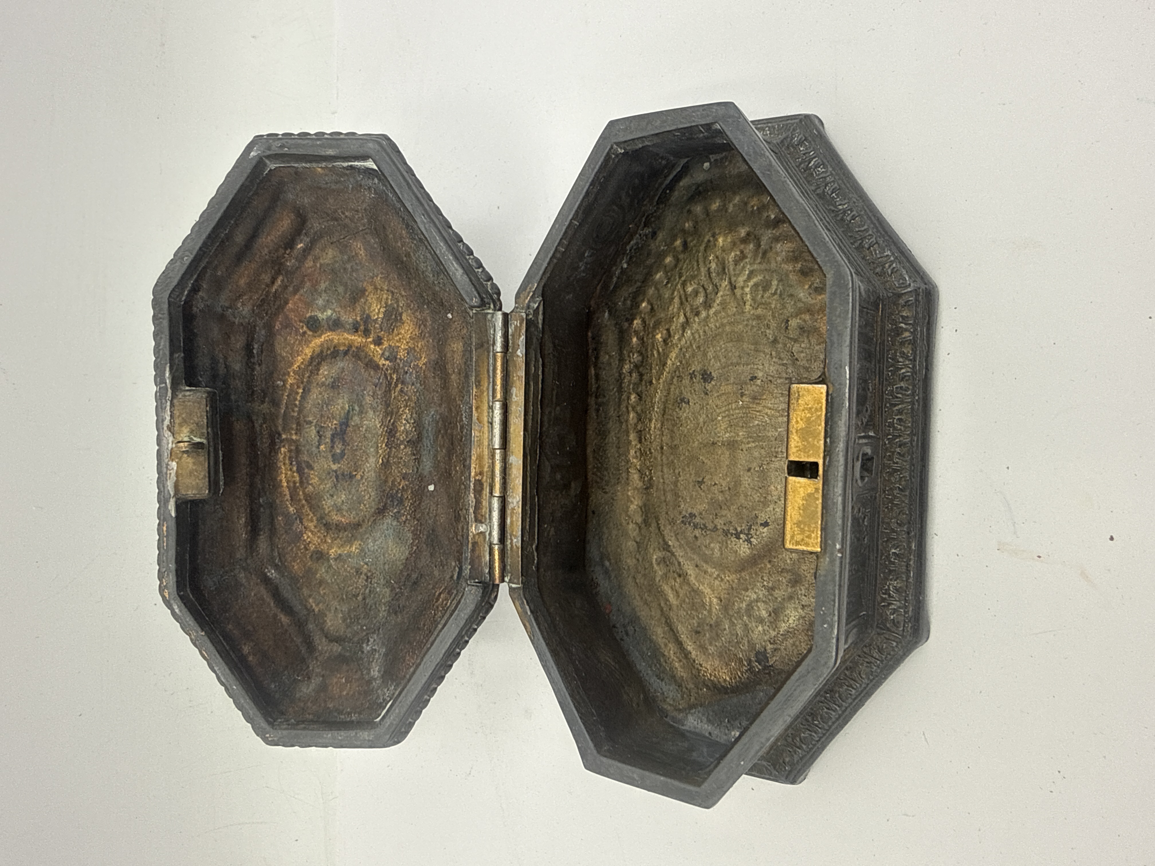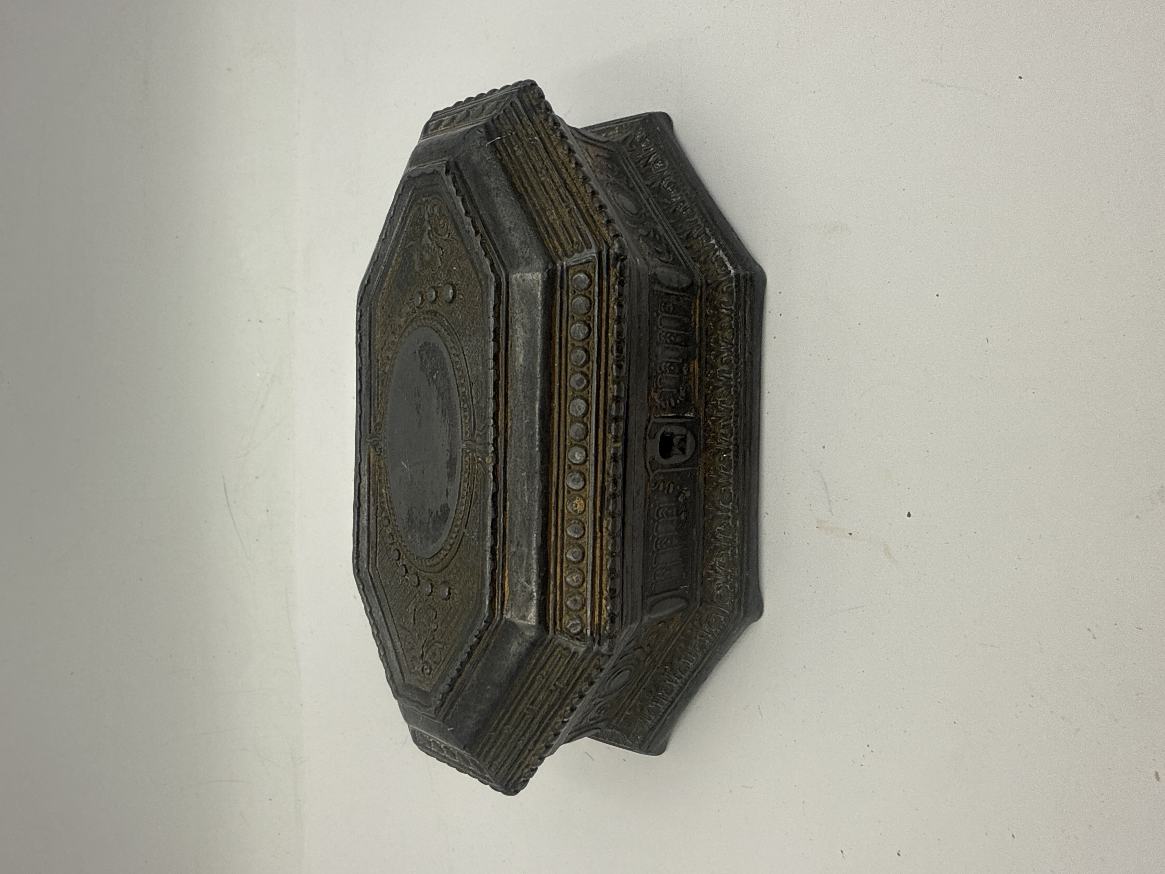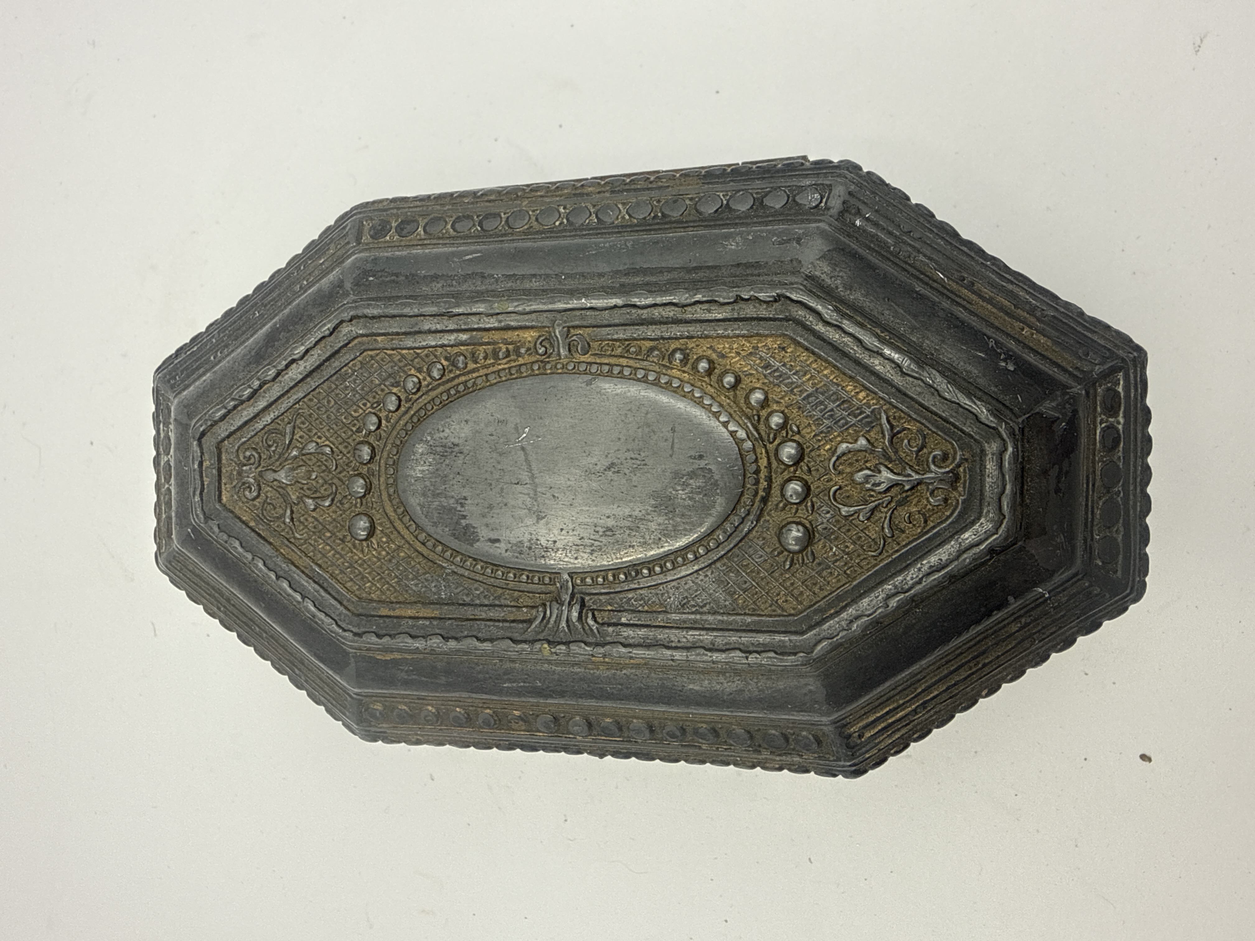 An early 20th century octagonal jewelry casket of cast metal construction featuring a two-tone decorative finish. The hinged lid is designed with a central unengraved oval cartouche bordered by beaded and foliate relief decoration, including fleur-de-lis motifs at the corners, all set against a textured cross-hatched ground. The stepped sides display repeating beaded patterns and scrollwork moldings. The interior is fitted with a brass-toned catch mechanism.