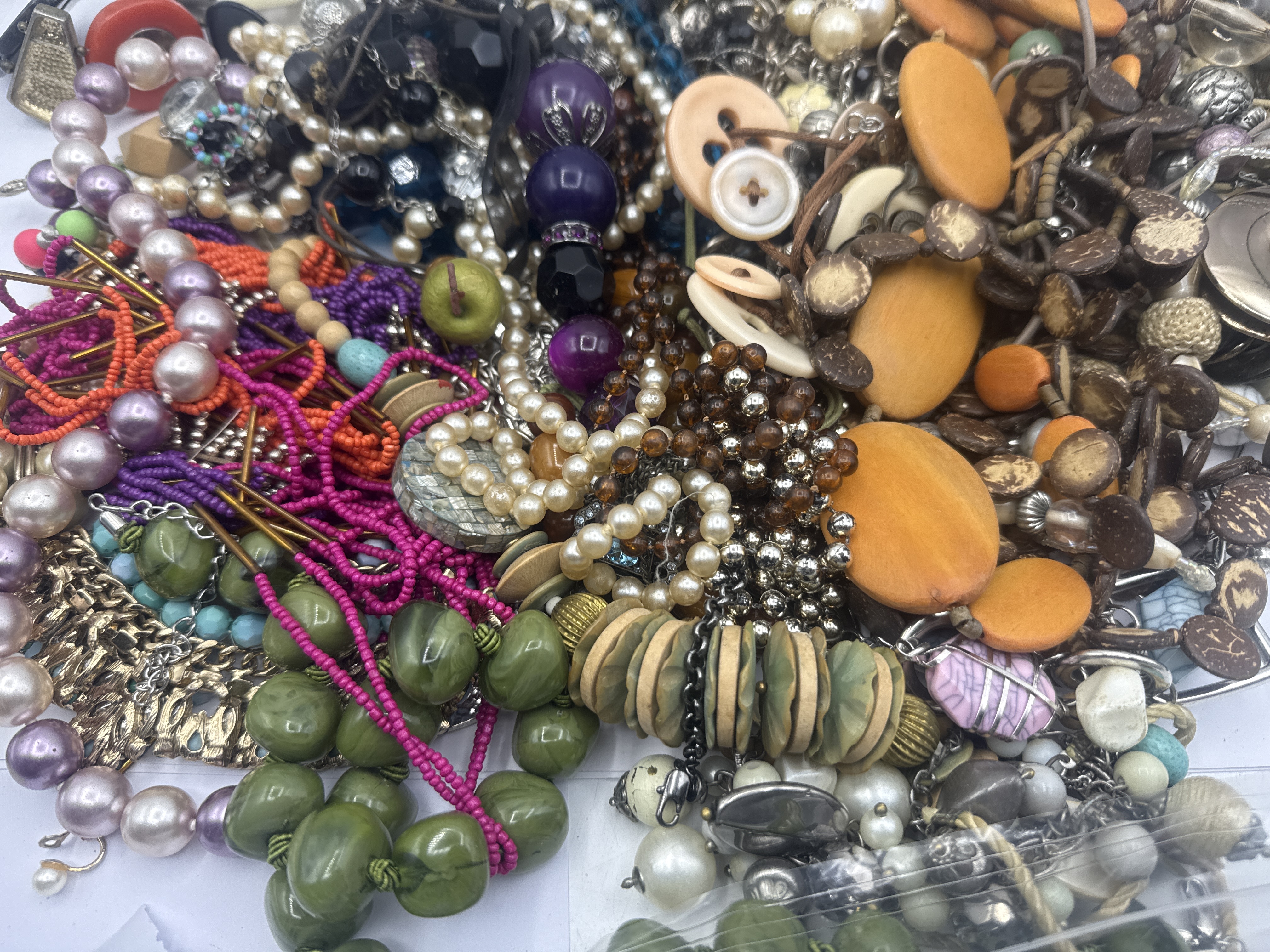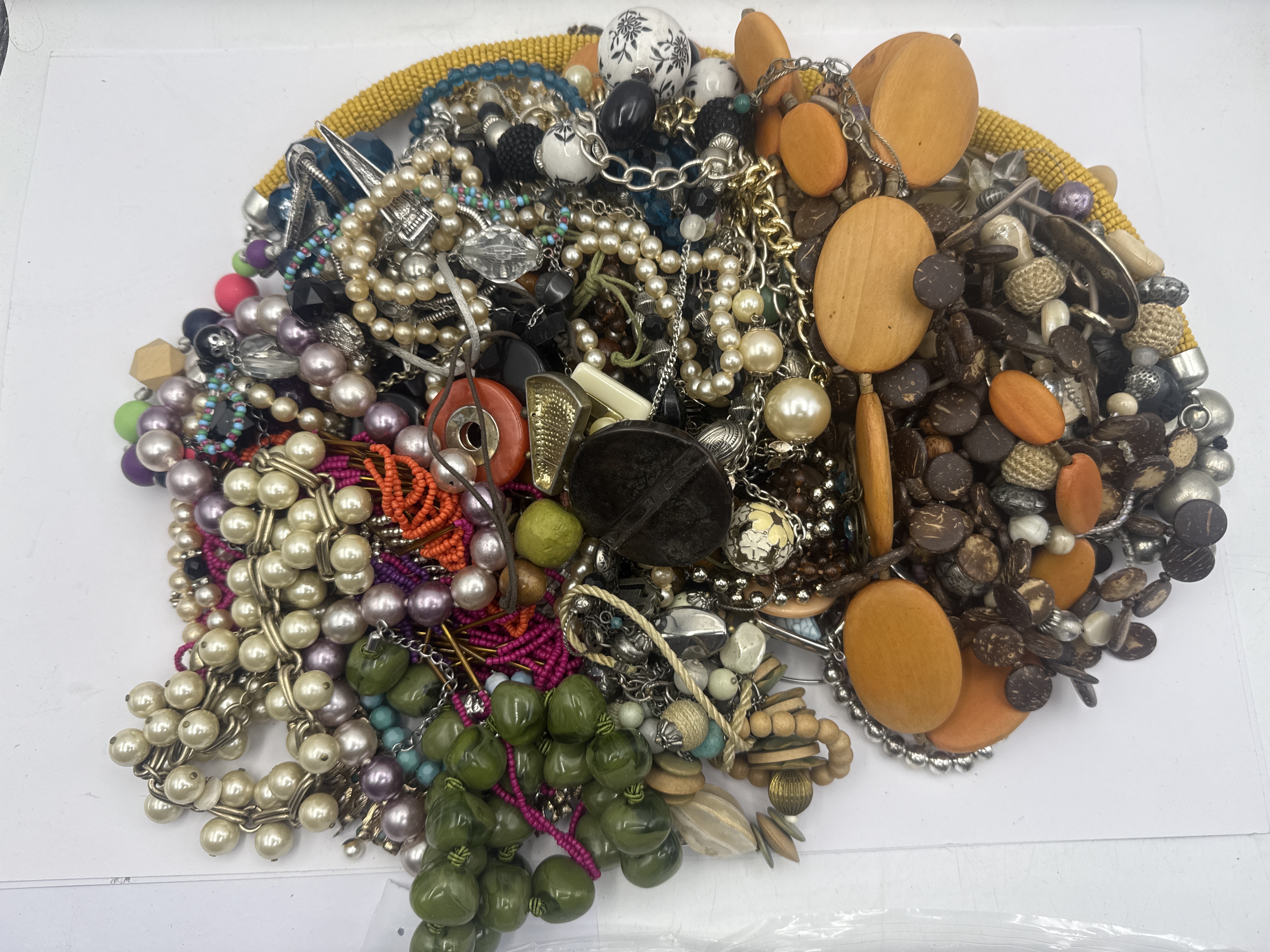 A large assortment of costume jewelry comprising various necklaces and bracelets. The group includes multiple strands of faux pearls, multi-colored seed bead compositions, and chunky components fashioned from wood and plastic. Metallic elements include link chains in silver and gold-tone base metals. The collection features a variety of styles spanning the latter half of the 20th century to the present day. Construction materials include glass, plastic, wood, and non-precious metals. No maker marks or signatures were observed.