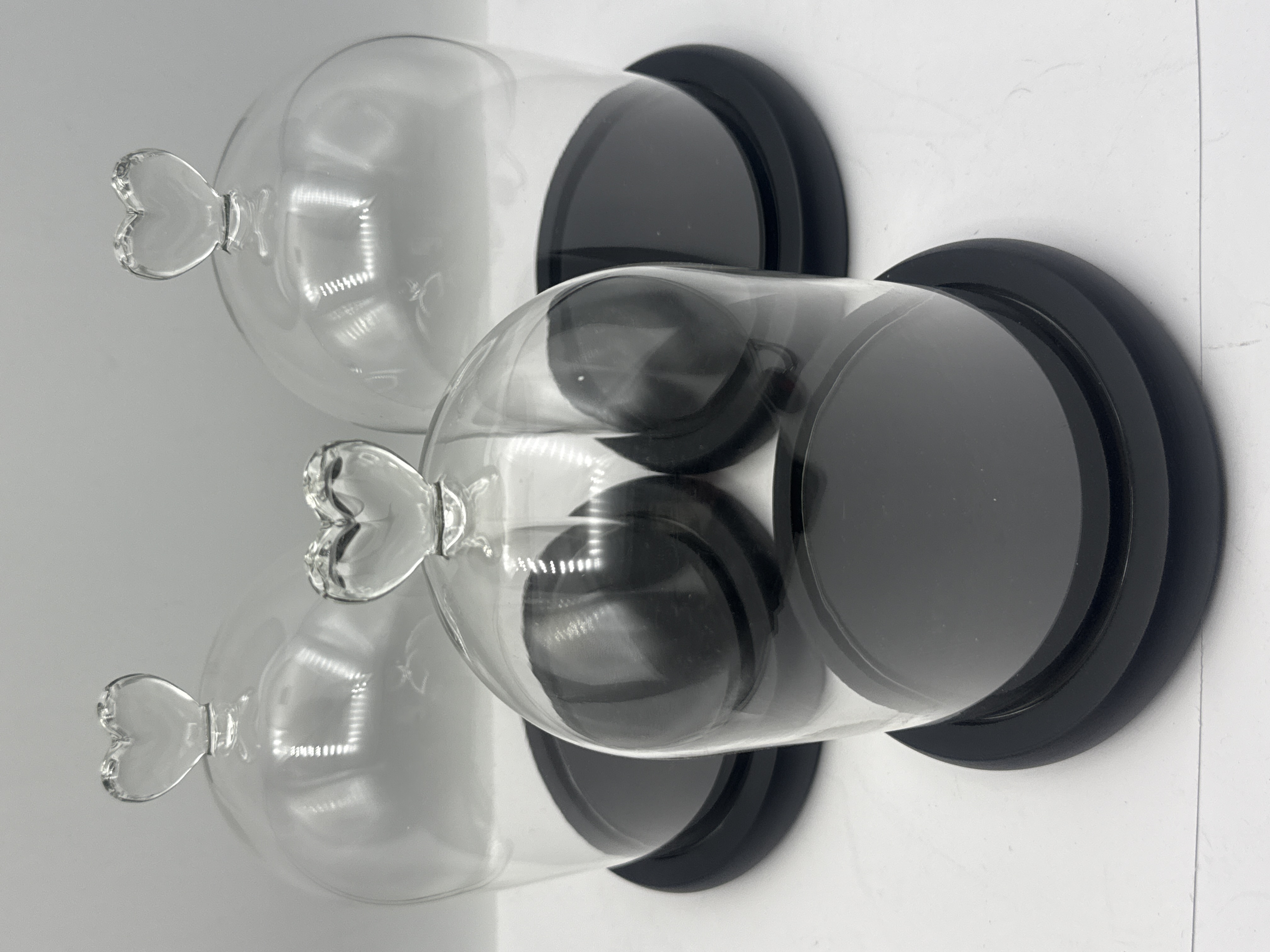 A trio of contemporary glass display cloches, each featuring a clear glass bell jar topped with a molded heart-shaped finial. The domes rest upon matching circular, tiered bases with a matte black finish. The items are constructed of glass and are intended for use as tabletop centerpieces or decorative display cases, standing 9″ tall. No manufacturer marks or identifying labels are visible on the pieces.