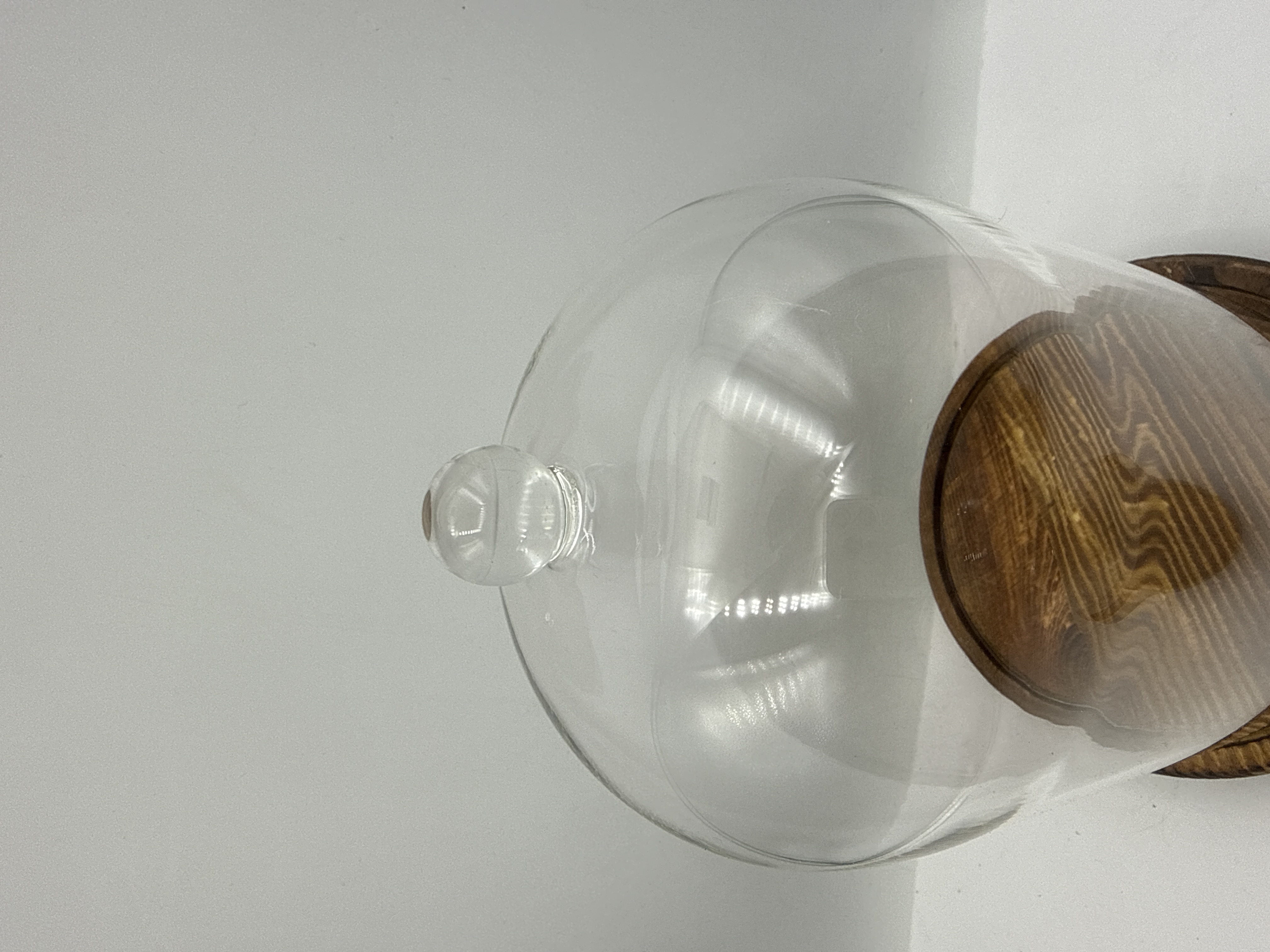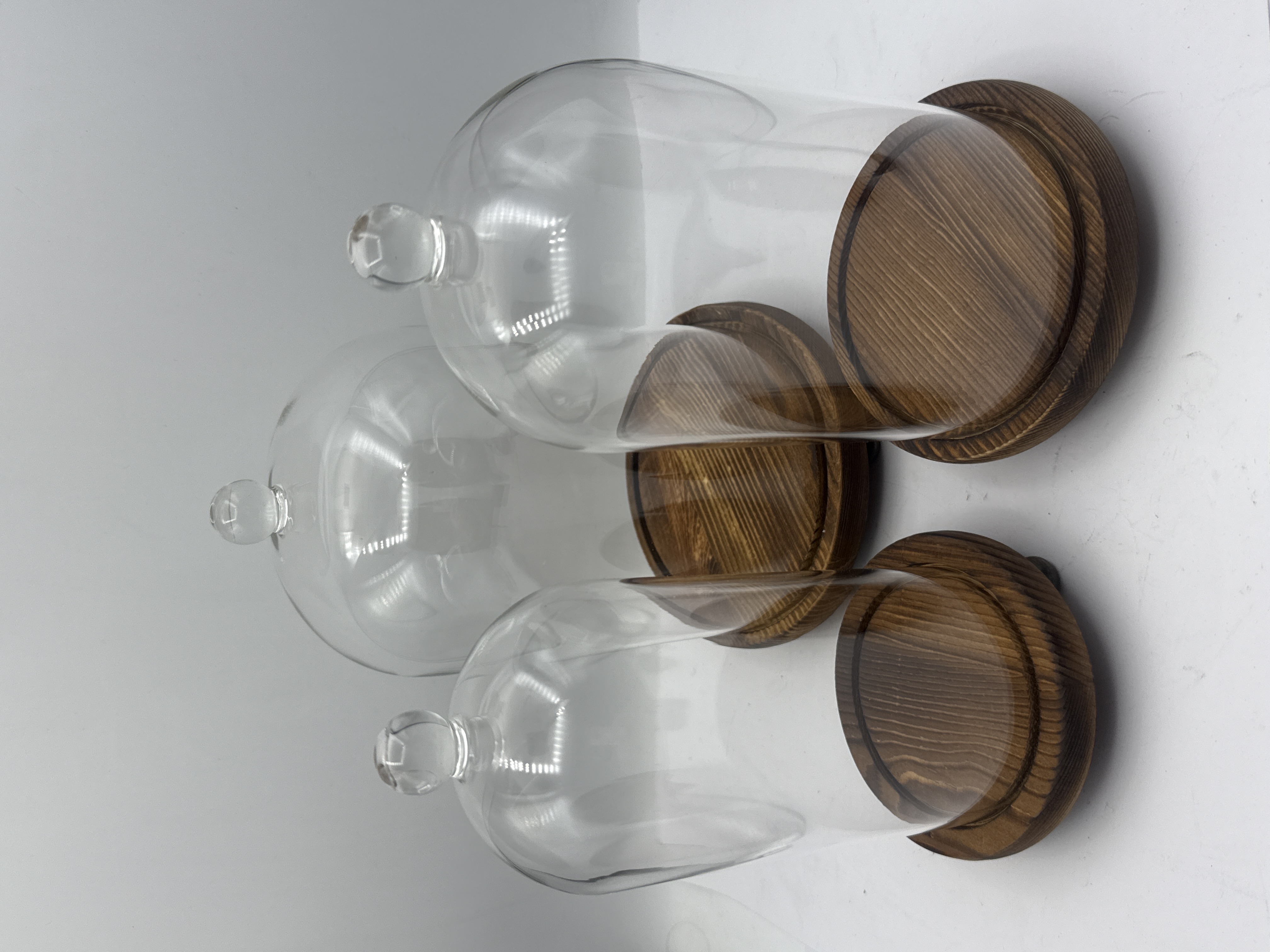 A trio of contemporary decorative glass cloches or bell jars. Each unit is constructed from clear glass and features a spherical finial at the top. The glass domes are paired with circular, dark-stained wooden bases. Each base is designed with a recessed groove to secure the glass in place. The group contains domes of different sizes, including tall and squat profiles. The tallest 10 inch cloche is included in this lot.