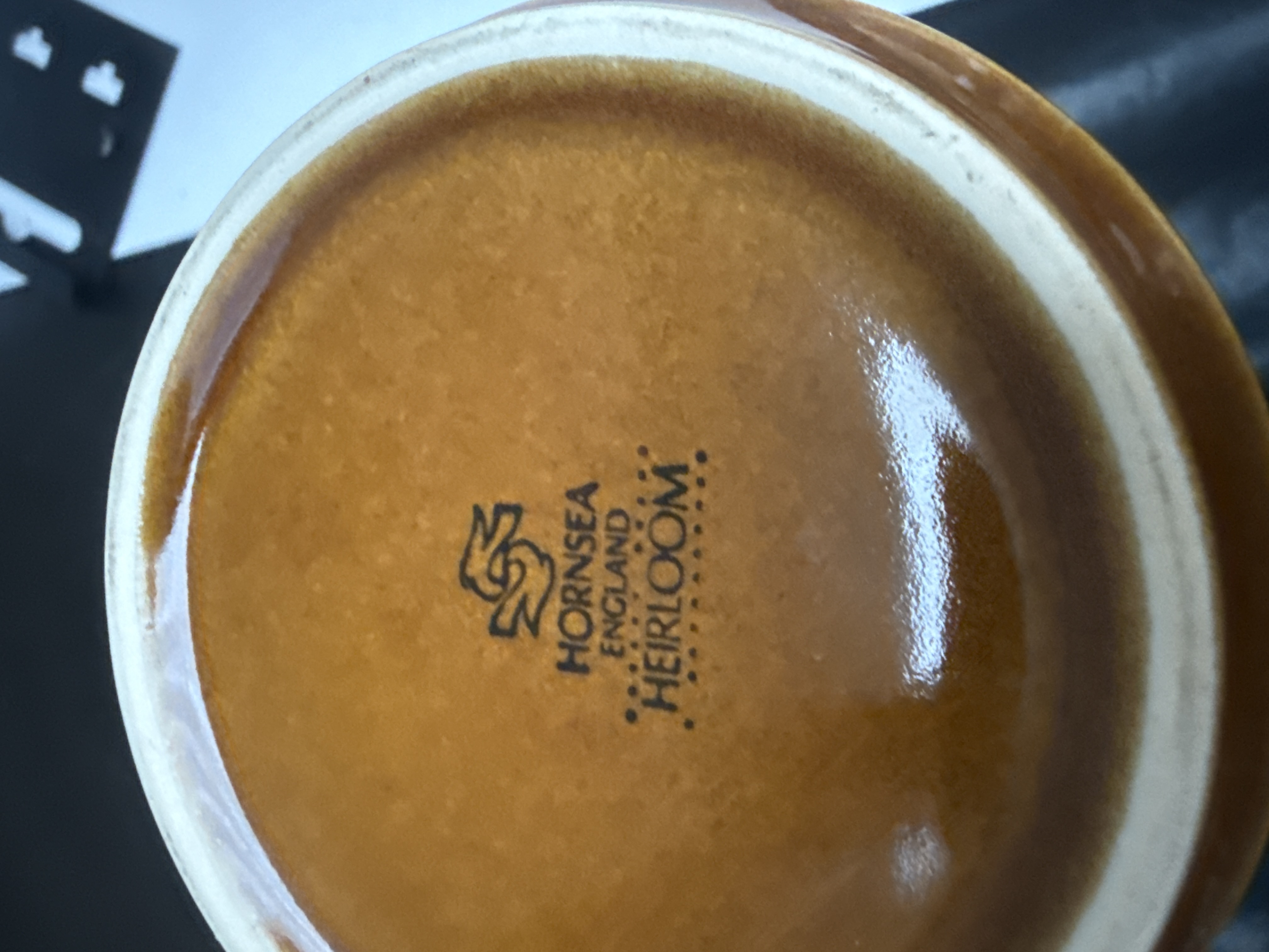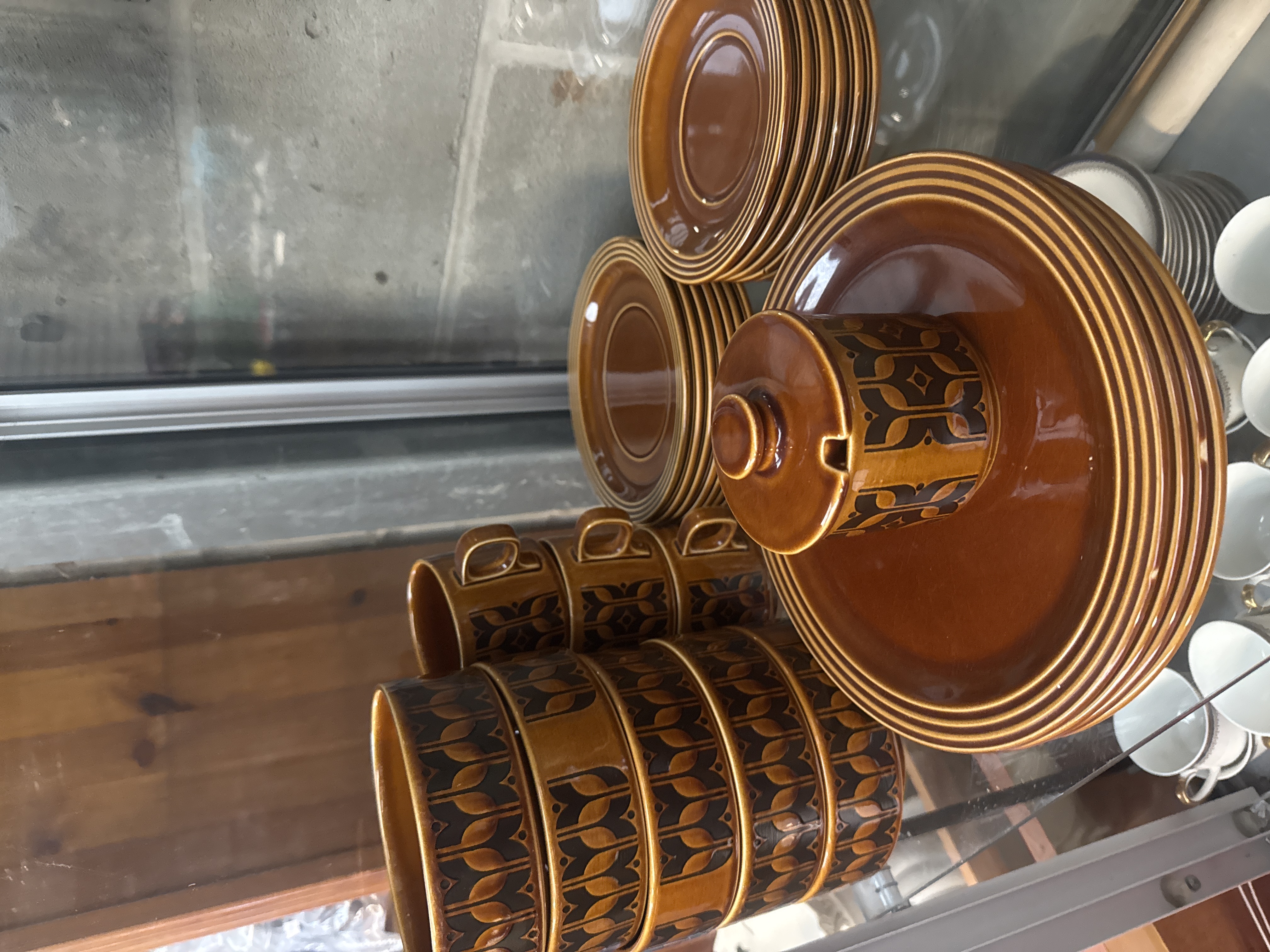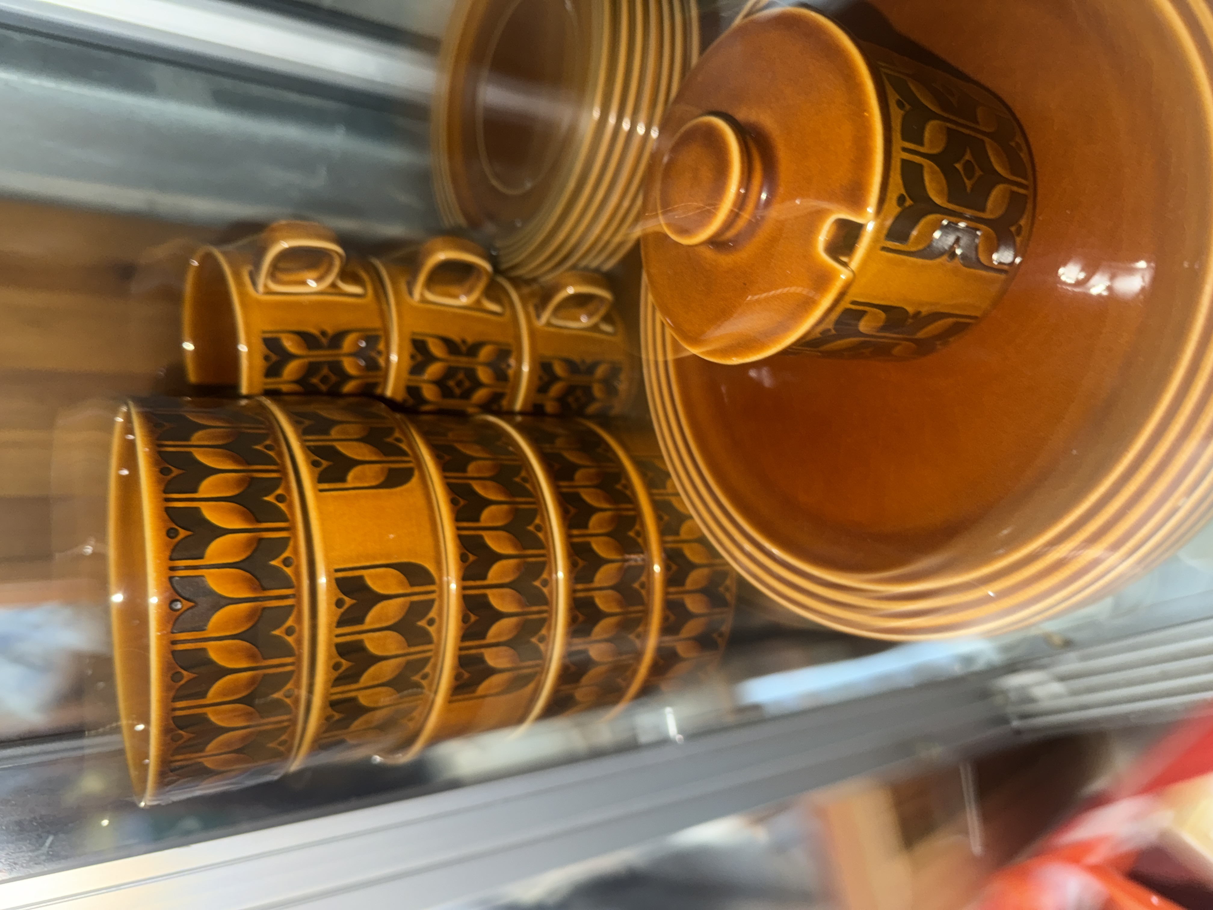 A collection of 26 pieces of Hornsea Heirloom pattern glazed ceramic tableware, manufactured in England. Originally designed by John Clappison in the 1970s, the pieces feature an autumnal amber-brown glaze decorated with a repeating dark brown geometric stylized motif and horizontal ribbed accents. The assortment includes cups, saucers, plates, and a small lidded pot. The base of the items features the maker stamp reading HORNSEA ENGLAND HEIRLOOM.