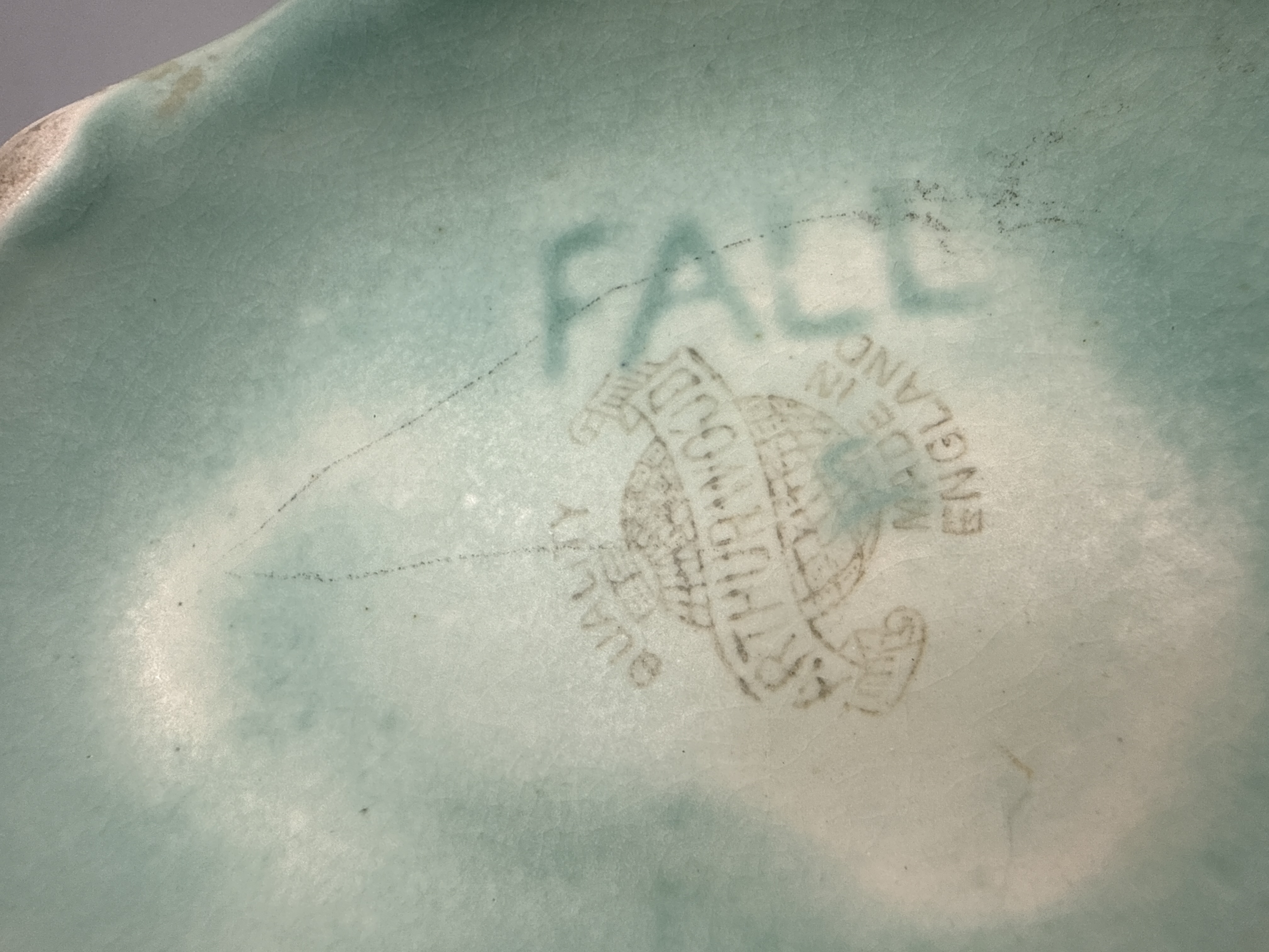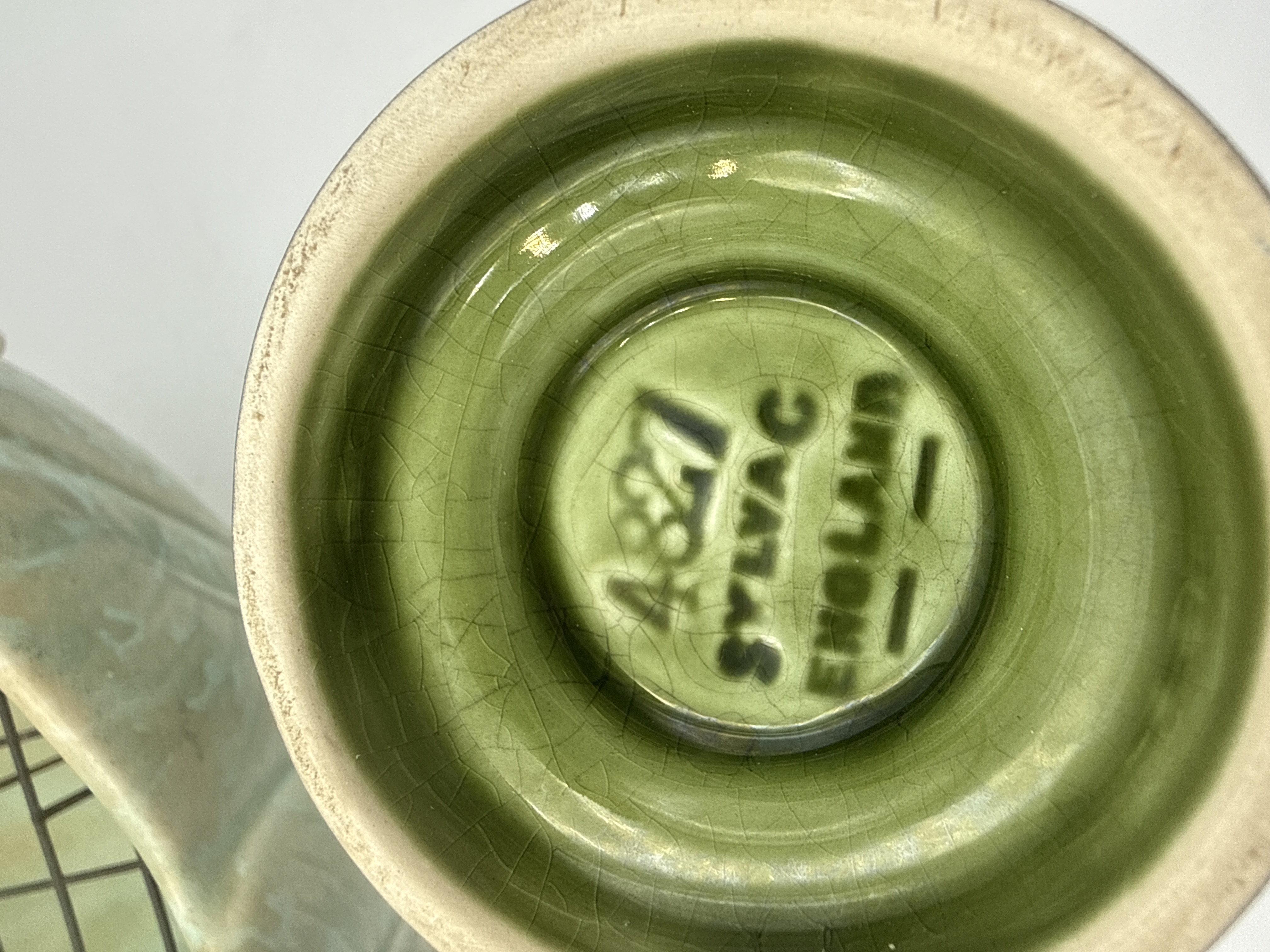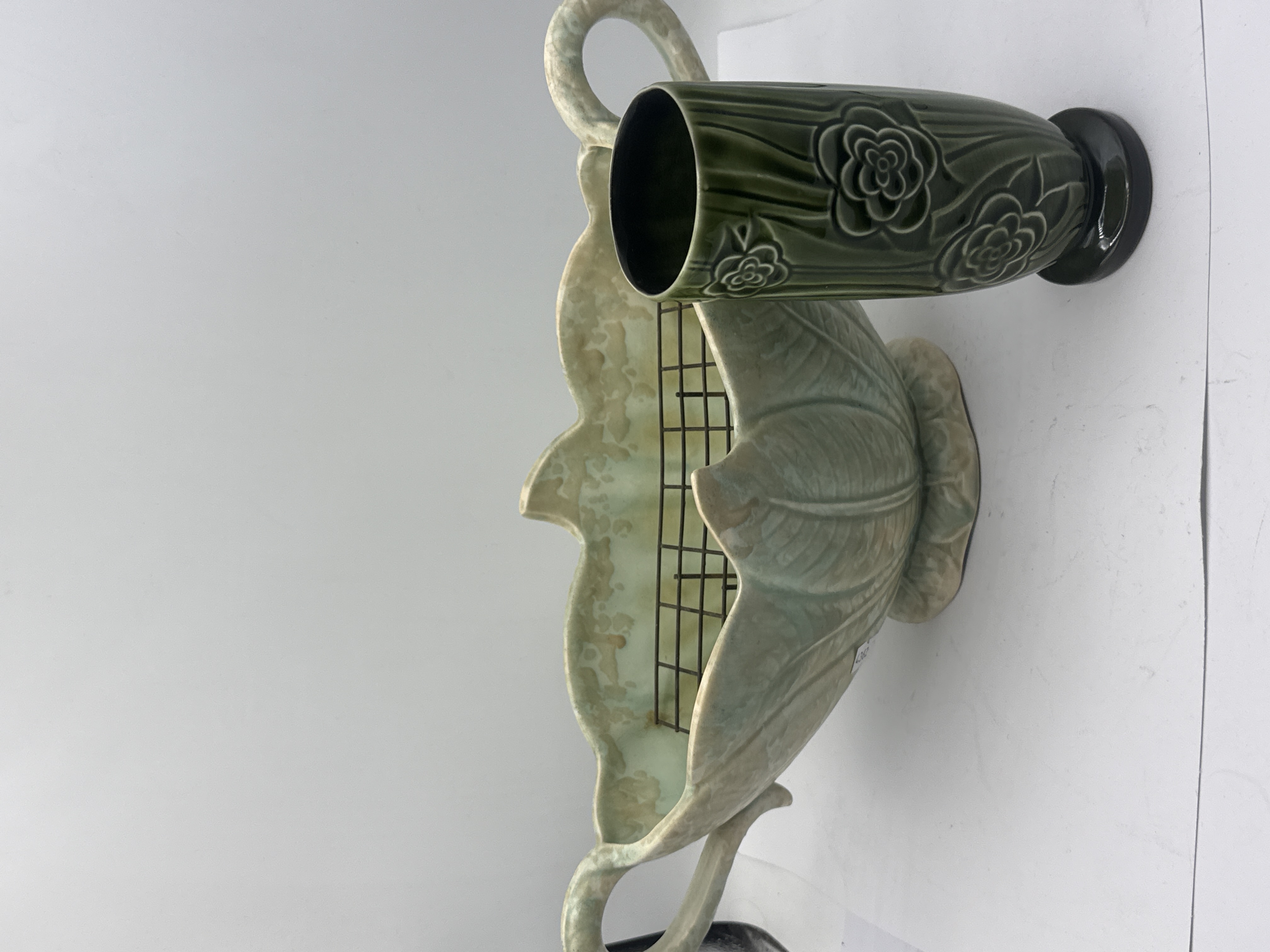 Two English glazed ceramic vessels comprising a SylvaC vase and an Arthur Wood planter. The SylvaC vase, model 4827, is finished in a dark green glaze with molded rose patterns and features the impressed manufacturer mark on the underside. The Arthur Wood 15 inch rose bowl planter is finished in a pale turquoise glaze with a molded leaf design and scrolling handles. This vessel contains an internal metal wire flower grid. The base is stamped with the Arthur Wood Made in England mark and includes the handwritten word FALL.