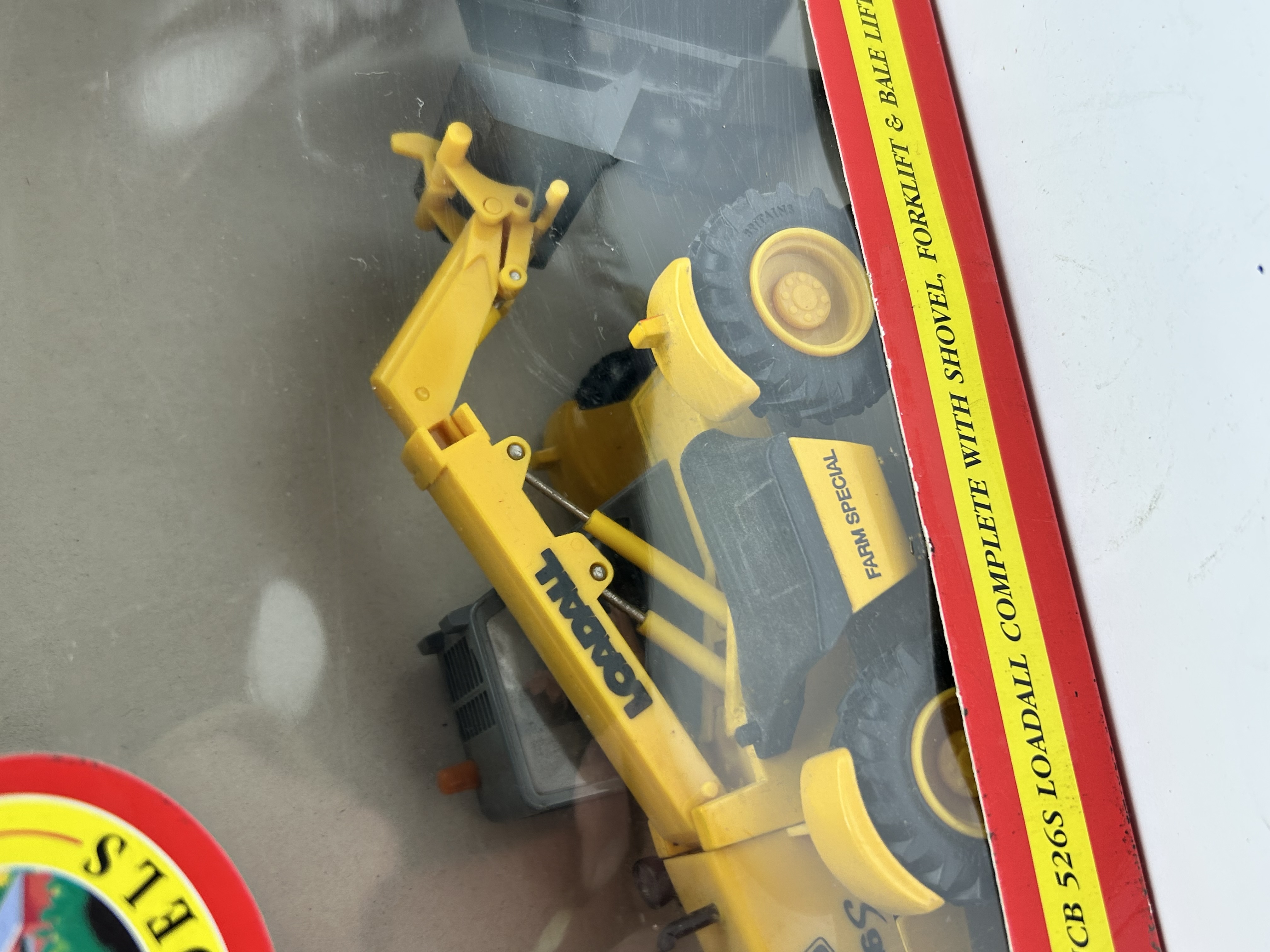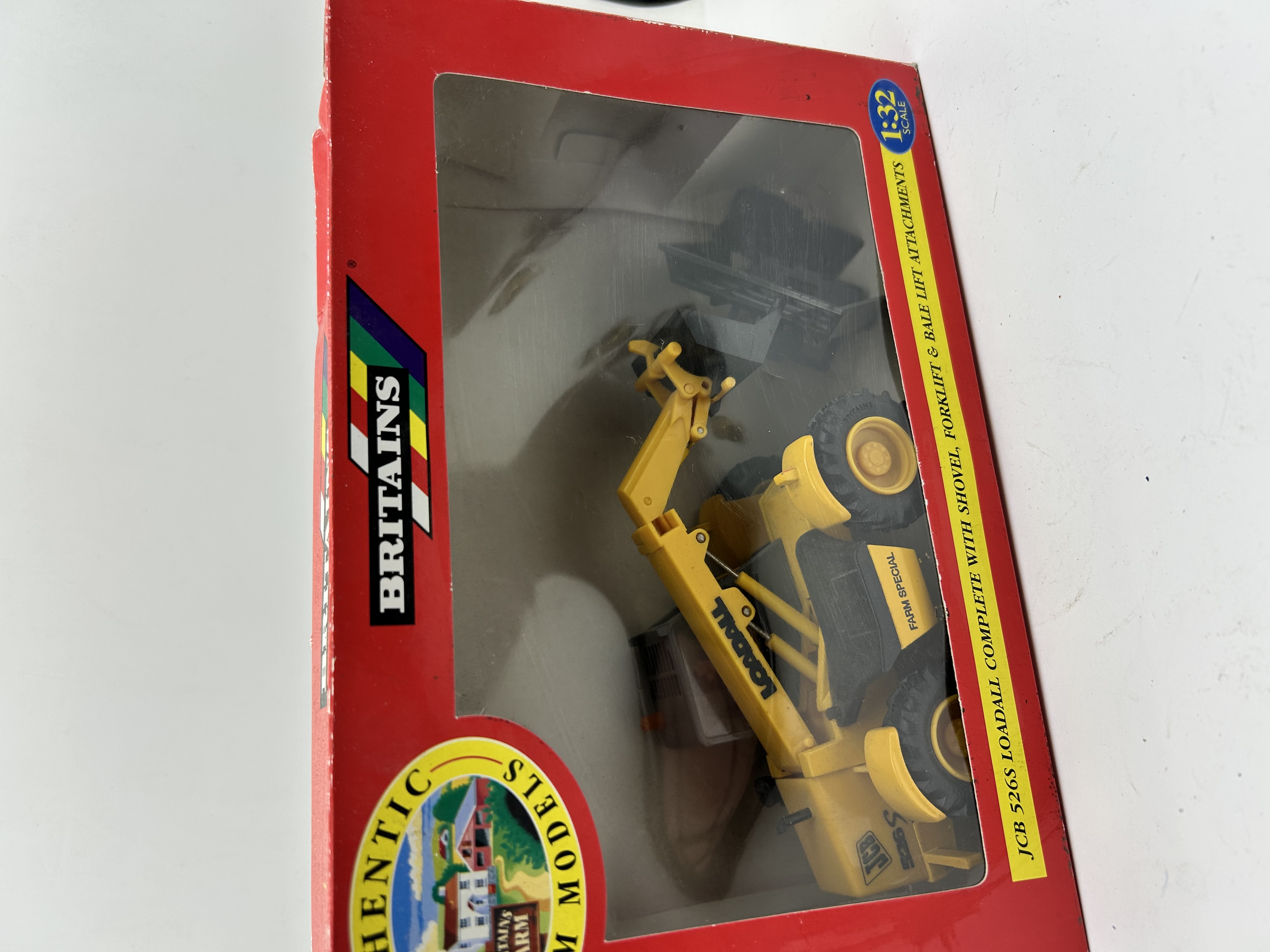 A Britains 1:32 scale JCB 526S Loadall die-cast farm model. The vehicle is finished in yellow and features decals for Loadall, Farm Special, and 526S. This model is sold complete with three interchangeable attachments: a shovel, a forklift, and a bale lift. The item is contained within its original red window display box, which is marked with Authentic Farm Models and Britains branding.