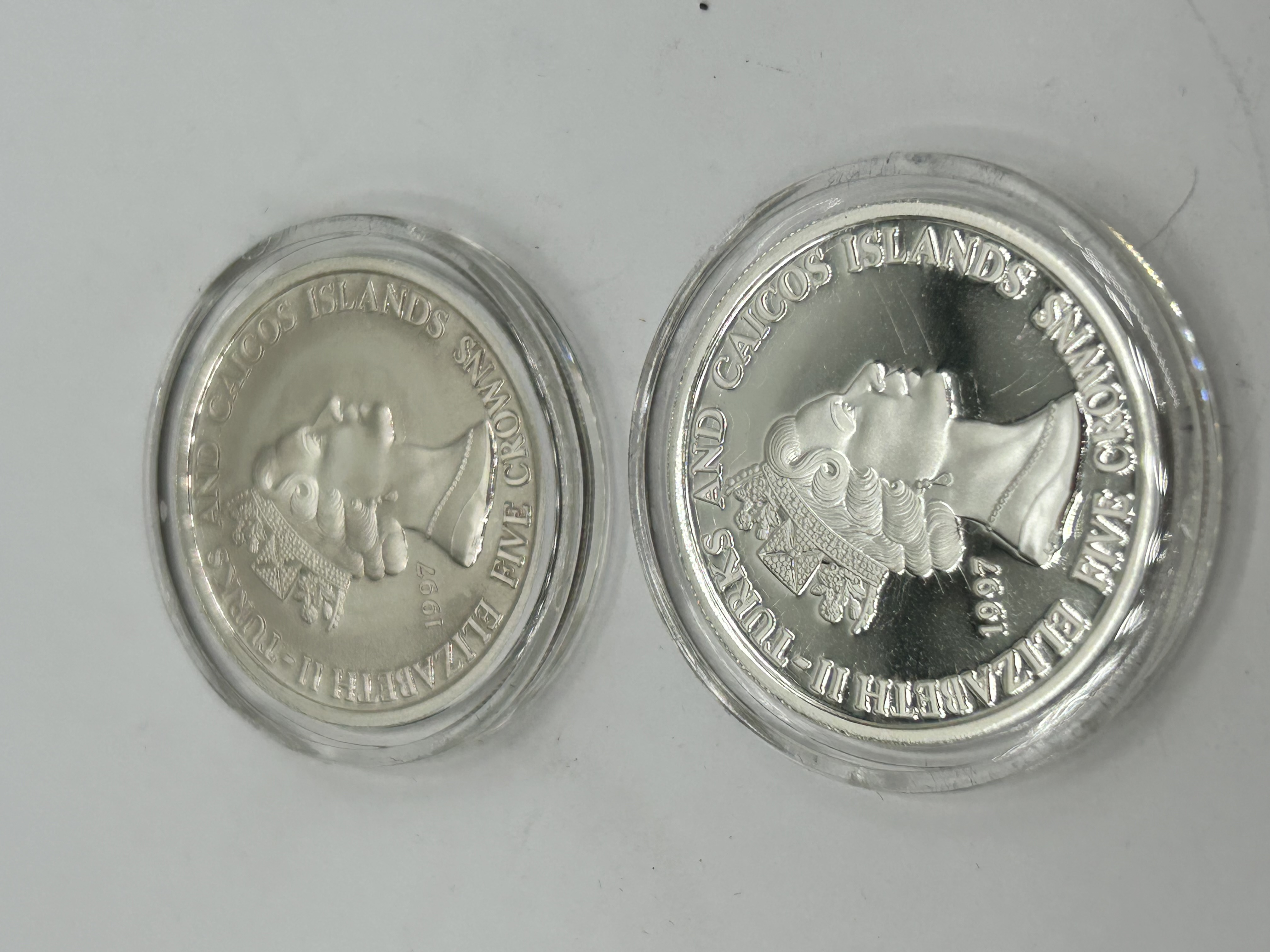 A pair of silver commemorative five-crown coins issued by the Turks and Caicos Islands in 1997. The obverse of each coin features the right-facing effigy of Queen Elizabeth II, surrounded by the inscriptions TURKS AND CAICOS ISLANDS, ELIZABETH II, 1997, and FIVE CROWNS. The reverse depicts two profiles in relief with the text LADY OF THE CENTURY and 1937 CORONATION, commemorating Queen Elizabeth the Queen Mother. Each coin exhibits a proof-like finish with frosted details against mirrored fields. The coins are presented in individual clear plastic protective capsules.