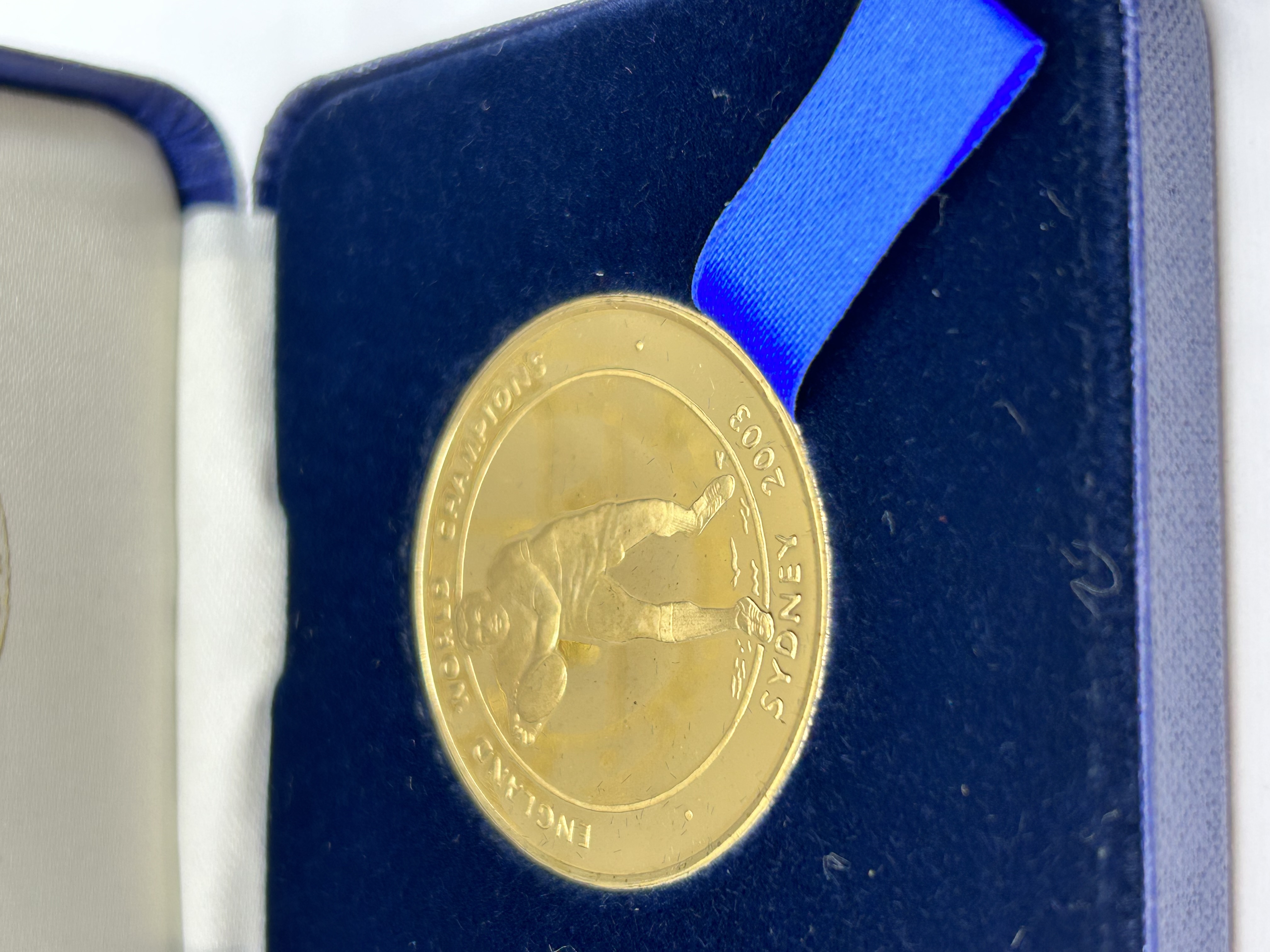 A collection of gold-toned commemorative medals produced to celebrate the England national team victory at the 2003 Rugby World Cup in Sydney. Each circular medal features a relief depiction of a rugby player in action and is inscribed with the text ENGLAND WORLD CHAMPIONS SYDNEY 2003. The medals are suspended from blue fabric ribbons and presented in individual blue velvet-lined cases. The interior silk of each case is gilt-stamped with the LEGENDS OF ENGLISH RUGBY series title and a central C&W logo.