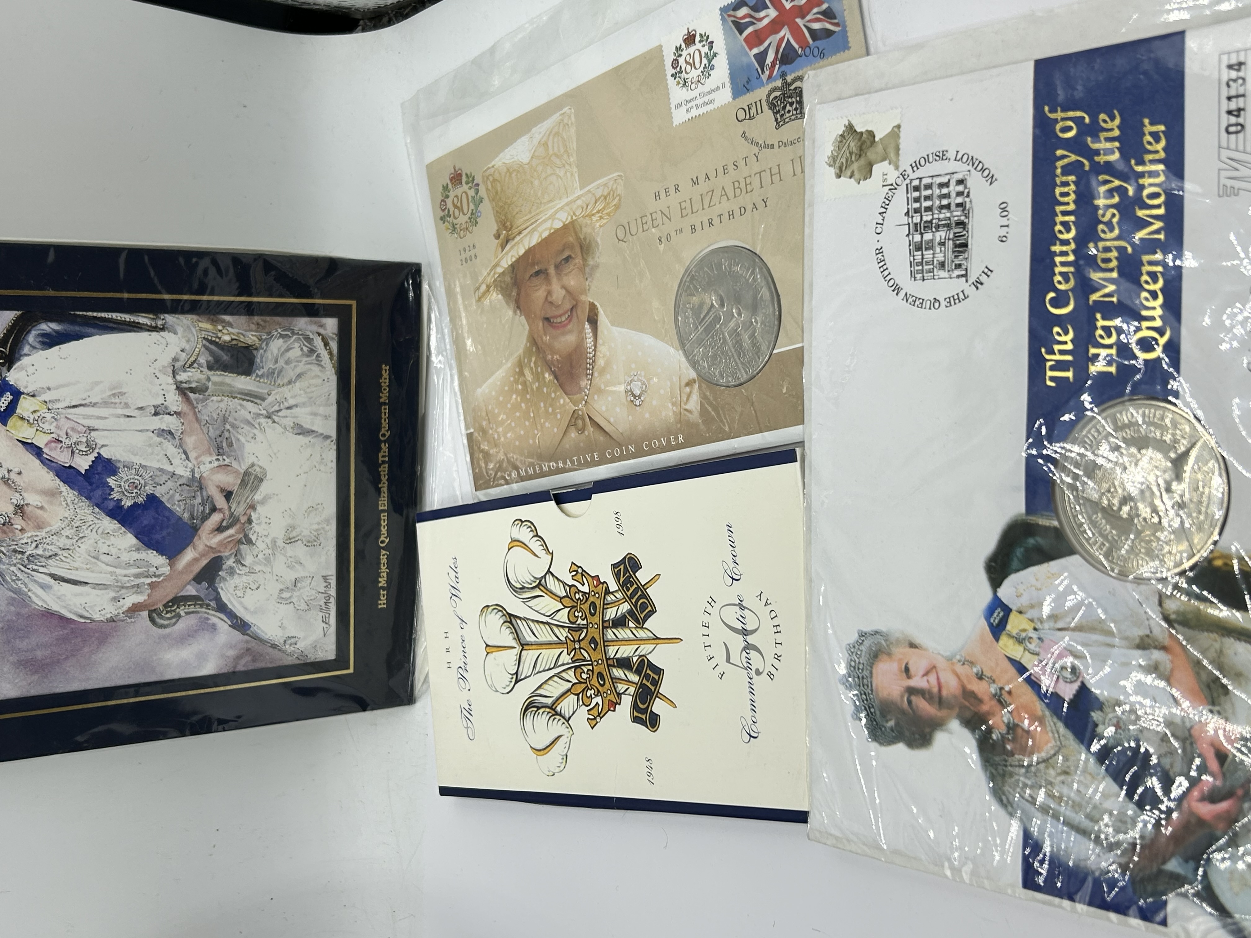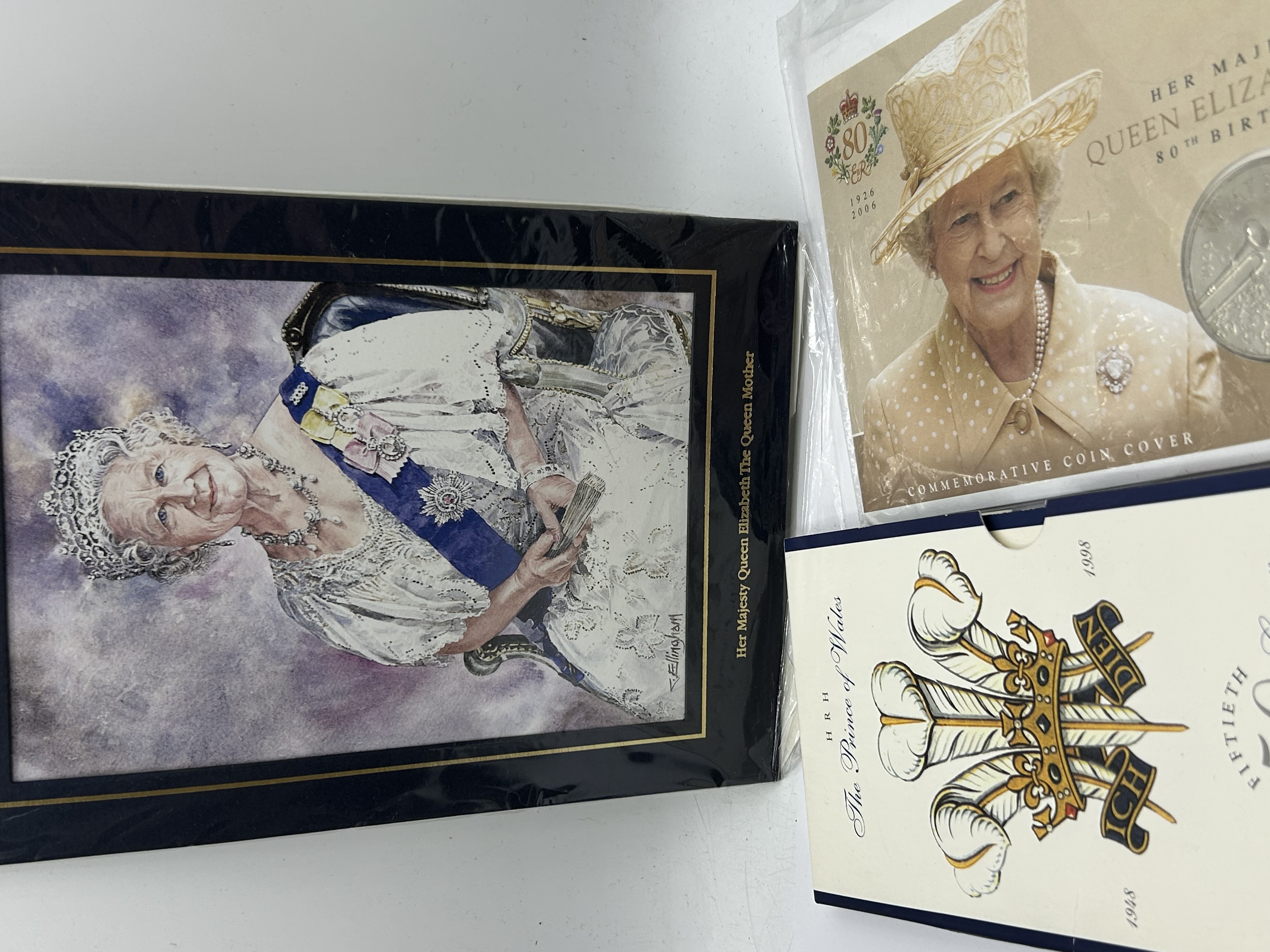A collection of British Royal commemorative memorabilia featuring philatelic-numismatic covers and ephemera. The group includes a Queen Elizabeth II 80th Birthday commemorative coin cover dated 2006 and a Queen Elizabeth the Queen Mother centenary cover dated 2000 containing a five-pound coin. Also present is a commemorative card for the 50th birthday of HRH The Prince of Wales dated 1998, bearing the heraldic feathers badge and the motto Ich Dien, alongside a mounted portrait print of the Queen Mother. The items are primarily composed of cardstock, paper, and metal.