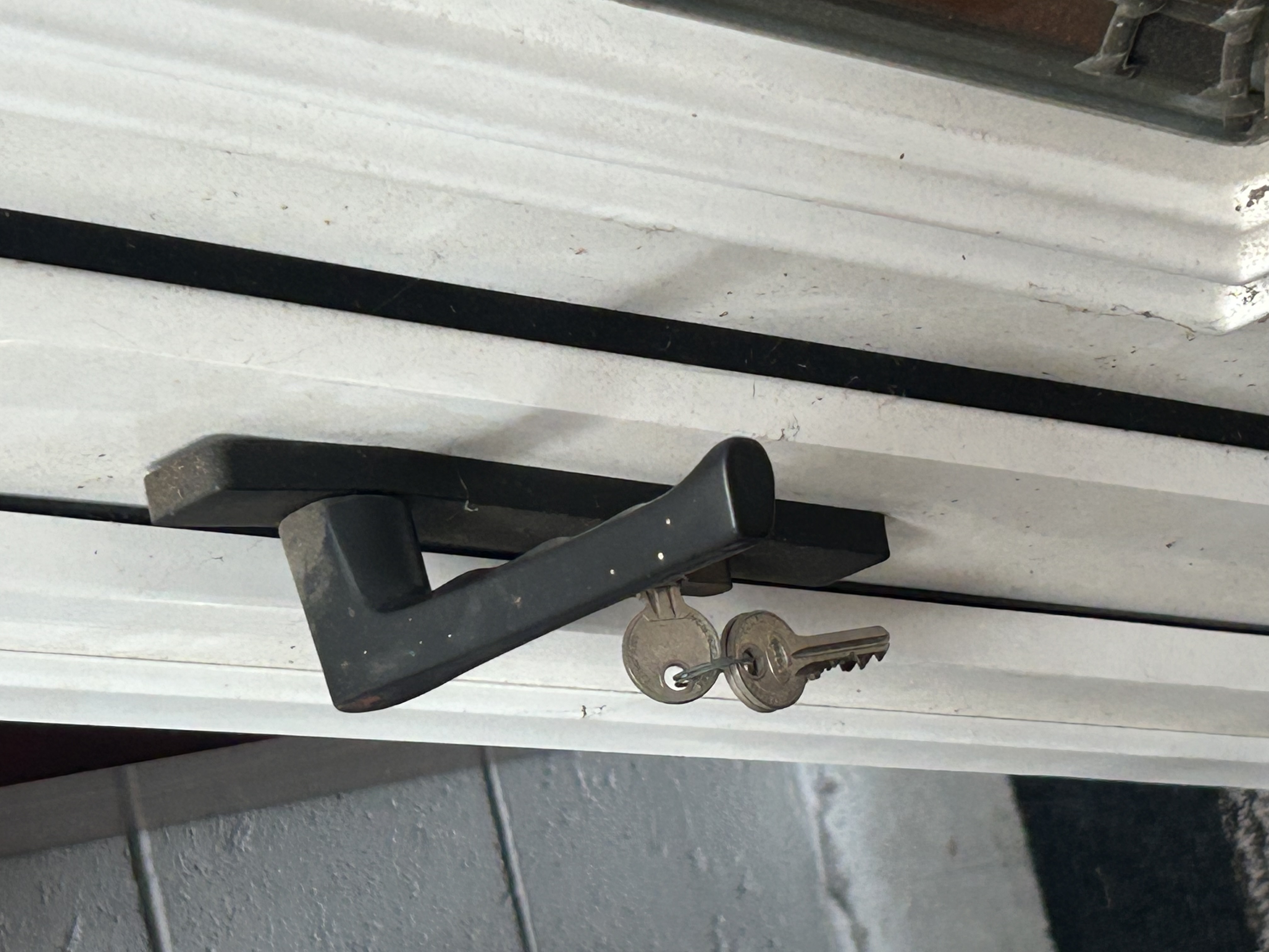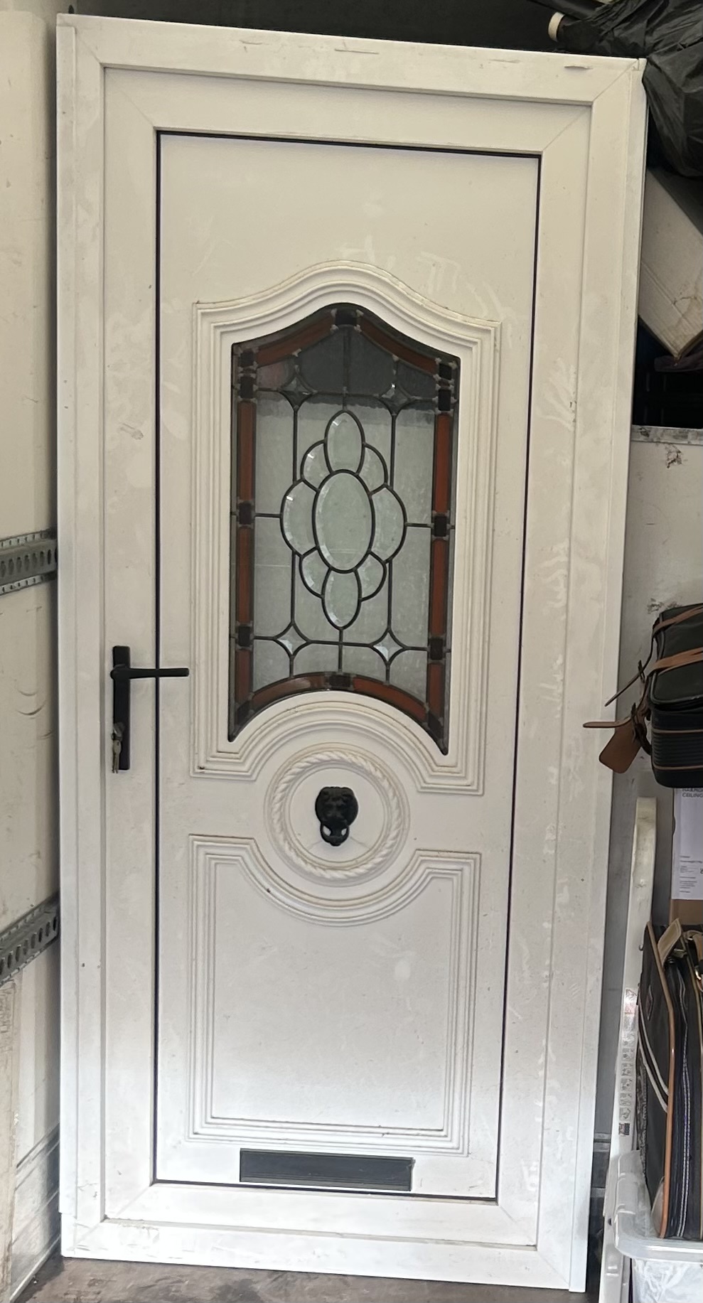 A contemporary white uPVC exterior door presented within its matching frame. The door features a traditional design with moulded panels and a central decorative leaded-glass insert containing stained-glass accents in amber and brown tones. The door is fitted with black-finished hardware, including a lever-style handle, a lion-head door knocker set within a circular rope-bordered motif, and a rectangular mail slot. A set of keys is present in the lock mechanism.