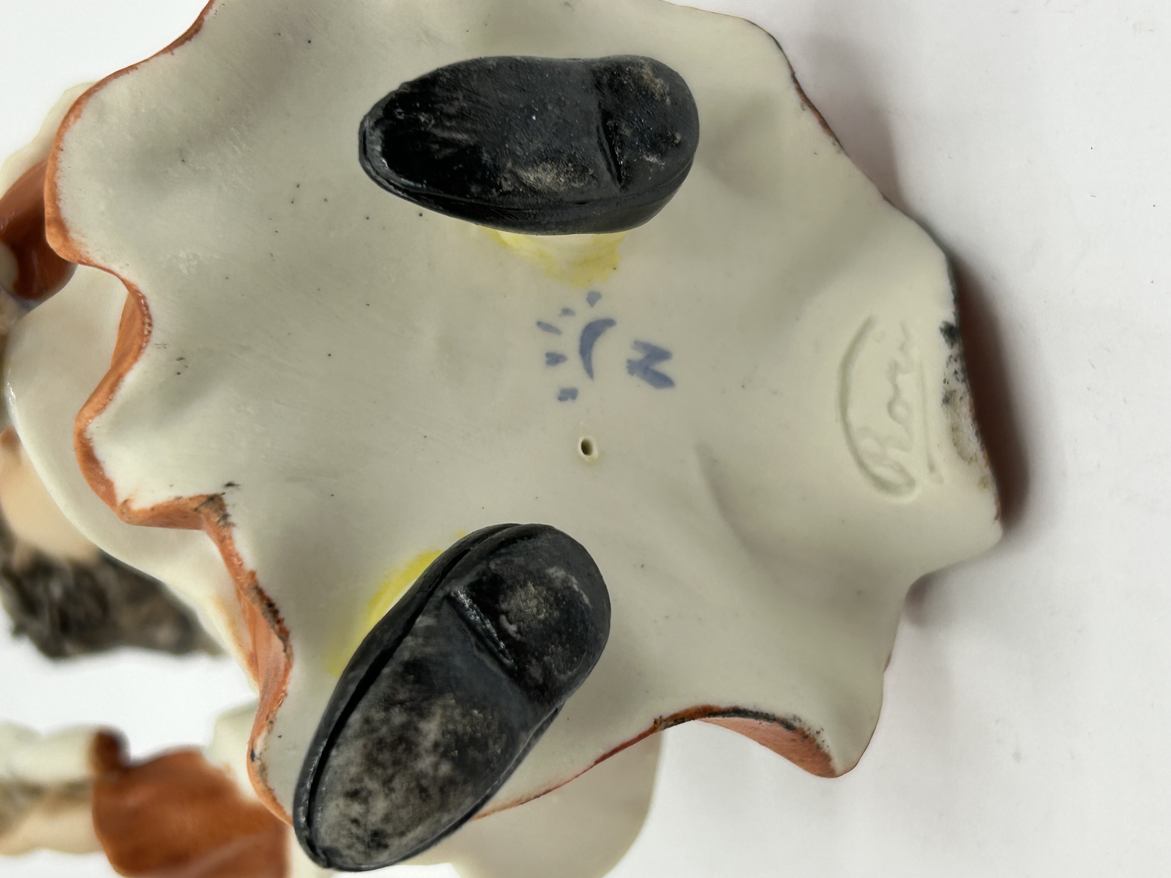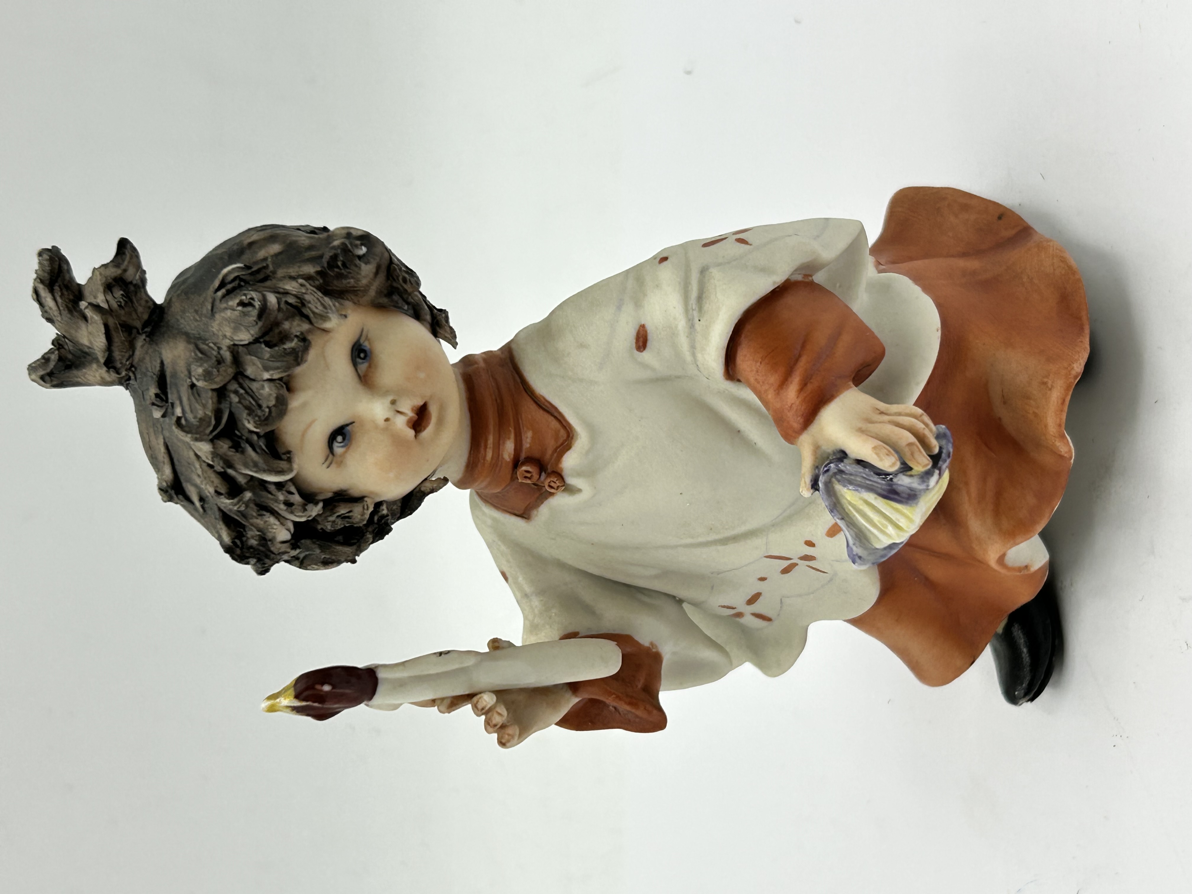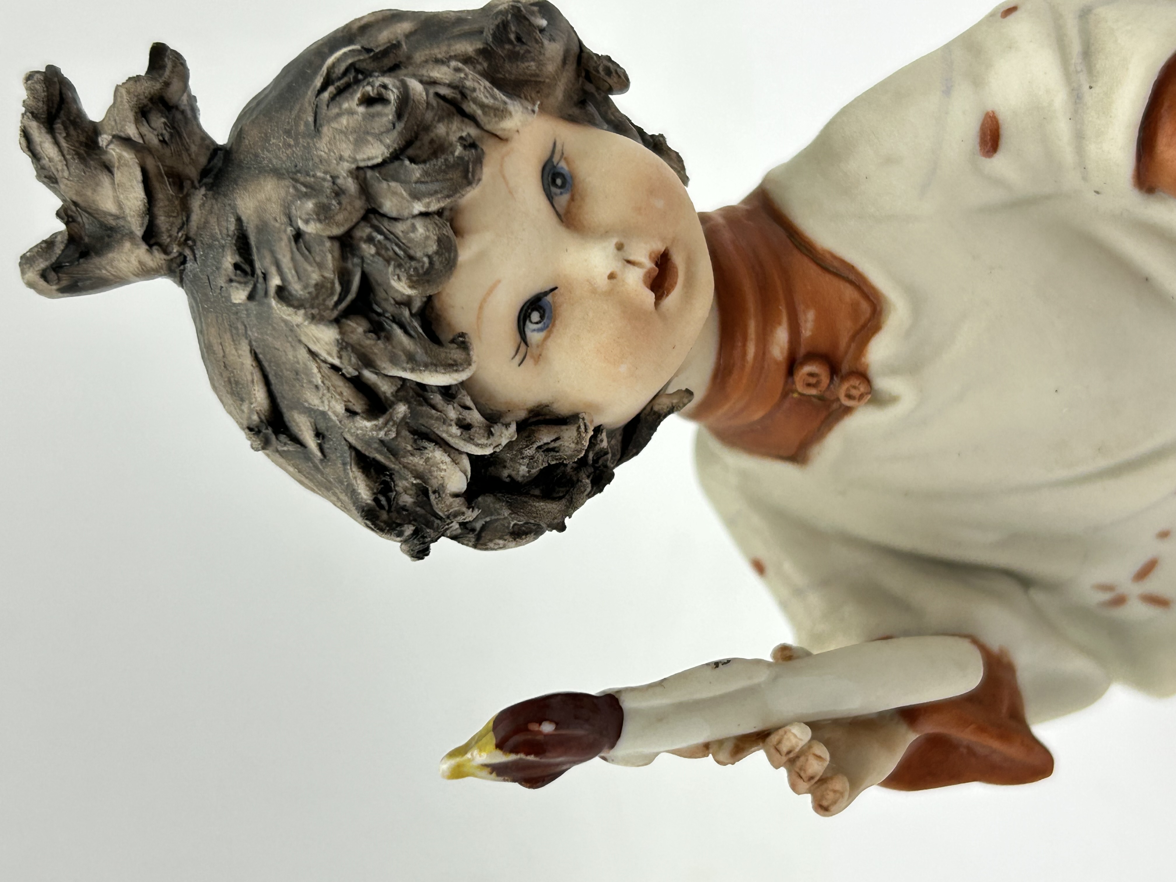 A Capodimonte porcelain figurine of a child altar boy, also known as a chierichetto. The figure is modeled with dark textured hair tied in a topknot and expressive facial features. The subject is depicted wearing an ivory-colored tunic with orange accents over an orange skirt, holding a candle in one hand and a small book in the other. The underside of the base features a blue underglaze crowned N mark with radiating lines and an incised signature reading Ronchi.
