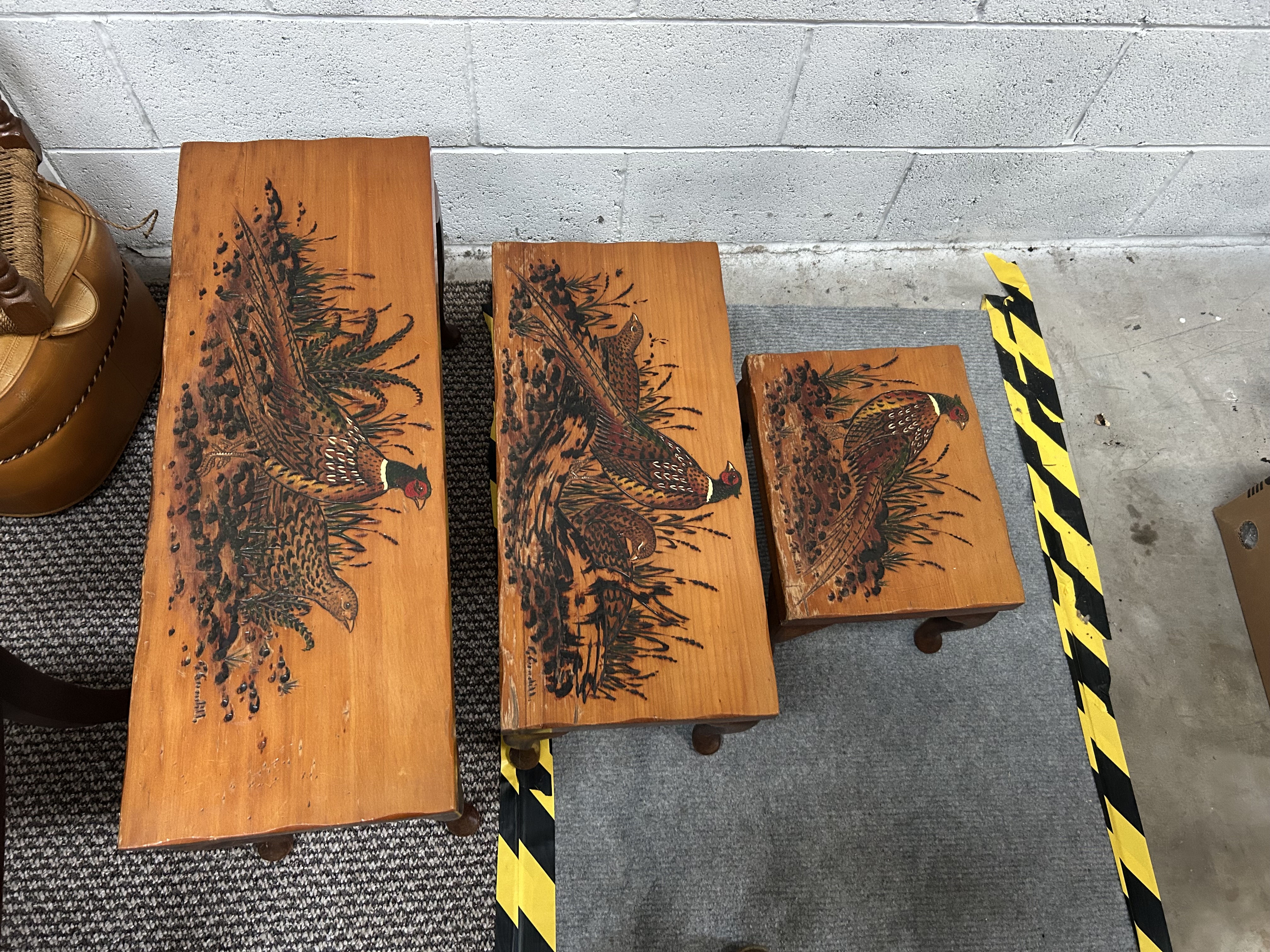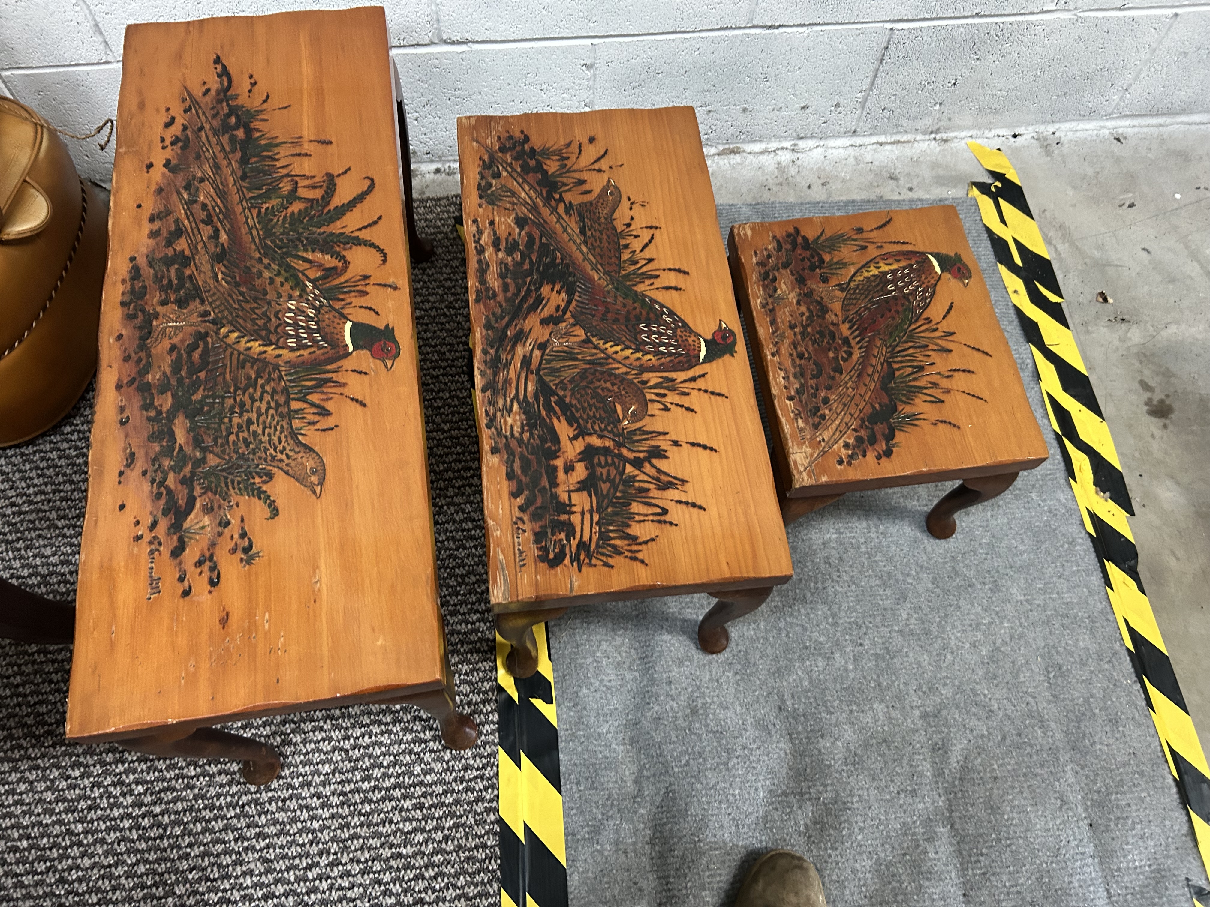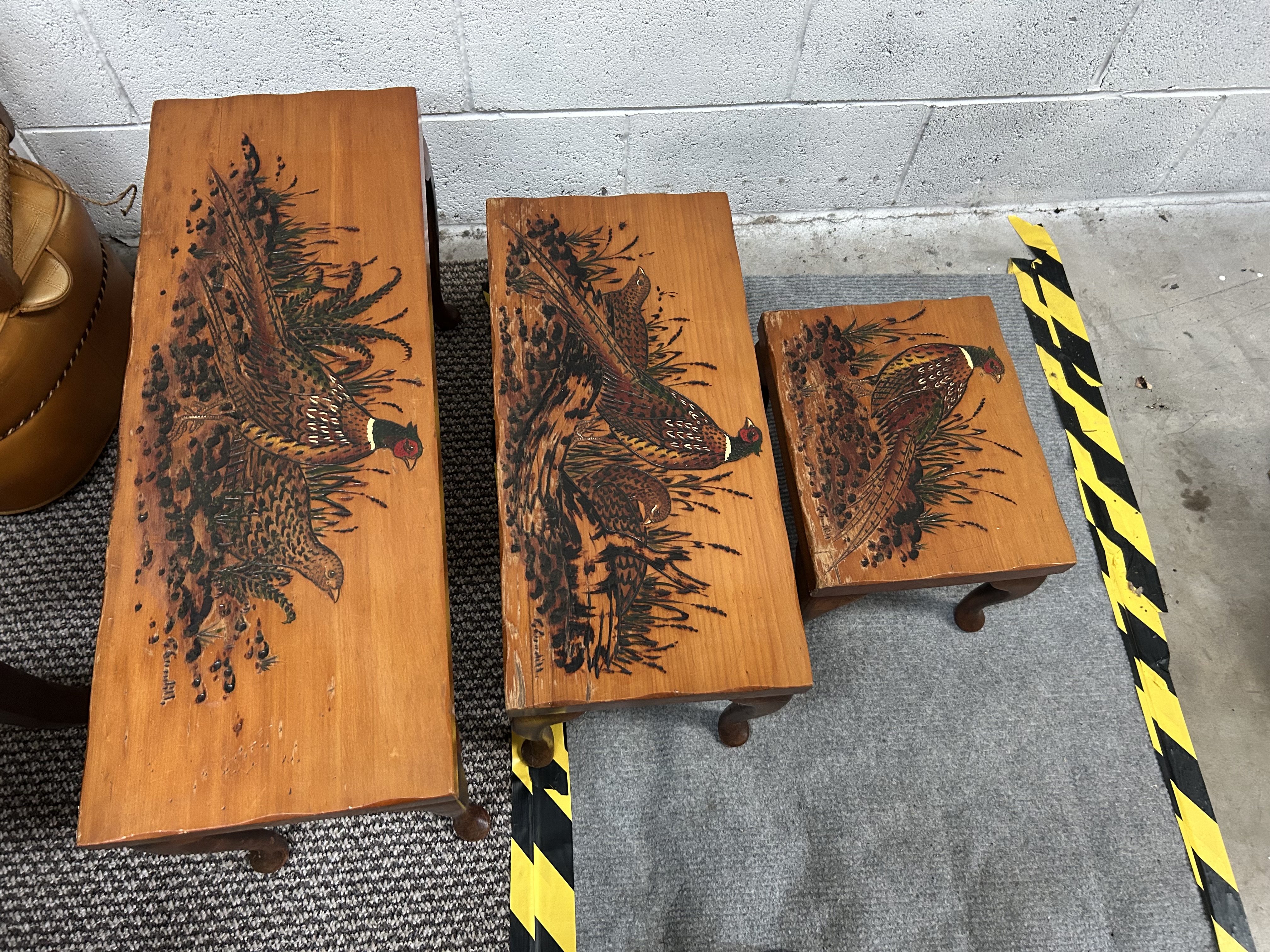A trio of graduated nesting tables featuring hand-decorated pokerwork designs by George Cundill. Each rectangular tabletop is constructed from honey-toned wood with scalloped edges, supported by dark-stained cabriole legs. The decorative program consists of pyrographic scenes depicting pheasants in natural landscapes with hand-painted accents. Each table is signed G. Cundill in the lower-left corner of the illustration.