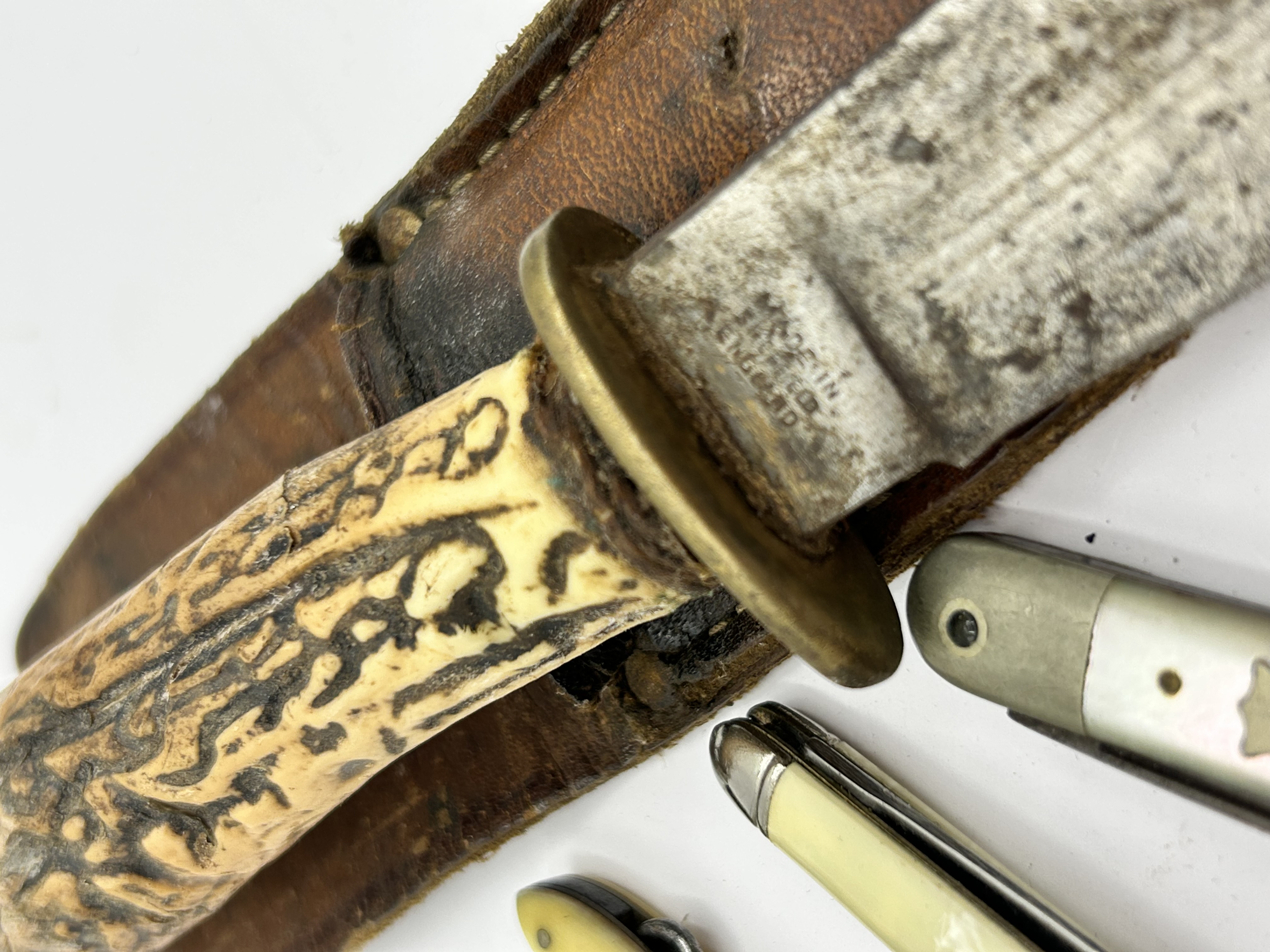 A collection of knives featuring a vintage fixed-blade hunting knife and several folding pocket knives. The hunting knife is constructed with a textured stag horn handle, a brass crossguard, and a steel blade. The ricasso is stamped MADE IN SHEFFIELD ENGLAND. This knife is paired with a weathered brown leather sheath. The assortment of folding pocket knives includes examples with mother-of-pearl, bone or synthetic cream-colored, and yellow scales. The largest folding knife includes a decorative metal shield inlay and metal bolsters.