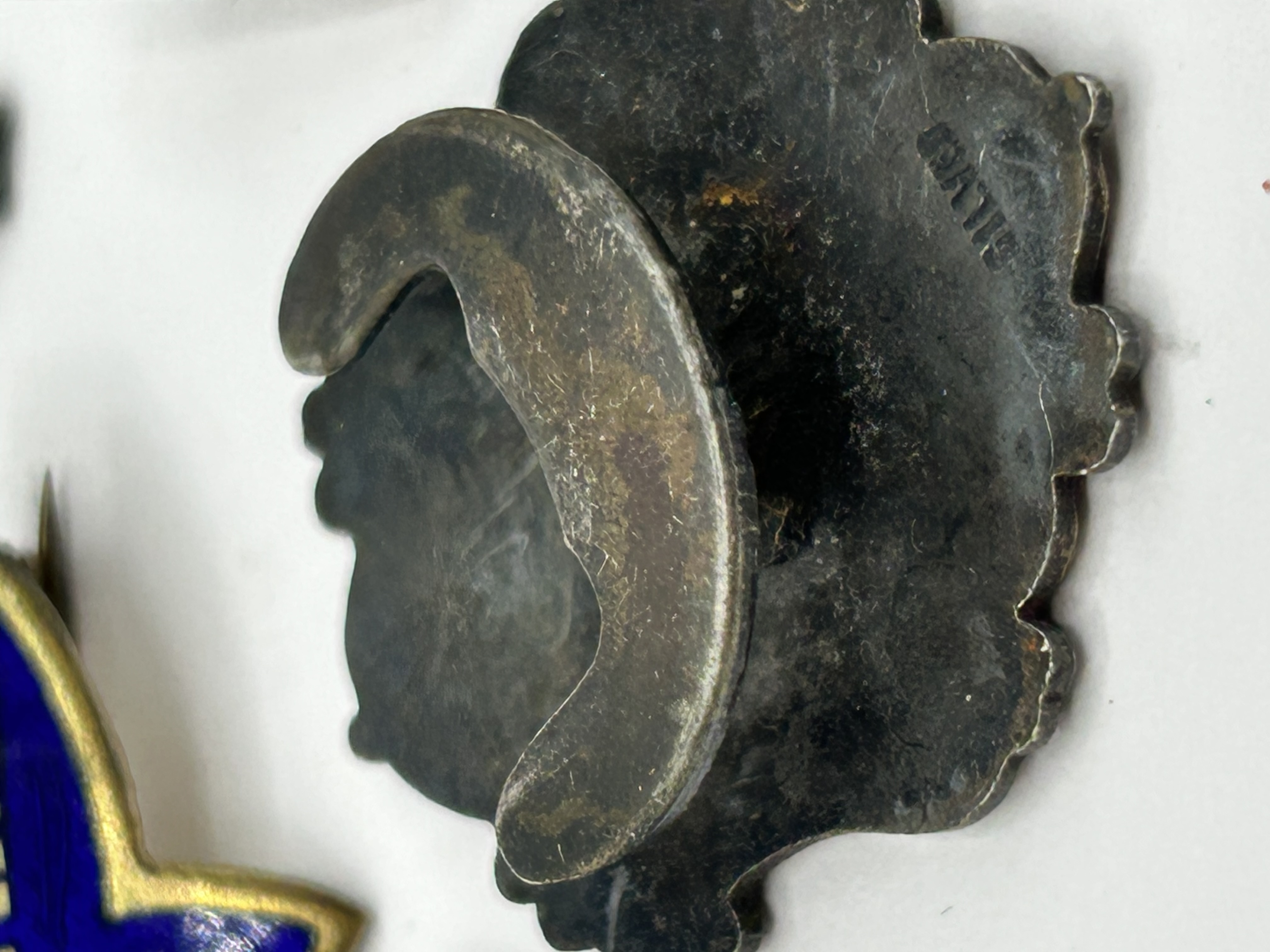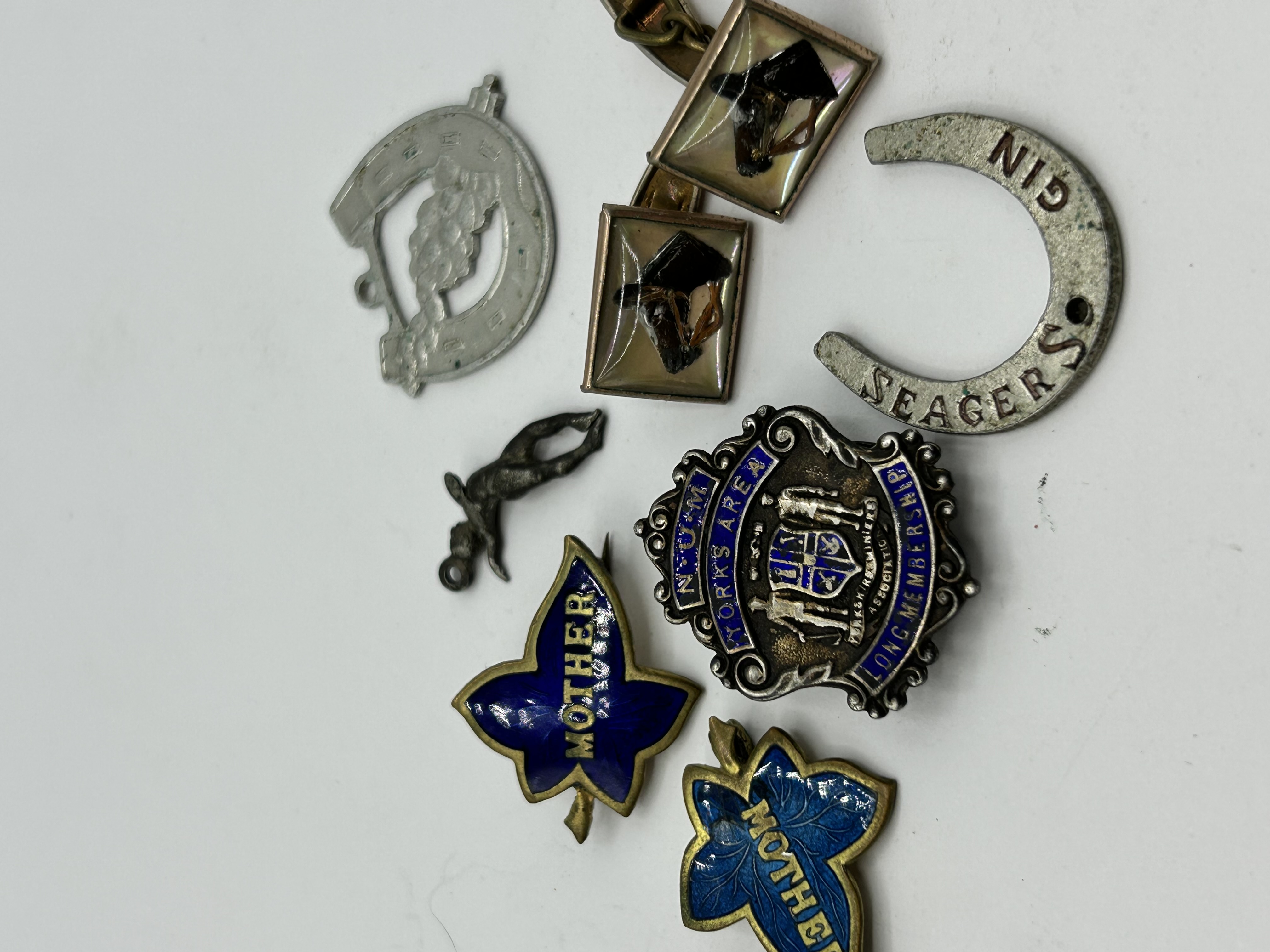 An assortment of vintage metal items featuring a National Union of Mineworkers (N.U.M.) Yorkshire Area Long Membership badge. The badge is constructed from silver with blue enamel detailing and is stamped SILVER on the reverse. The collection also includes several blue enamel leaf-shaped pins inscribed MOTHER, a pair of square cufflinks containing insect specimens under glass, and a horseshoe-shaped metal piece with SEAGERS GIN lettering. Additional items consist of a horseshoe-themed charm and a small figure in a diving pose. The objects are fashioned from various base and precious metals.