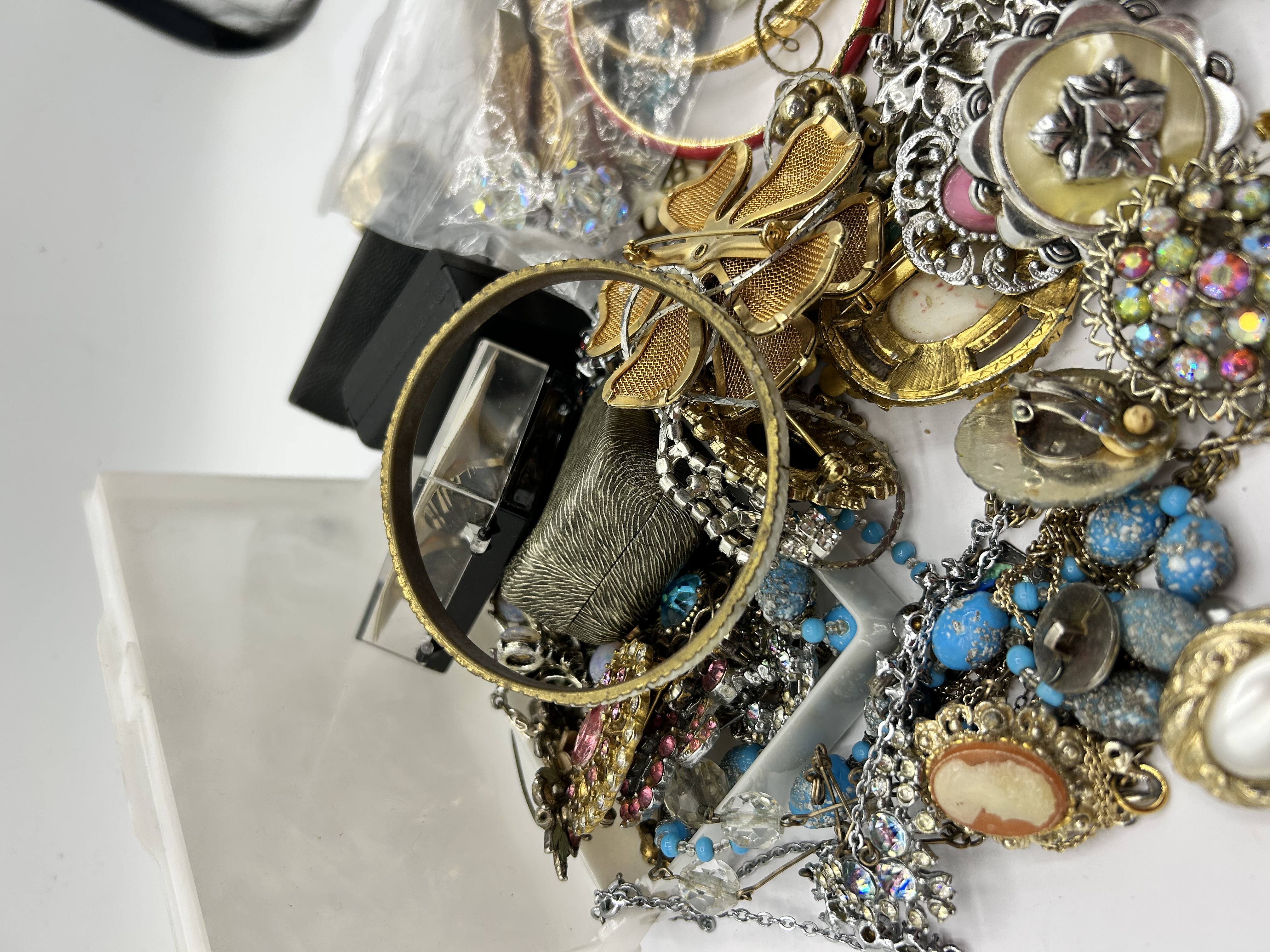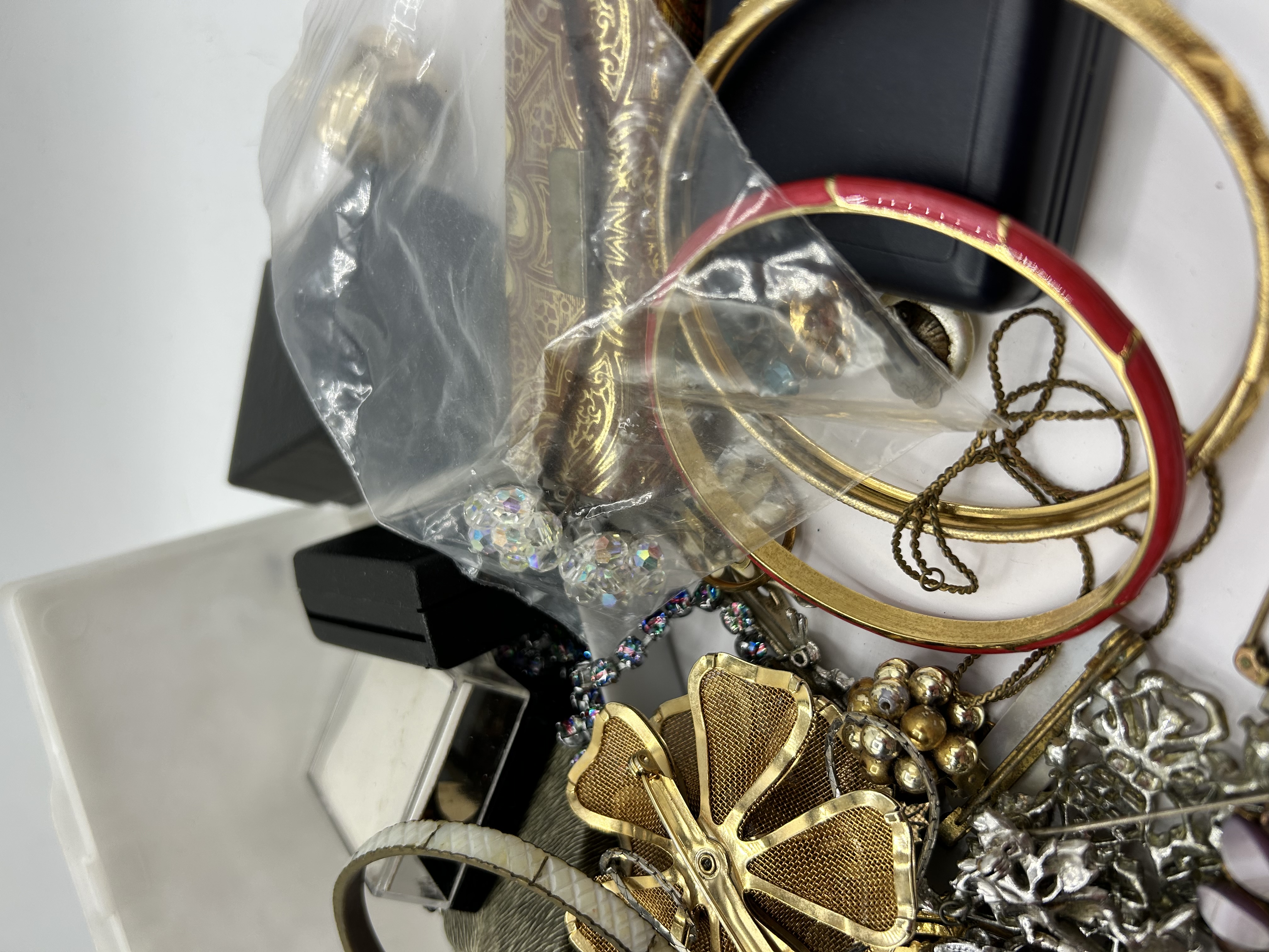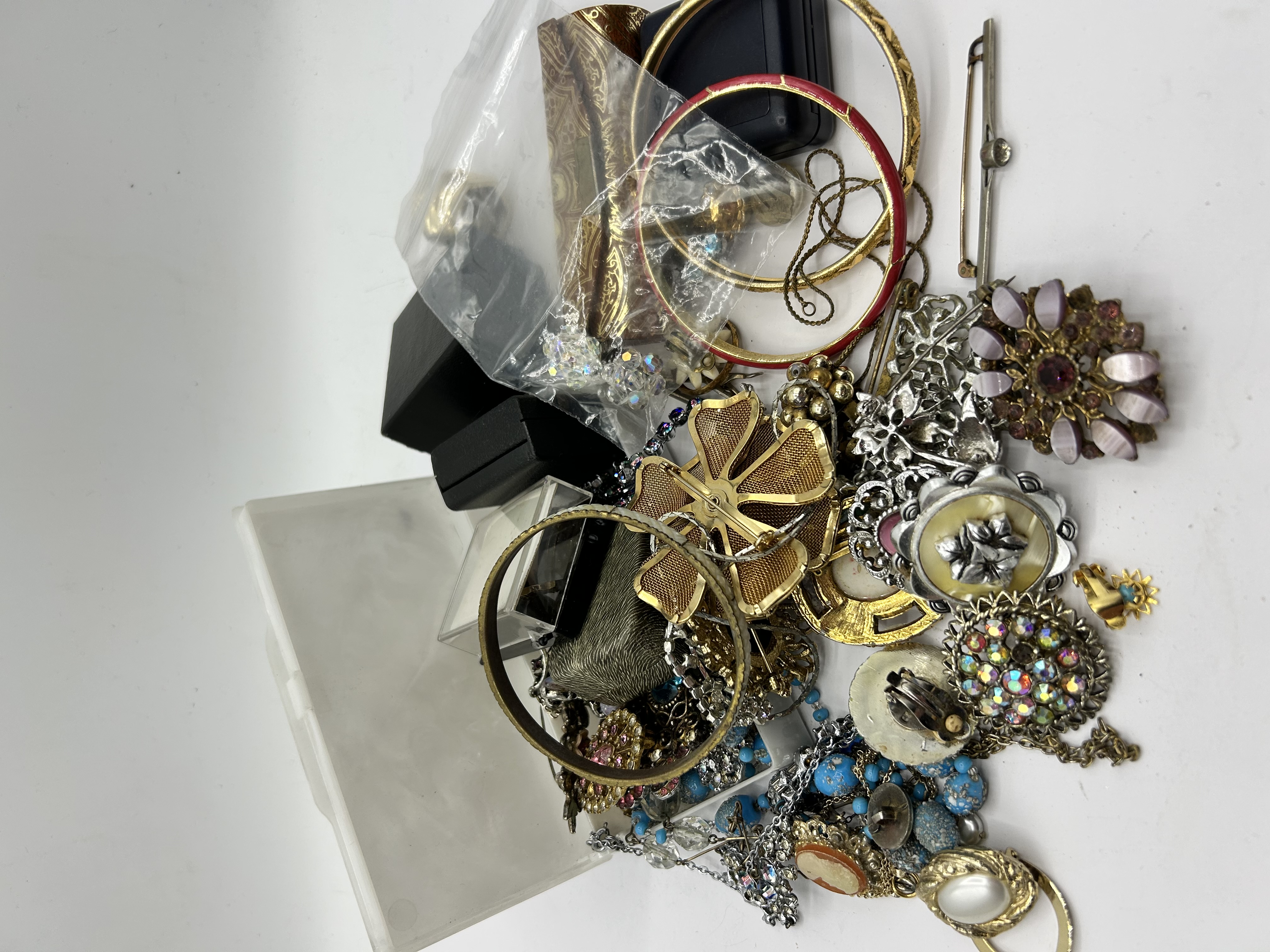 A collection of vintage and contemporary costume jewelry and accessories. The group includes various brooches, necklaces, bangles, and earrings. Notable pieces feature gold-tone mesh floral designs, iridescent aurora borealis rhinestones, and faux-cameo motifs. The assortment also contains beaded necklaces in blue and white tones, as well as enameled and textured metal bangles. Materials primarily consist of base metals, glass, and plastic. The lot is accompanied by several black jewelry presentation boxes and clear protective sleeves, all contained within a white plastic tray.